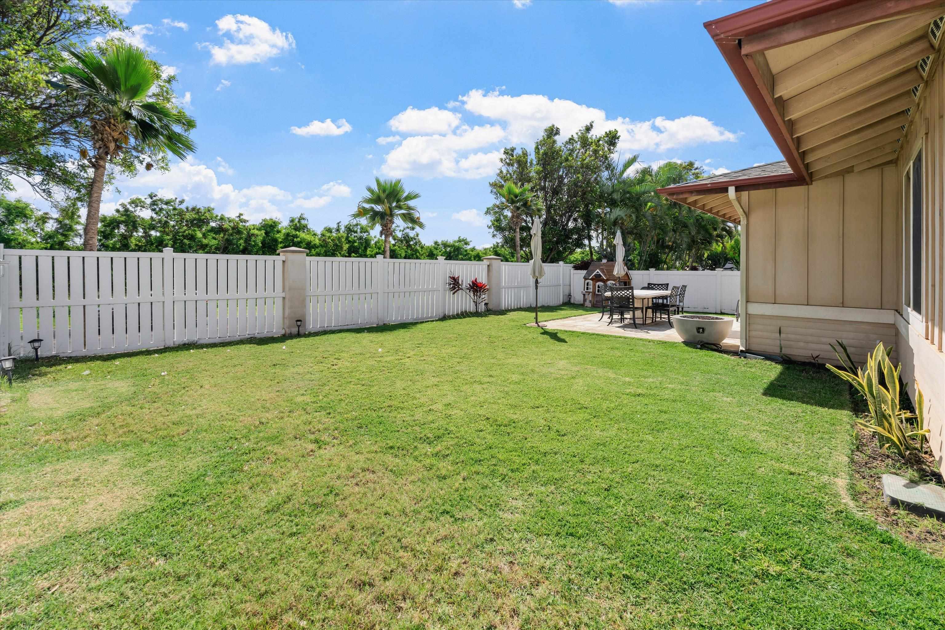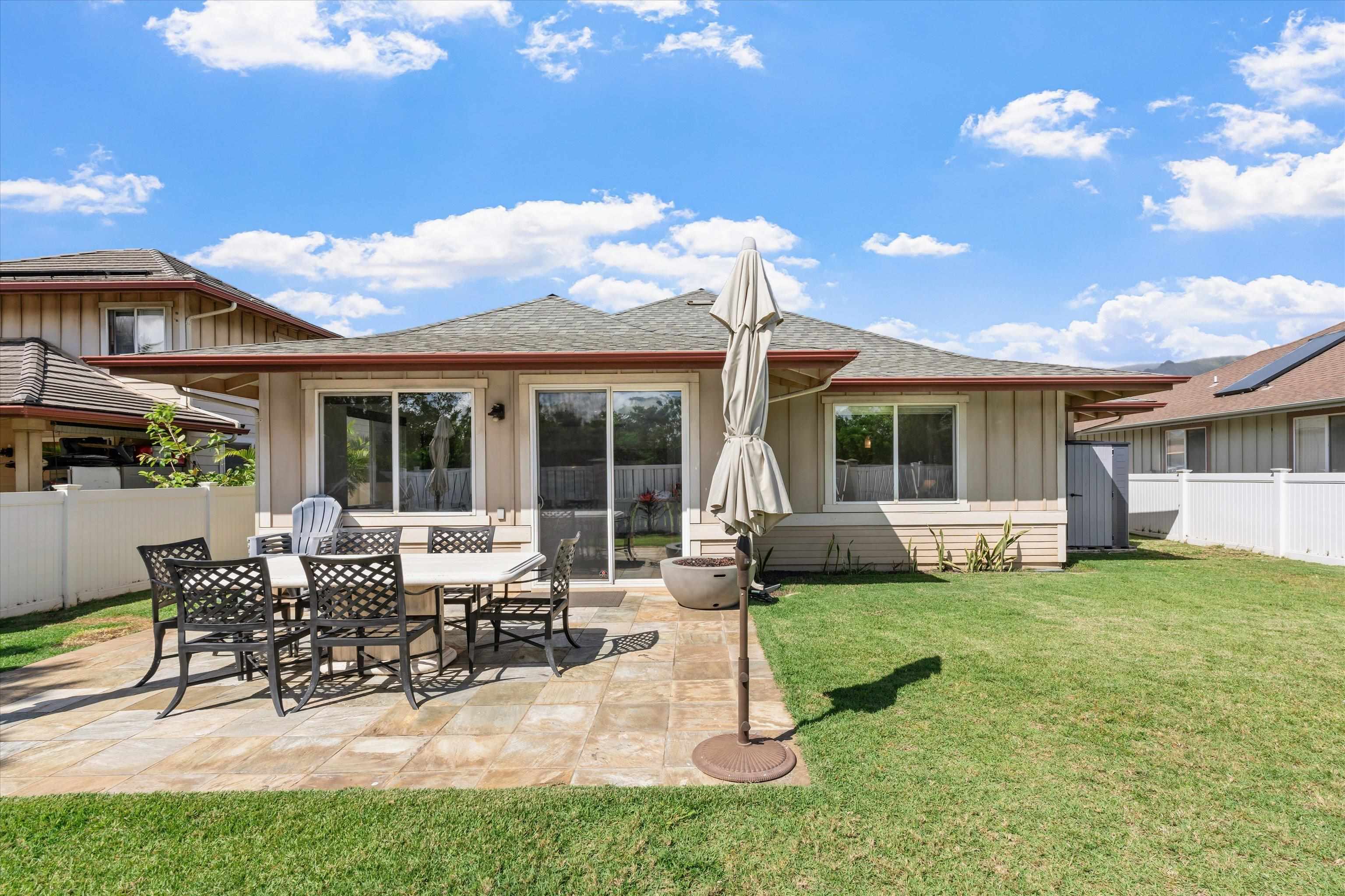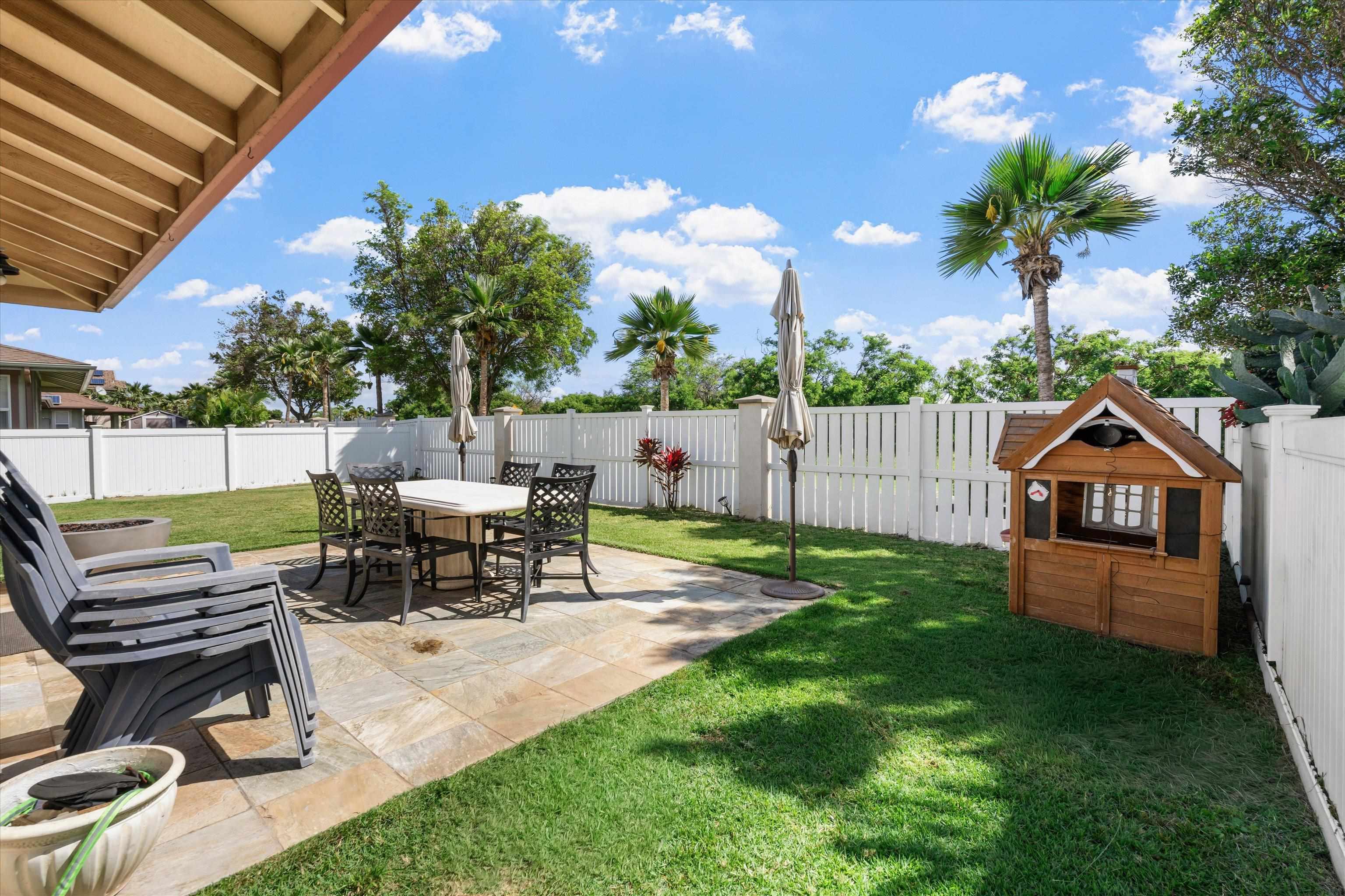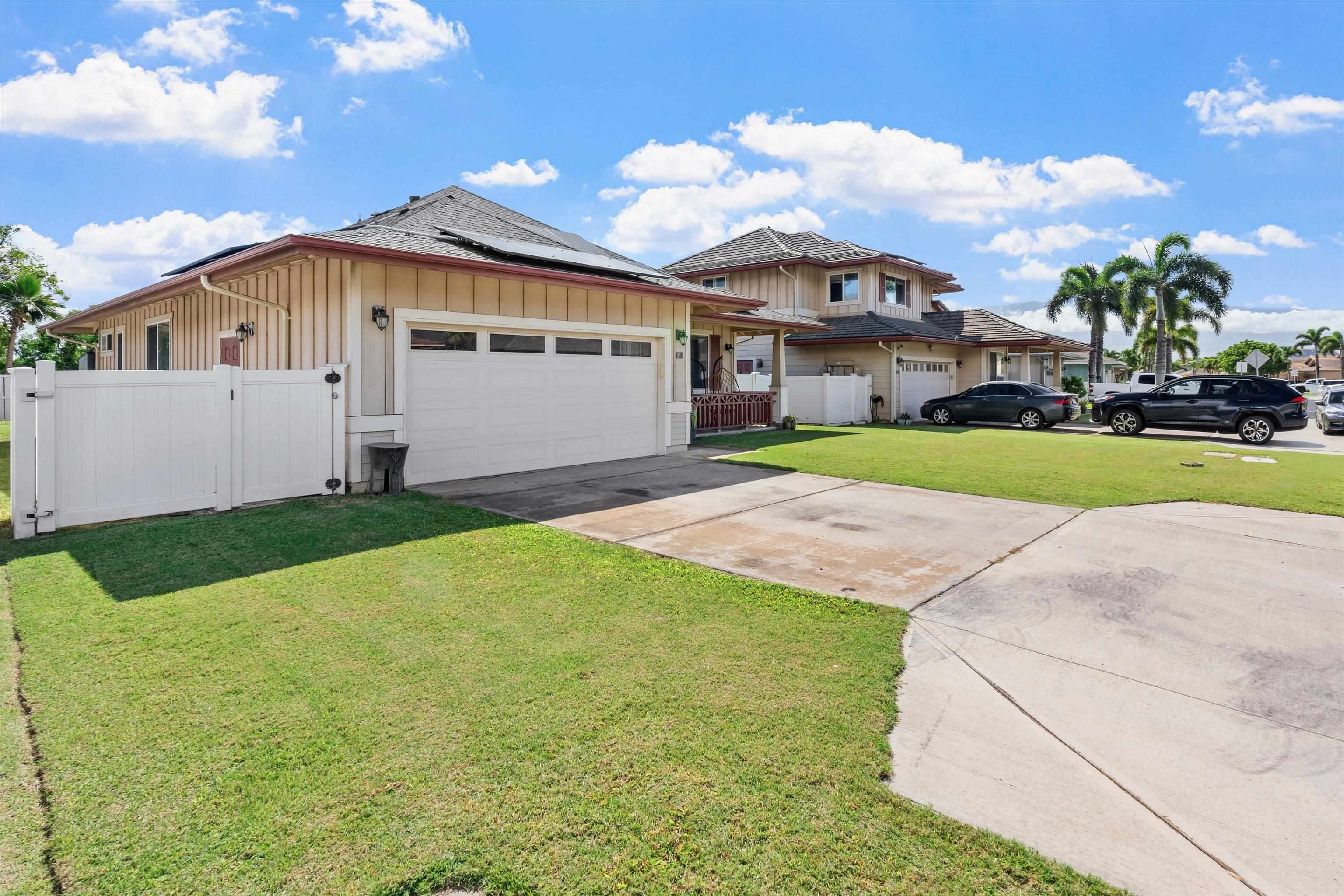 Nestled in the highly sought-after Na Hoku at Maui Lani community, this home is located within the award-winning Pomaika'i School District-long regarded as a top choice for families. Just a short stroll away, the Central Maui Regional Sports Complex offers expansive parks, athletic fields, and recreational amenities that contribute to a vibrant, family-friendly lifestyle. Also nearby is the neighboring golf course, The Dunes at Maui Lani with a beautiful driving range and 18 hole course. This spacious single-level residence features a true 3-bedroom, 2-bathroom layout with an open-concept design ideal for modern living. The generous primary suite includes a walk-in closet and a beautifully remodeled en-suite bathroom.Vaulted ceilings elevate the main living area, while abundant natural light creates an inviting atmosphere perfect for both everyday comfort and entertaining. Thoughtful upgrades are found throughout the home. Step outside to enjoy a fully fenced yard with an irrigated lawn-ideal for pets, play, or relaxation. Energy-efficient features include photovoltaic (PV) panels and Tesla batteries, keeping the electric bill remarkably low-approximately $10 per month. A brand-new central air conditioning system was installed in 2025, ensuring year-round comfort.