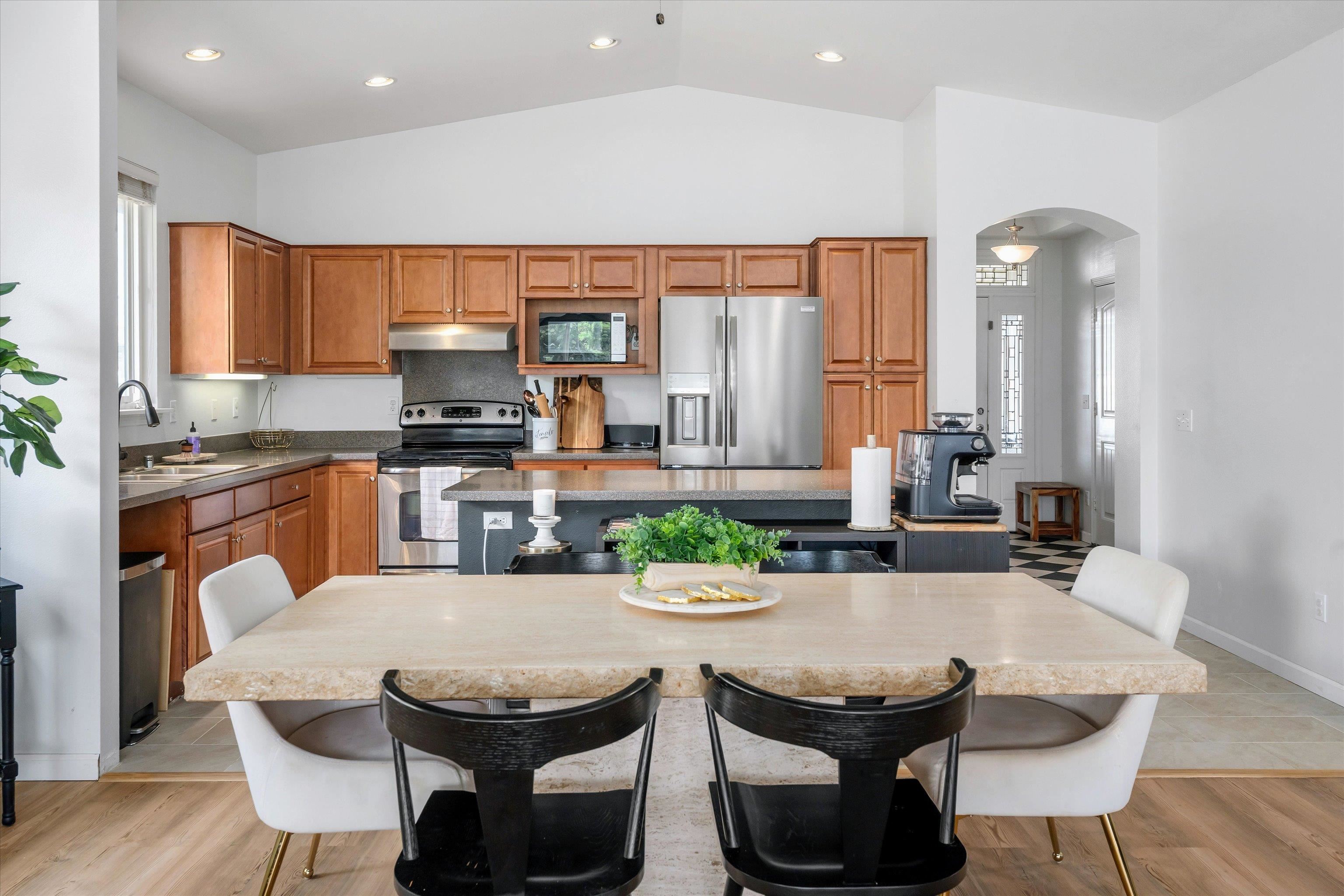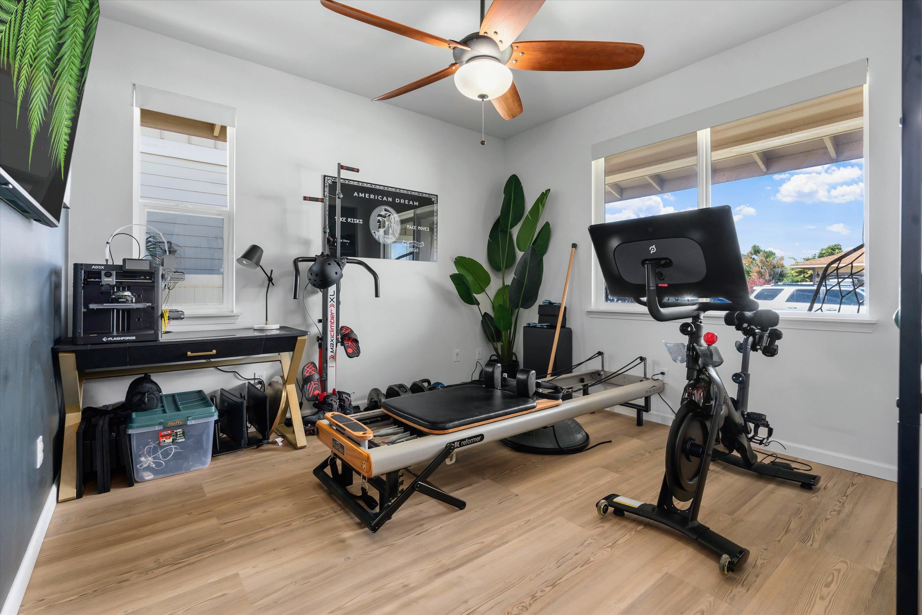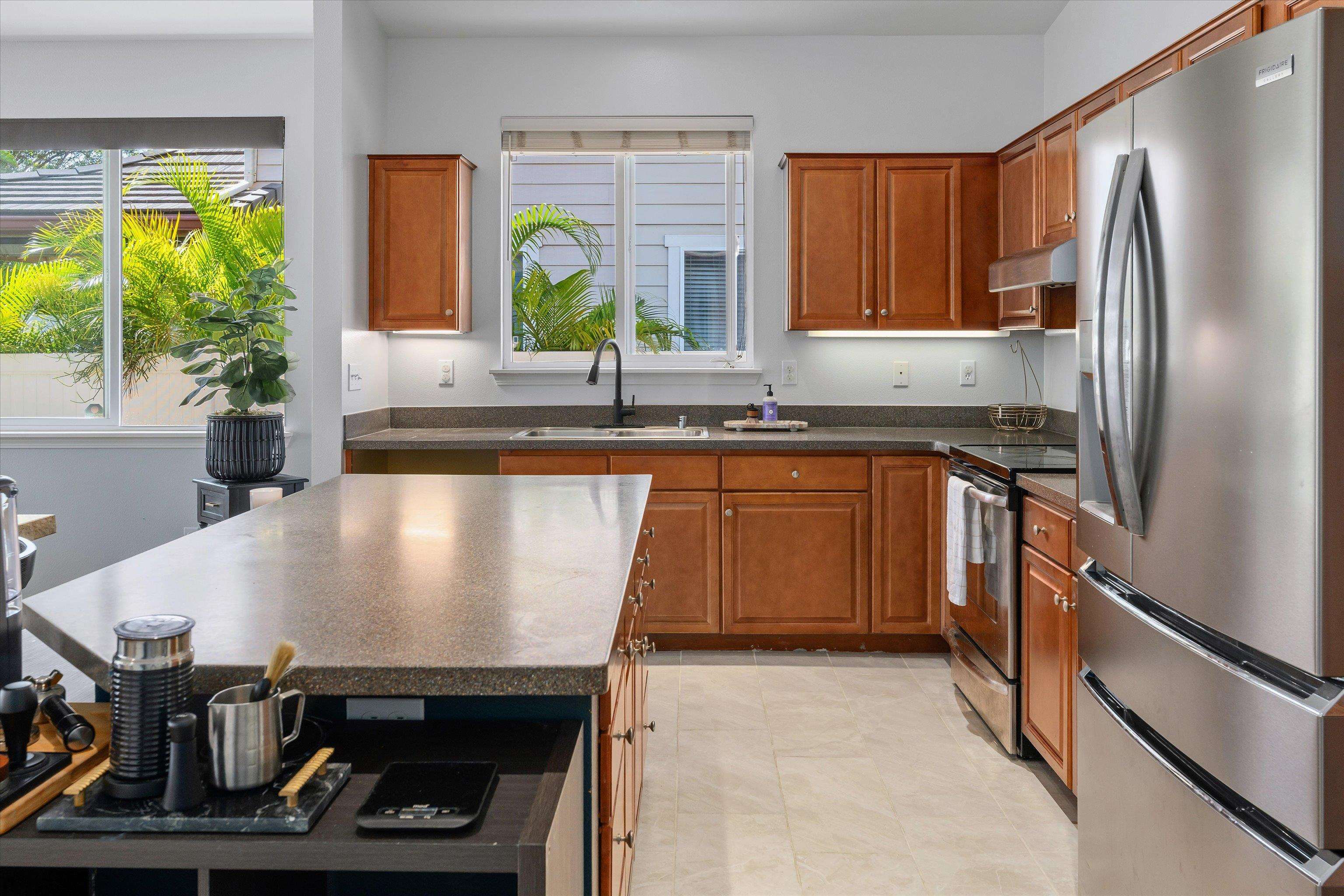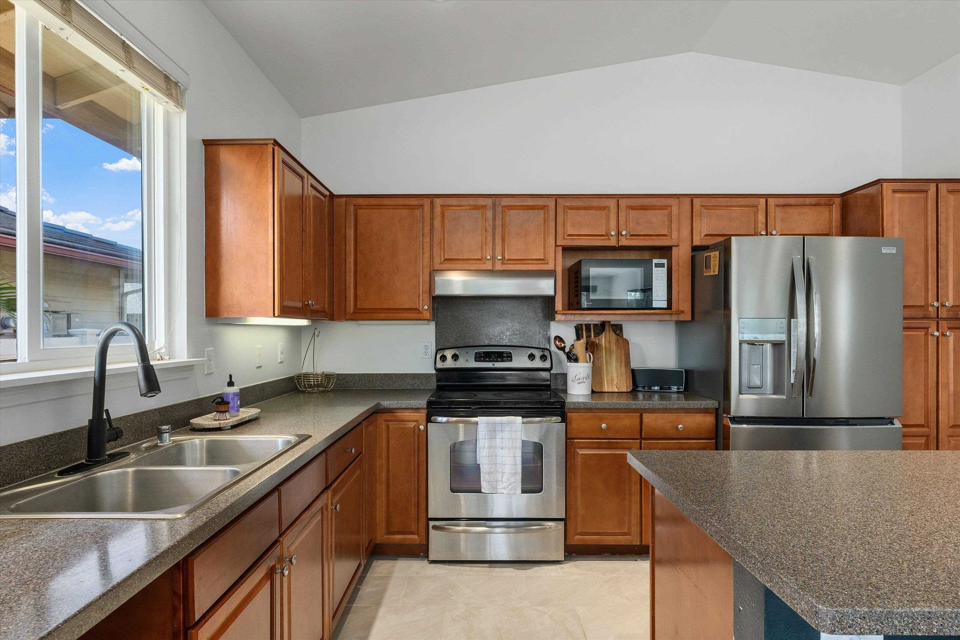 Nestled in the highly sought-after Na Hoku at Maui Lani community, this home is located within the award-winning Pomaika'i School District-long regarded as a top choice for families. Just a short stroll away, the Central Maui Regional Sports Complex offers expansive parks, athletic fields, and recreational amenities that contribute to a vibrant, family-friendly lifestyle. Also nearby is the neighboring golf course, The Dunes at Maui Lani with a beautiful driving range and 18 hole course. This spacious single-level residence features a true 3-bedroom, 2-bathroom layout with an open-concept design ideal for modern living. The generous primary suite includes a walk-in closet and a beautifully remodeled en-suite bathroom.Vaulted ceilings elevate the main living area, while abundant natural light creates an inviting atmosphere perfect for both everyday comfort and entertaining. Thoughtful upgrades are found throughout the home. Step outside to enjoy a fully fenced yard with an irrigated lawn-ideal for pets, play, or relaxation. Energy-efficient features include photovoltaic (PV) panels and Tesla batteries, keeping the electric bill remarkably low-approximately $10 per month. A brand-new central air conditioning system was installed in 2025, ensuring year-round comfort.