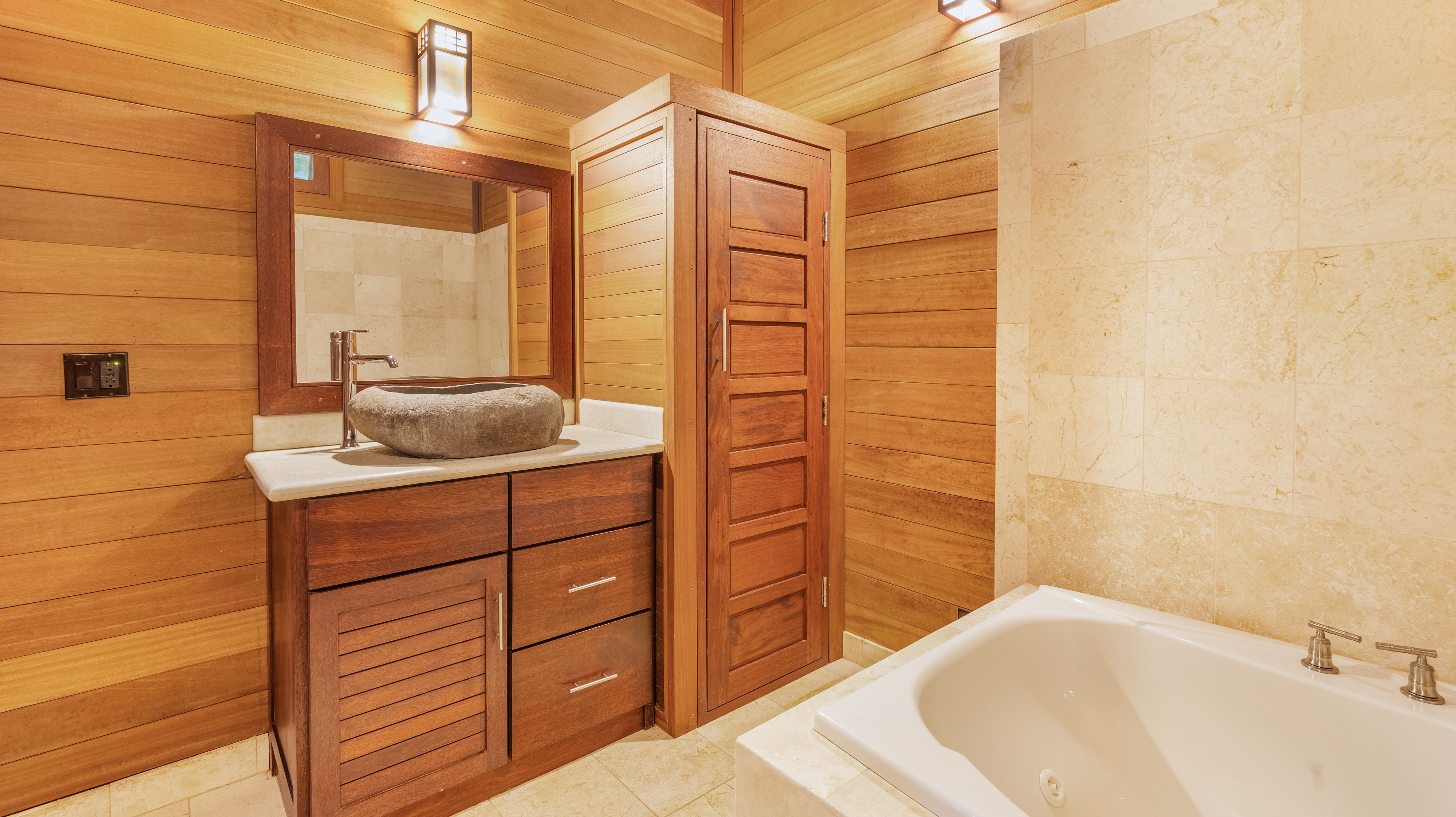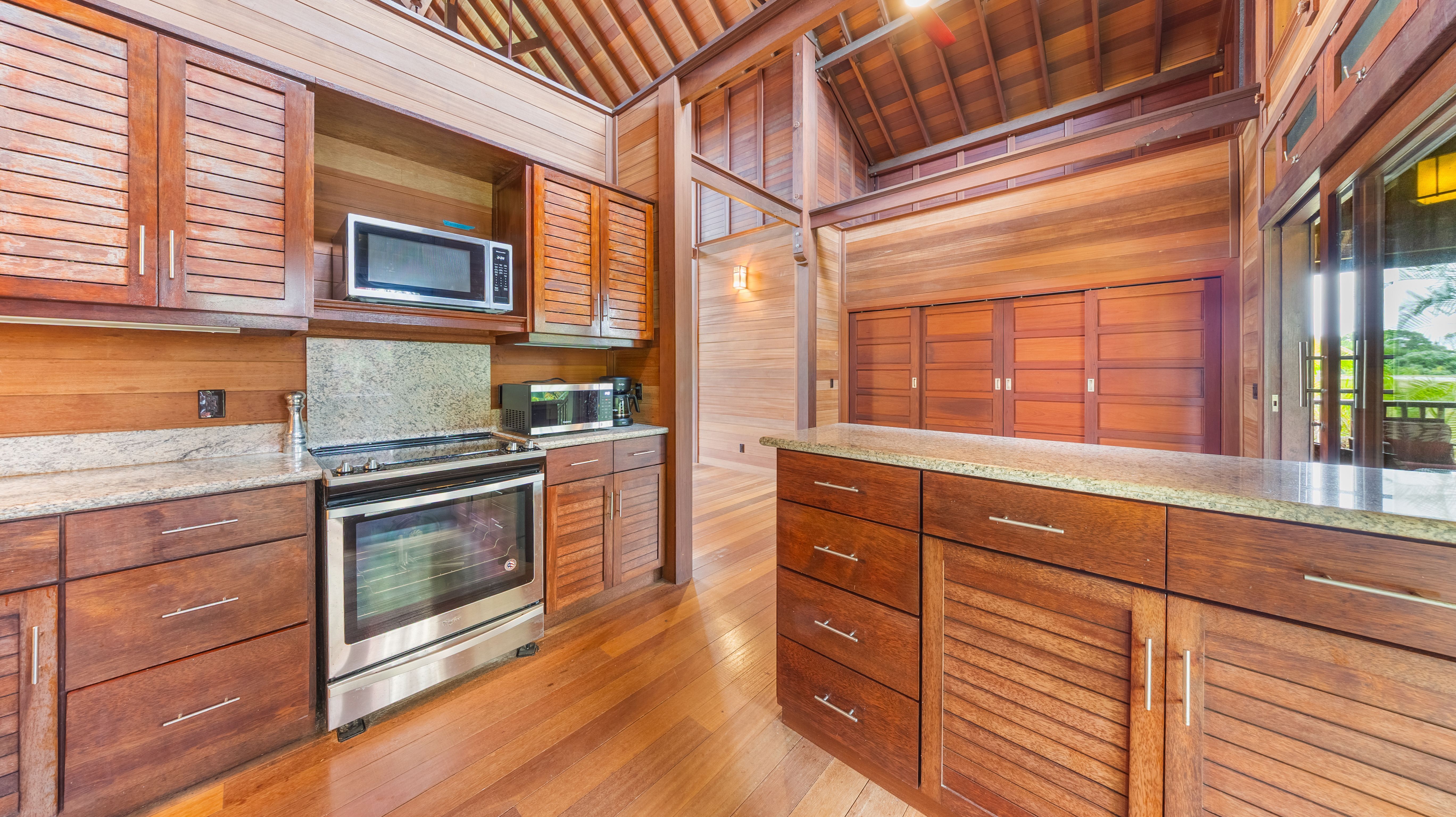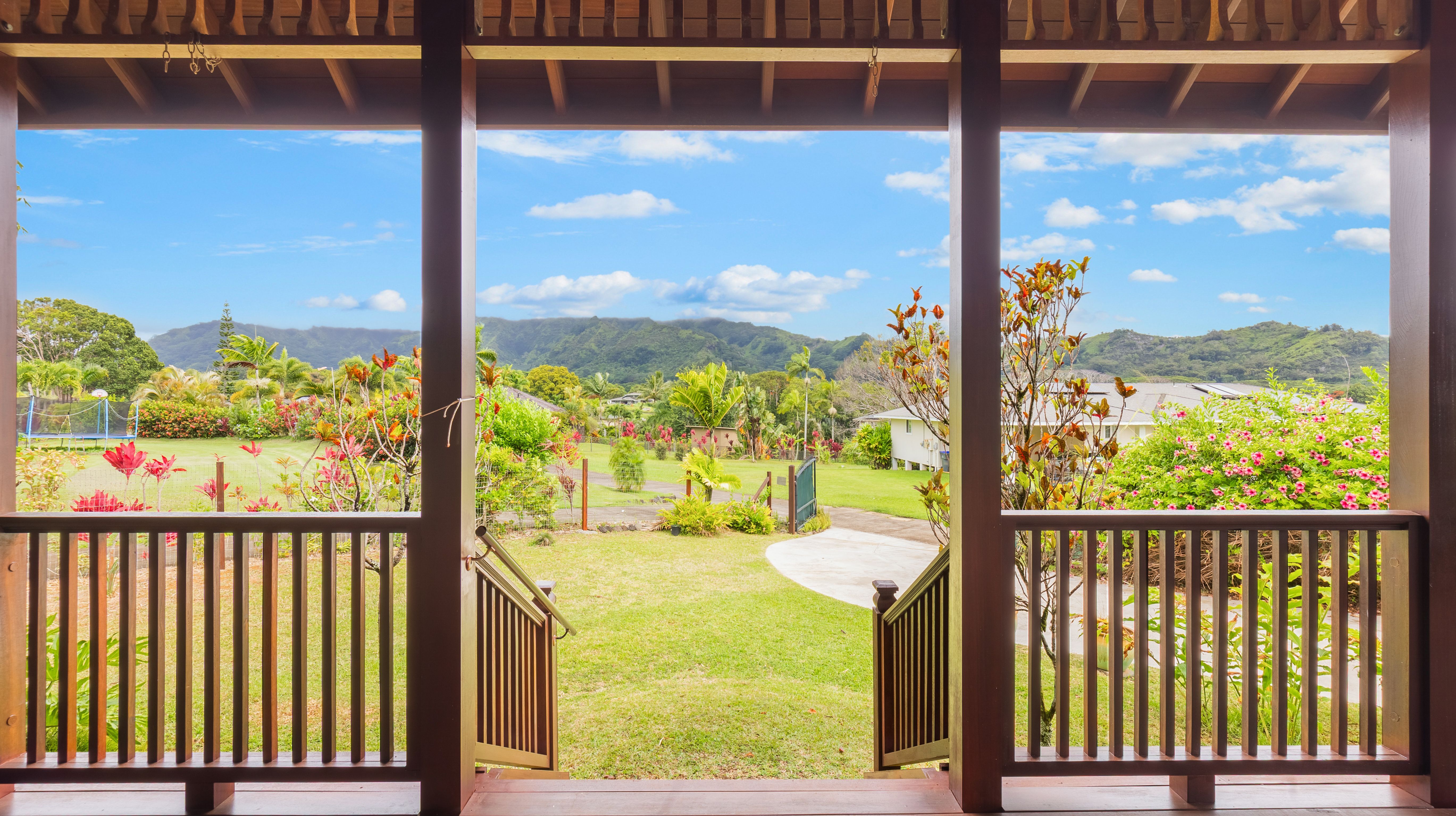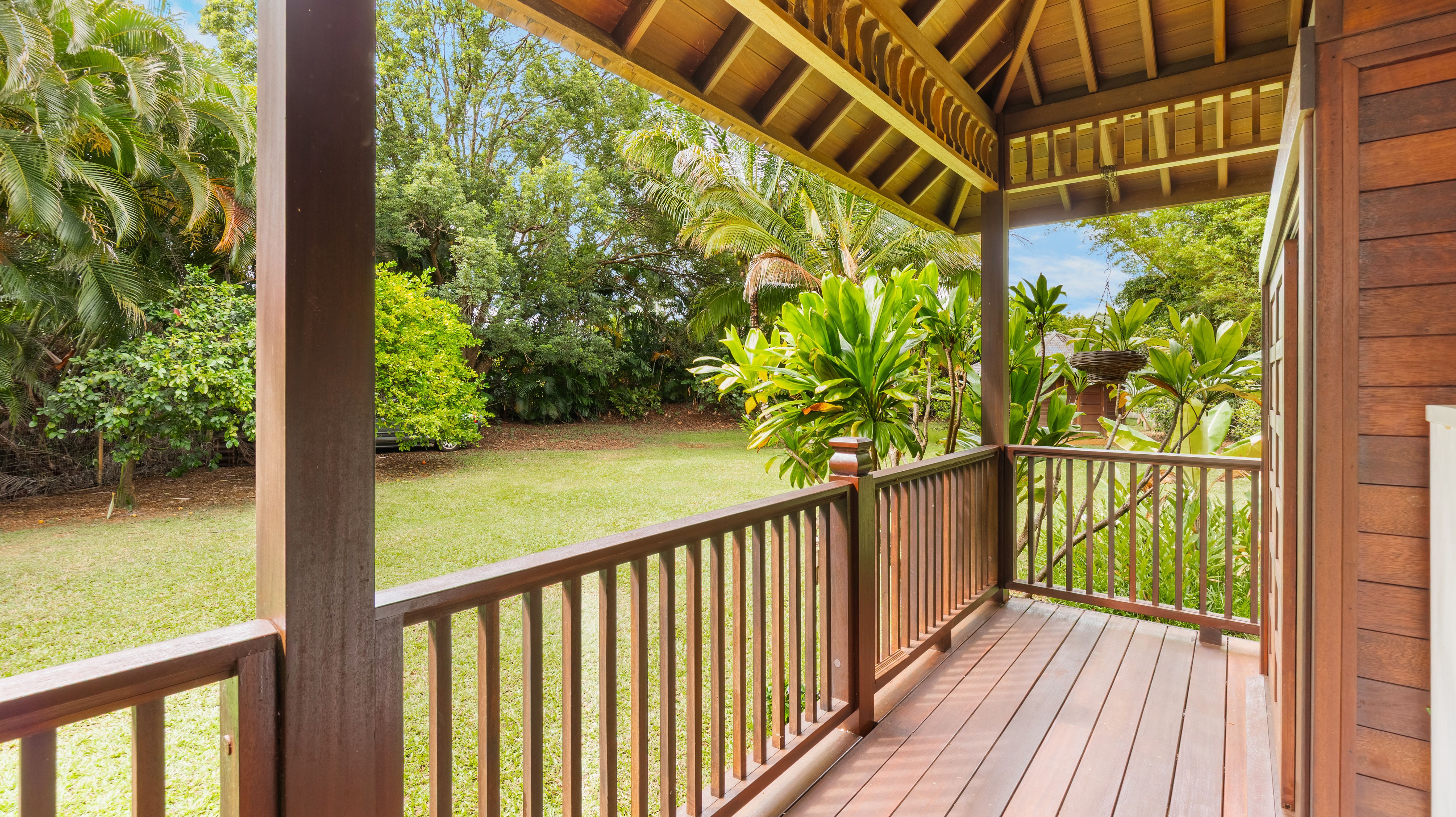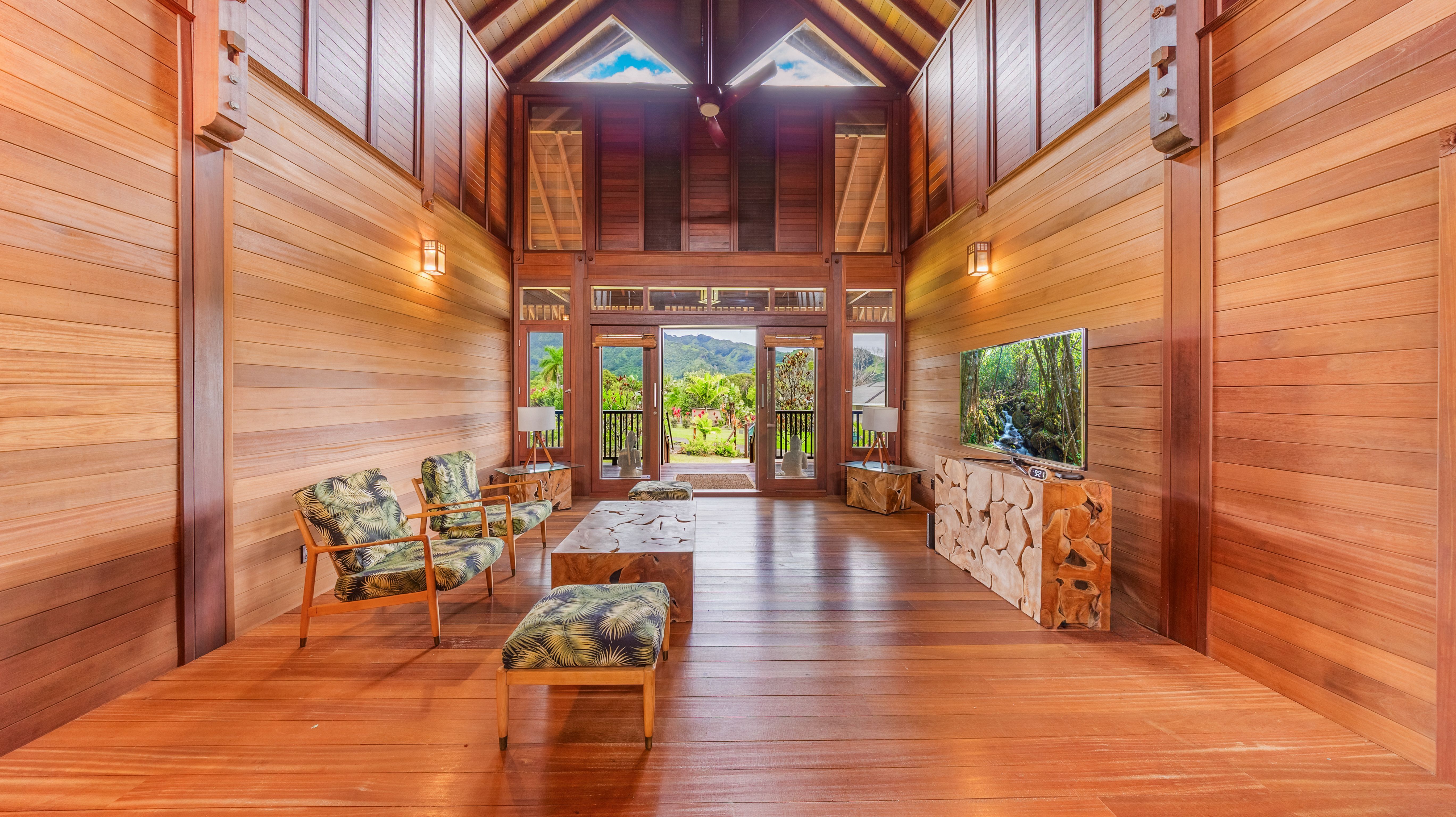 Featuring an Ironwood roof and rich Merbau hardwood throughout most of the home, complemented by natural stone and tile in the baths. Vaulted ceilings and expansive windows frame panoramic mountain views from bedrooms, living room, and the covered lanai.