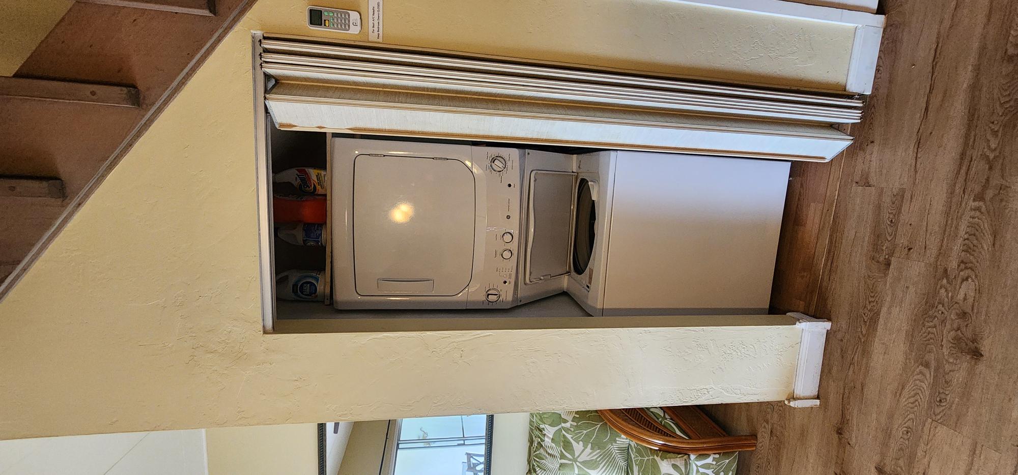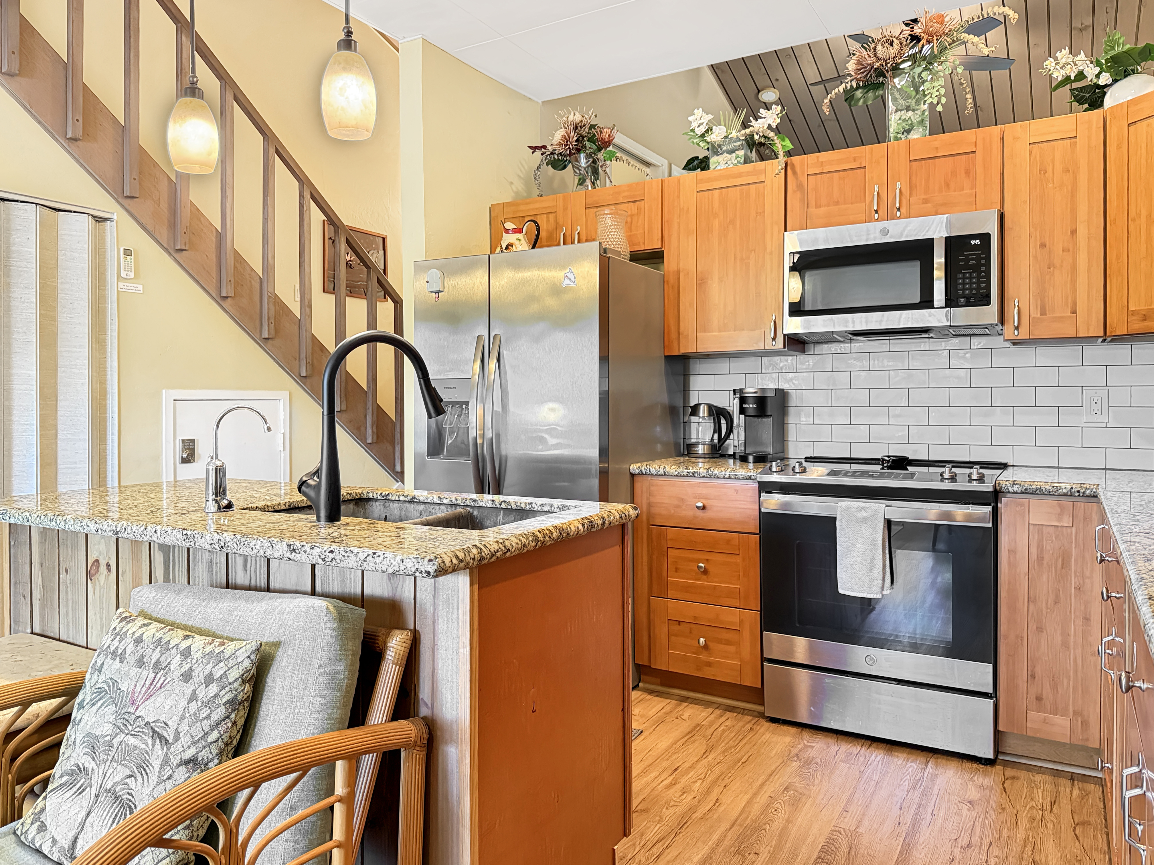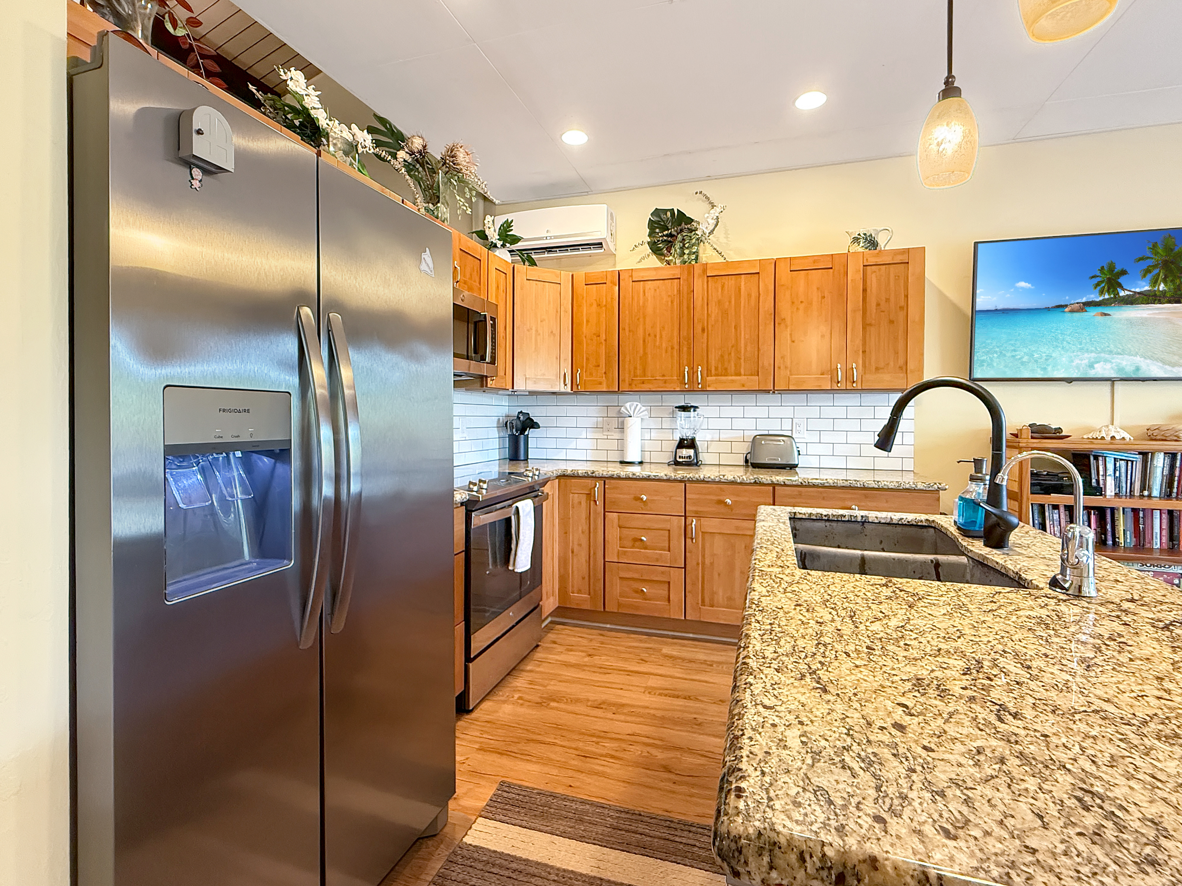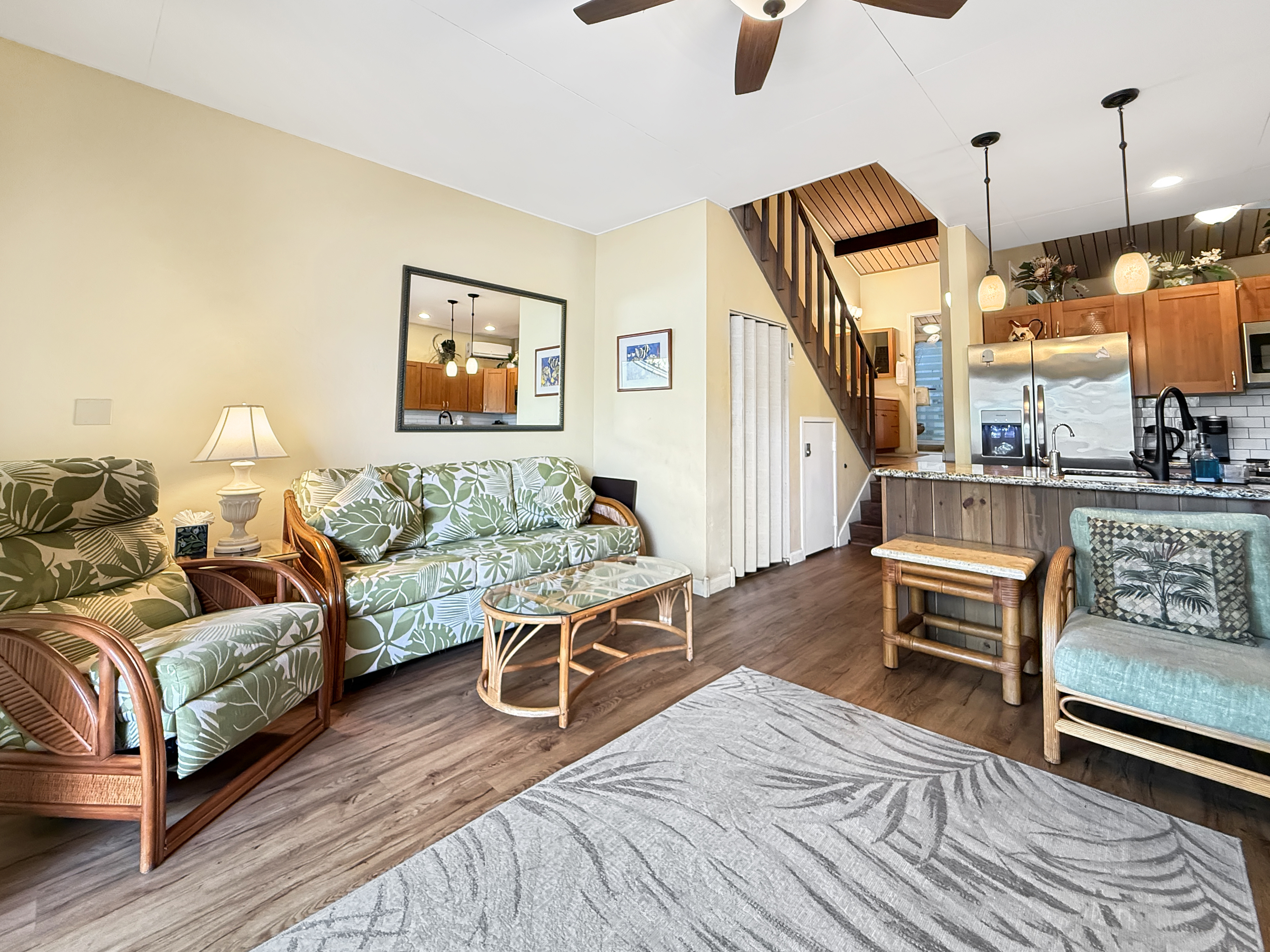 Unit has 2 bedrooms, primary is located on 2nd floor with its own private lanai and primary bath. Two split AC units help keep the air cool during the hot Kona days. Open concept kitchen features granite counters and stainless steel appliances and stack washer and dryer are located off the kitchen area. Guests can utilize the walk in shower and bathroom off a little landing outside the guest bedroom. Wide louvered windows welcome lots of natural light.