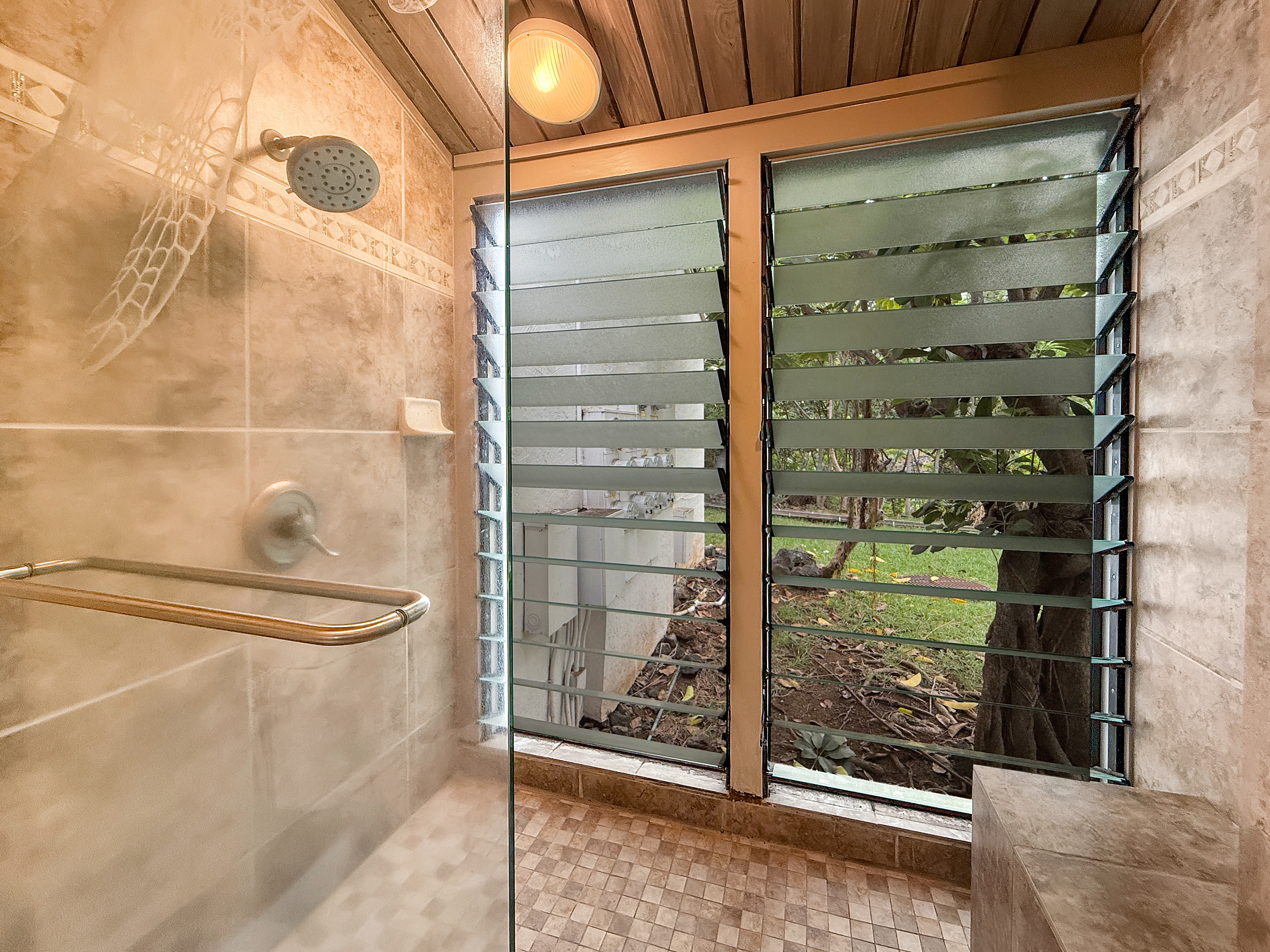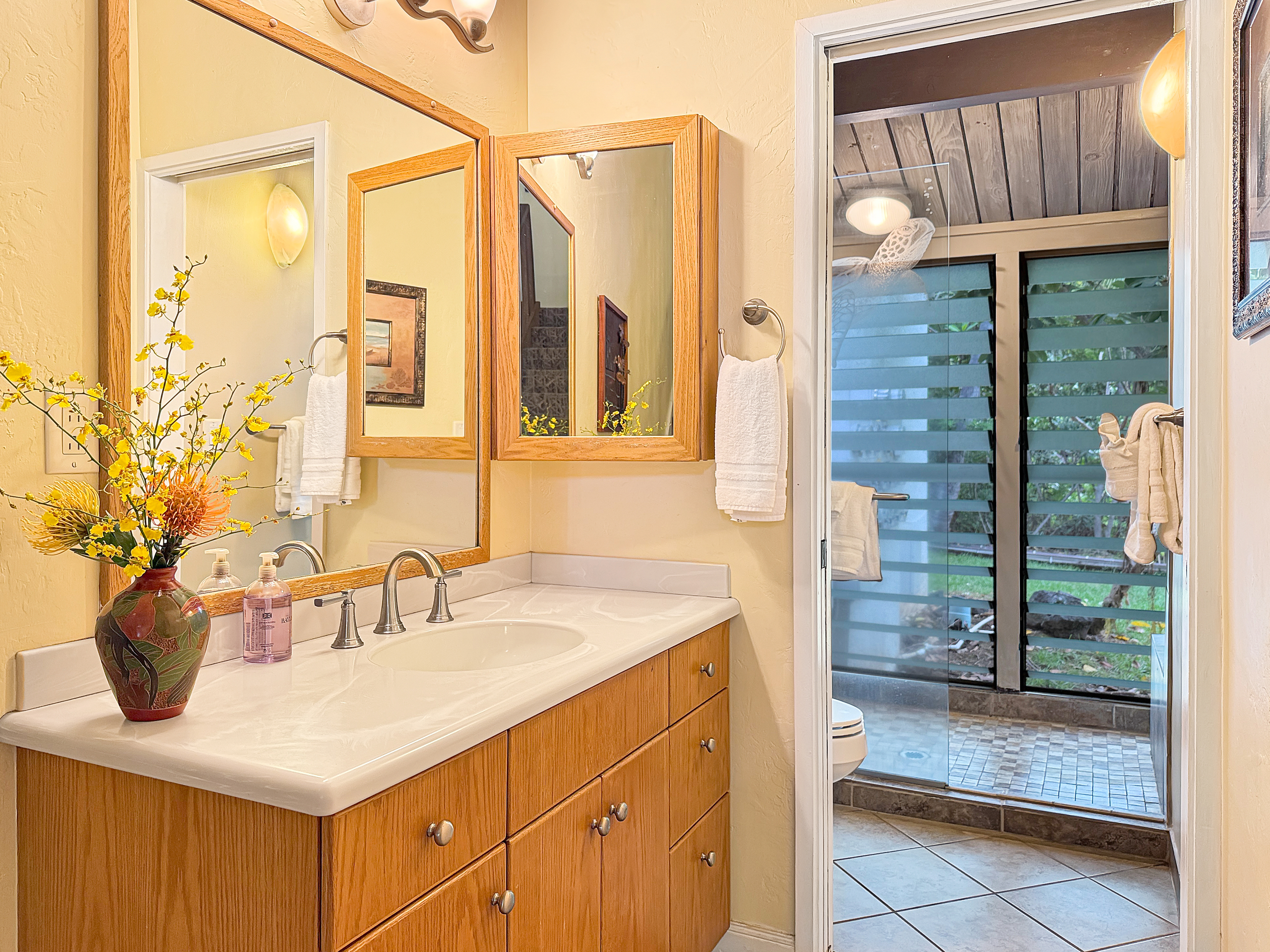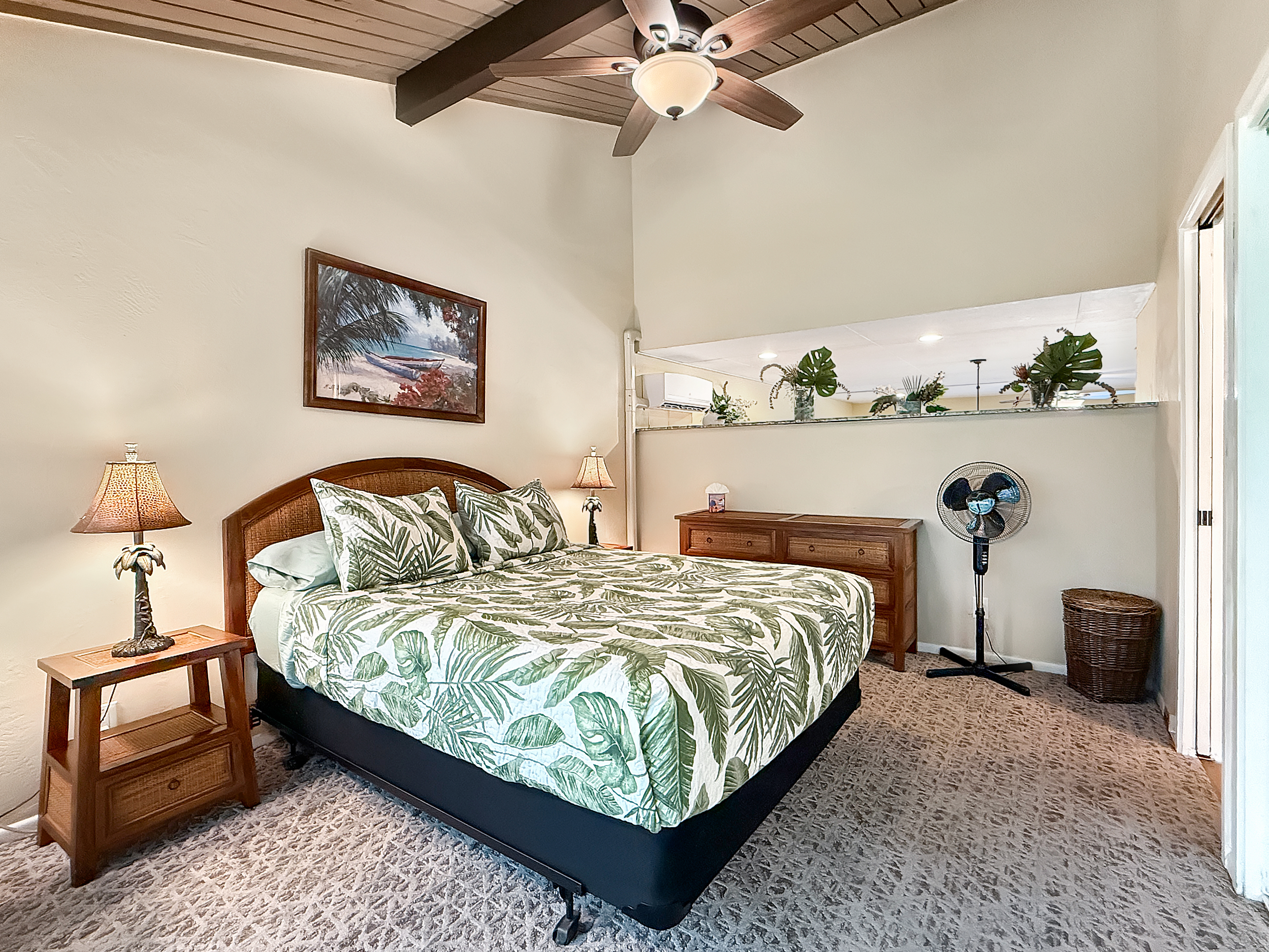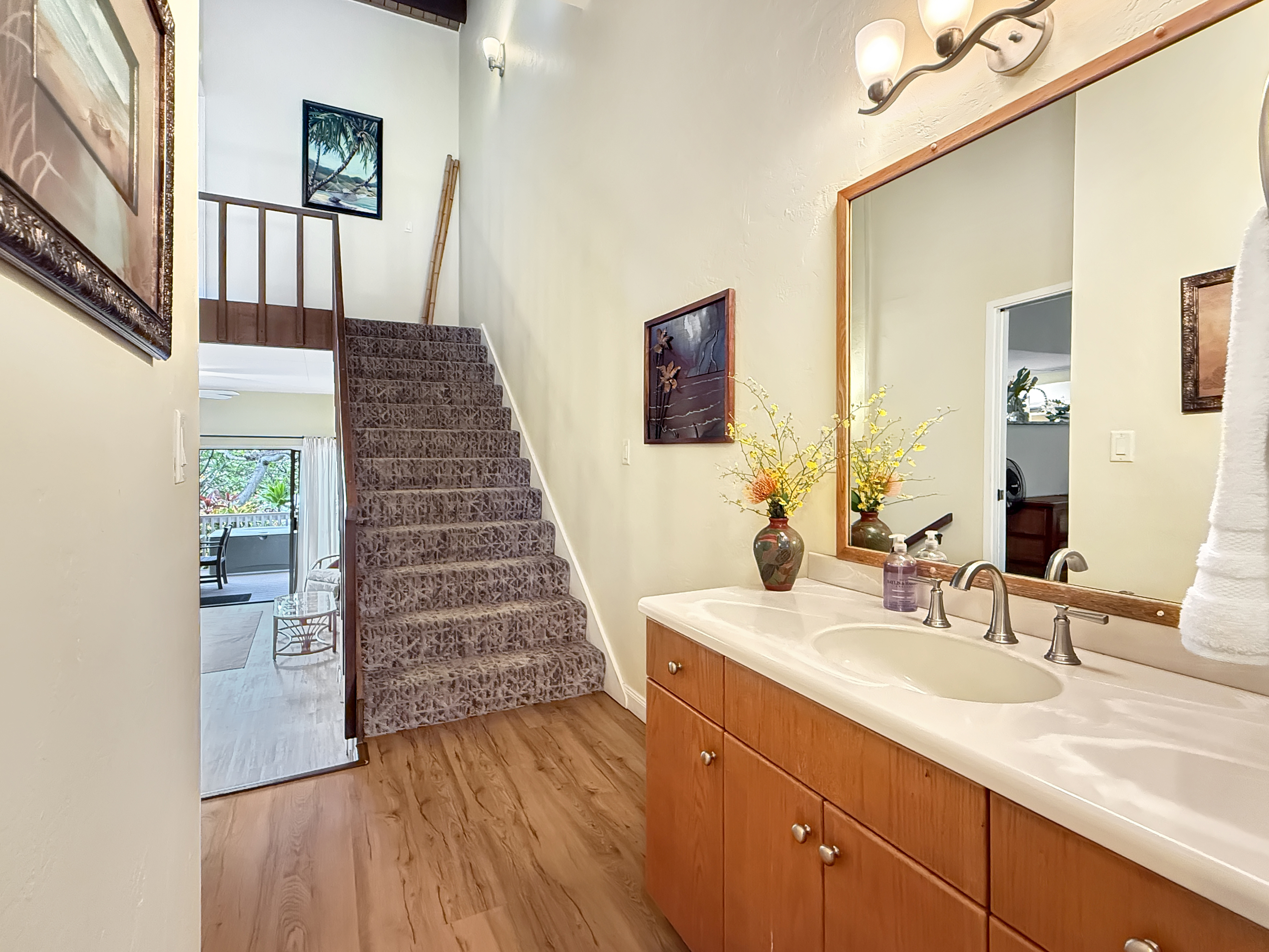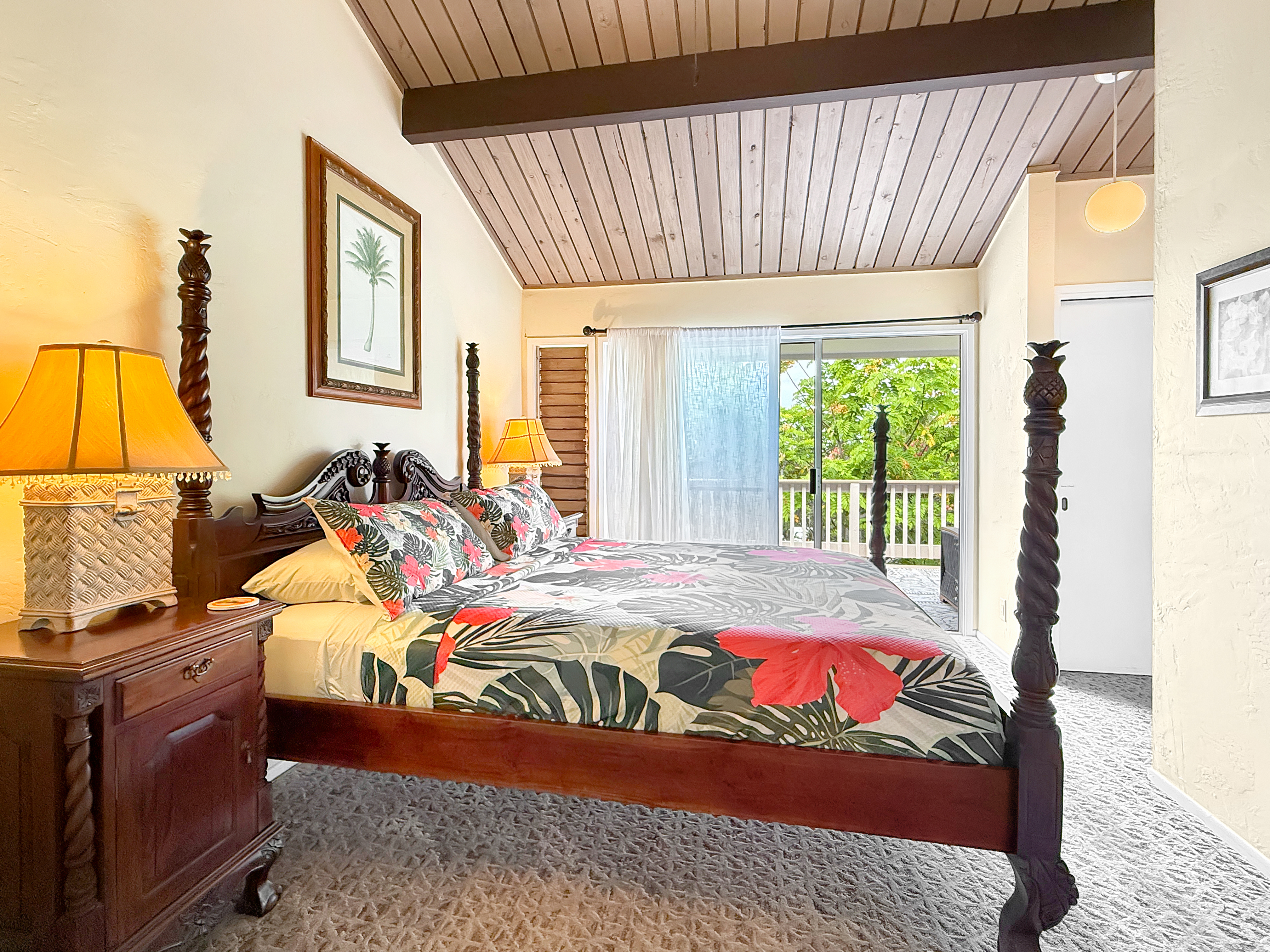 Unit has 2 bedrooms, primary is located on 2nd floor with its own private lanai and primary bath. Two split AC units help keep the air cool during the hot Kona days. Open concept kitchen features granite counters and stainless steel appliances and stack washer and dryer are located off the kitchen area. Guests can utilize the walk in shower and bathroom off a little landing outside the guest bedroom. Wide louvered windows welcome lots of natural light.