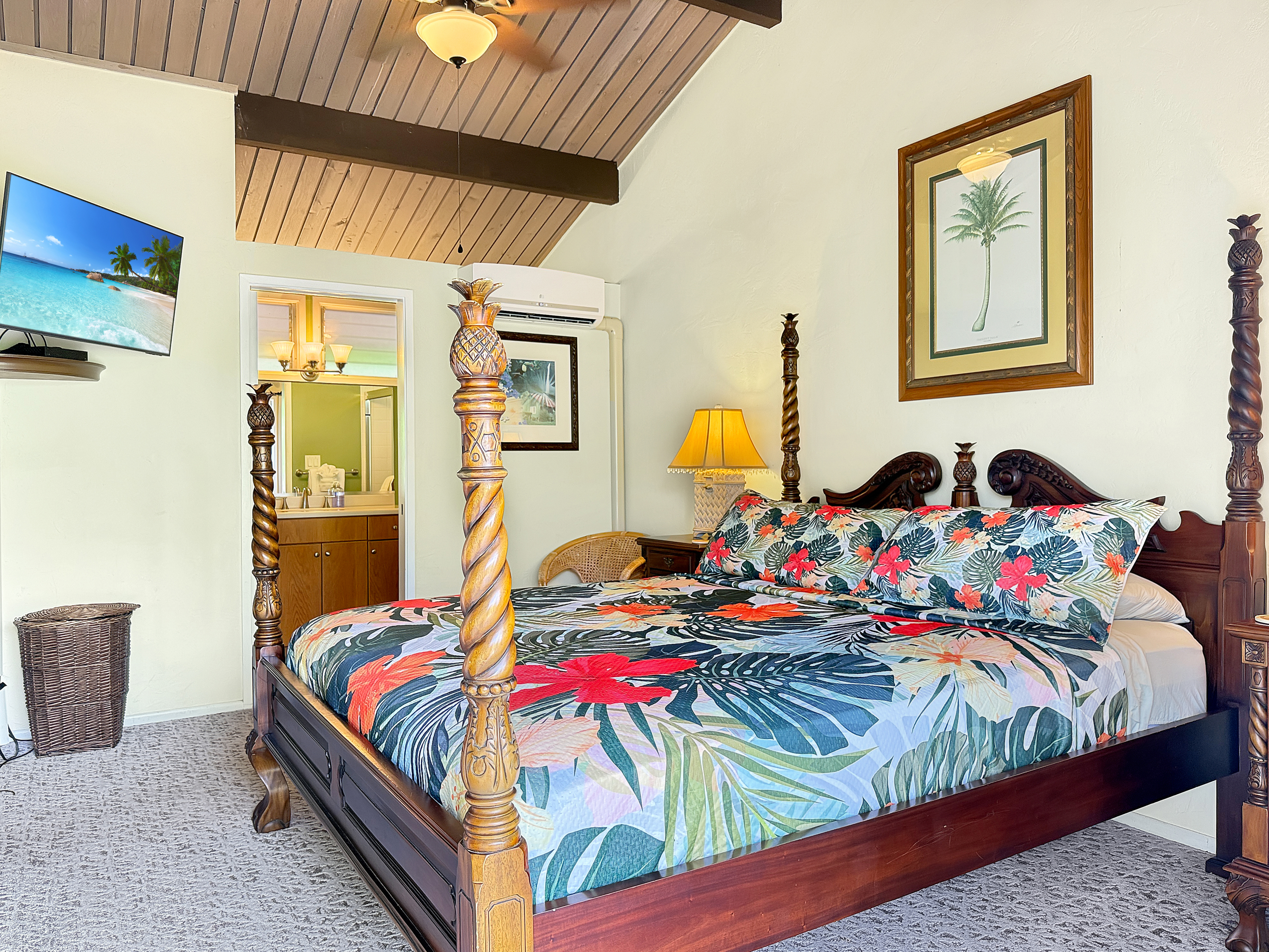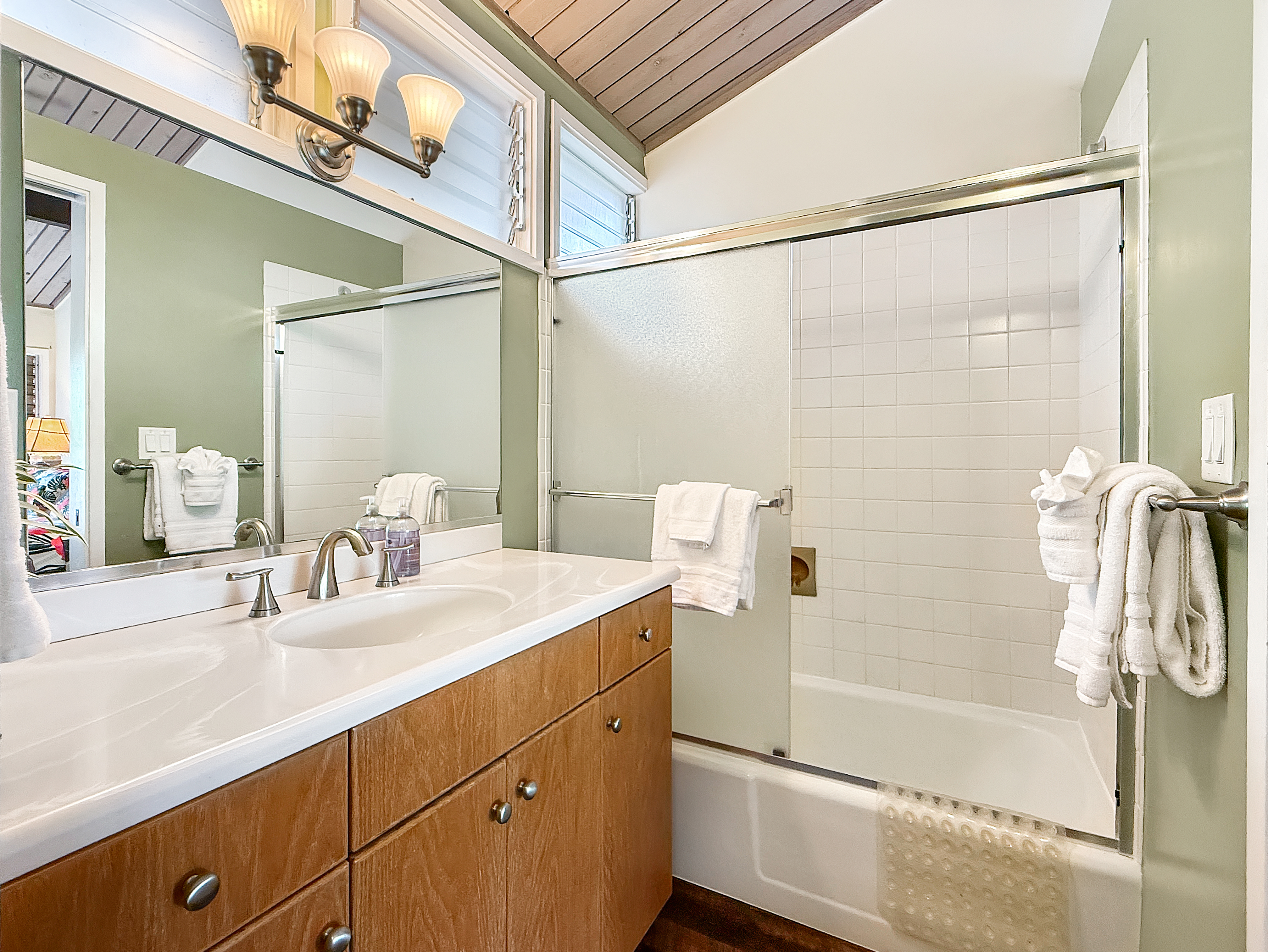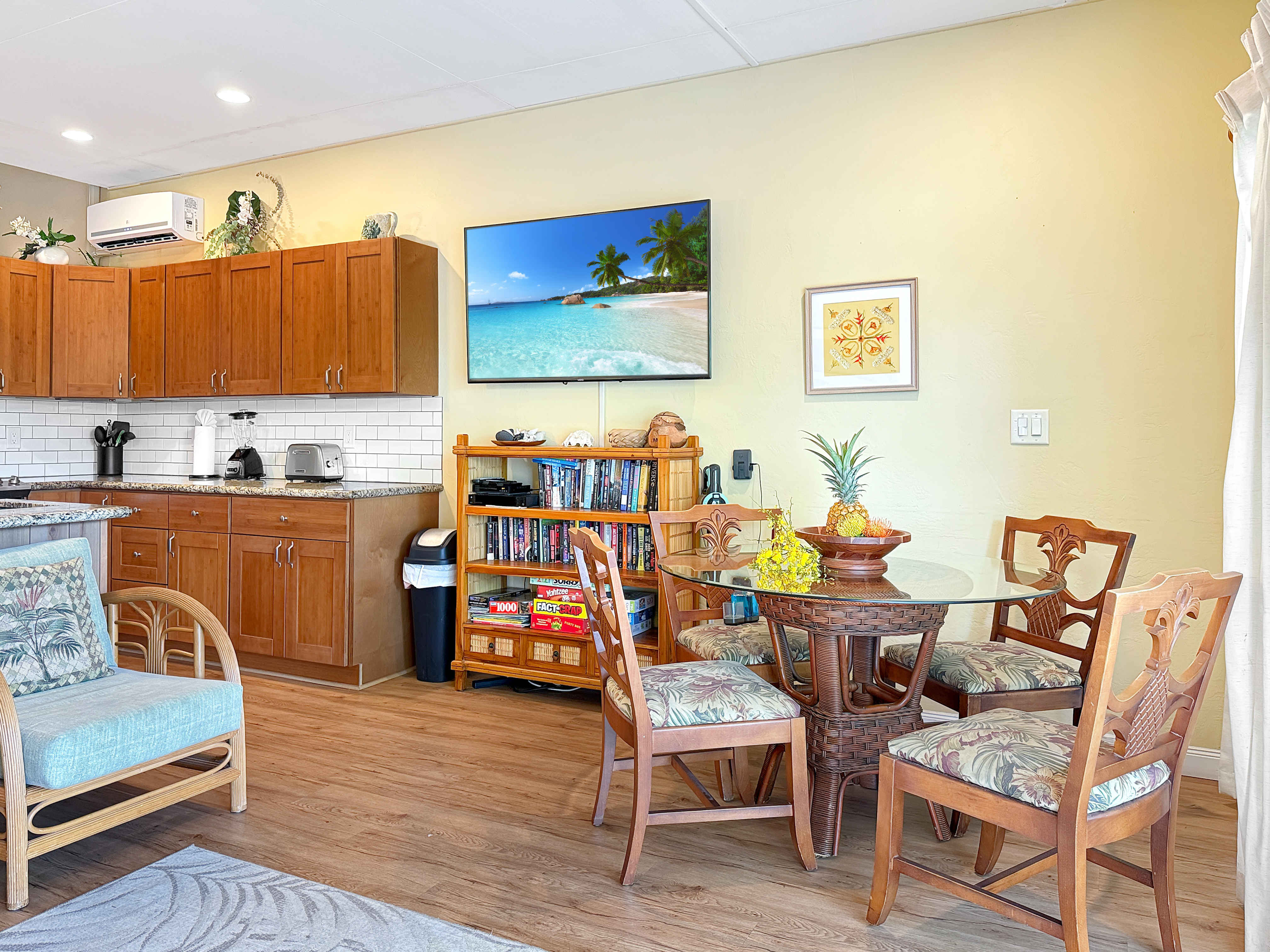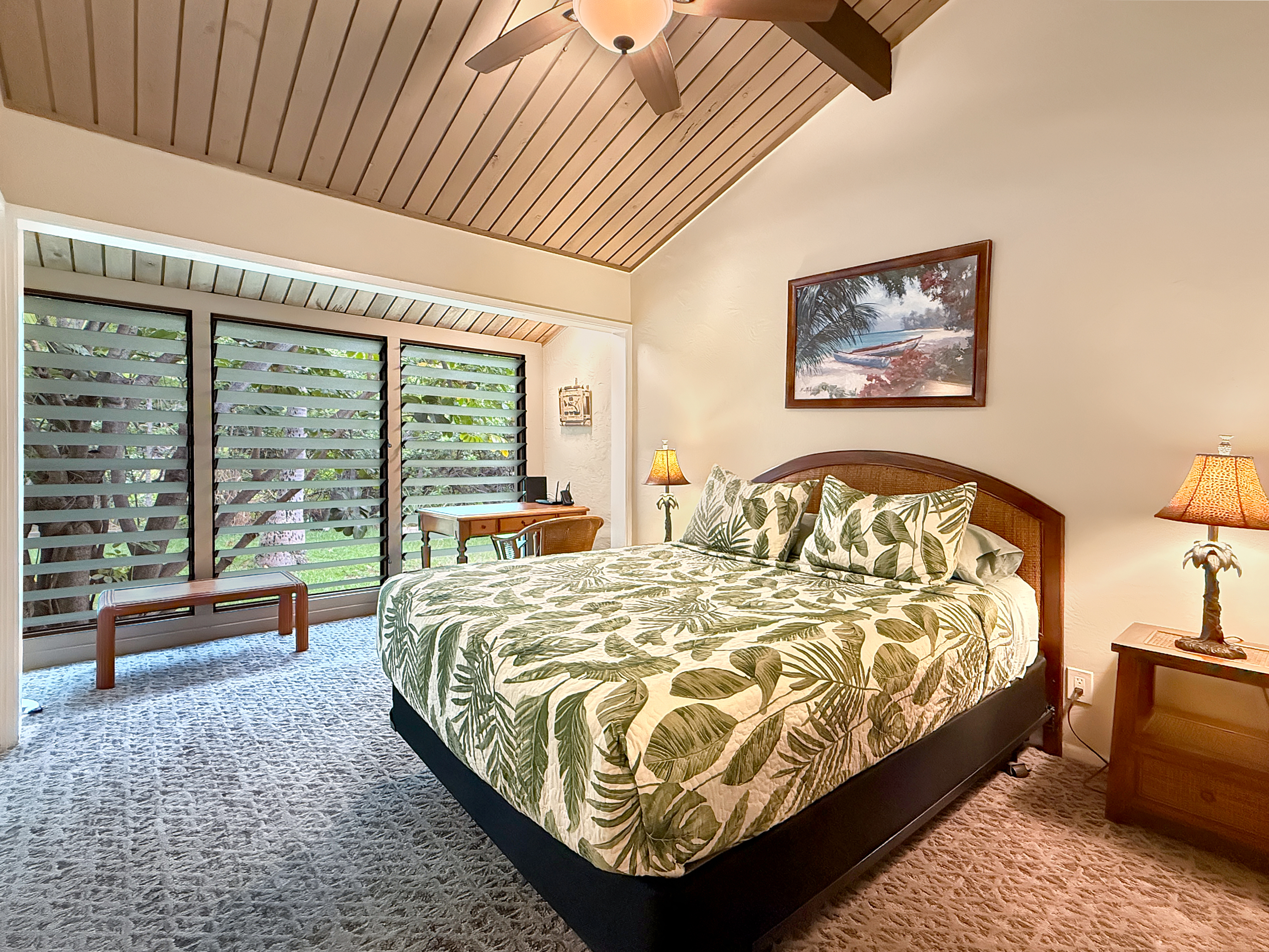 Unit has 2 bedrooms, primary is located on 2nd floor with its own private lanai and primary bath. Two split AC units help keep the air cool during the hot Kona days. Open concept kitchen features granite counters and stainless steel appliances and stack washer and dryer are located off the kitchen area. Guests can utilize the walk in shower and bathroom off a little landing outside the guest bedroom. Wide louvered windows welcome lots of natural light.