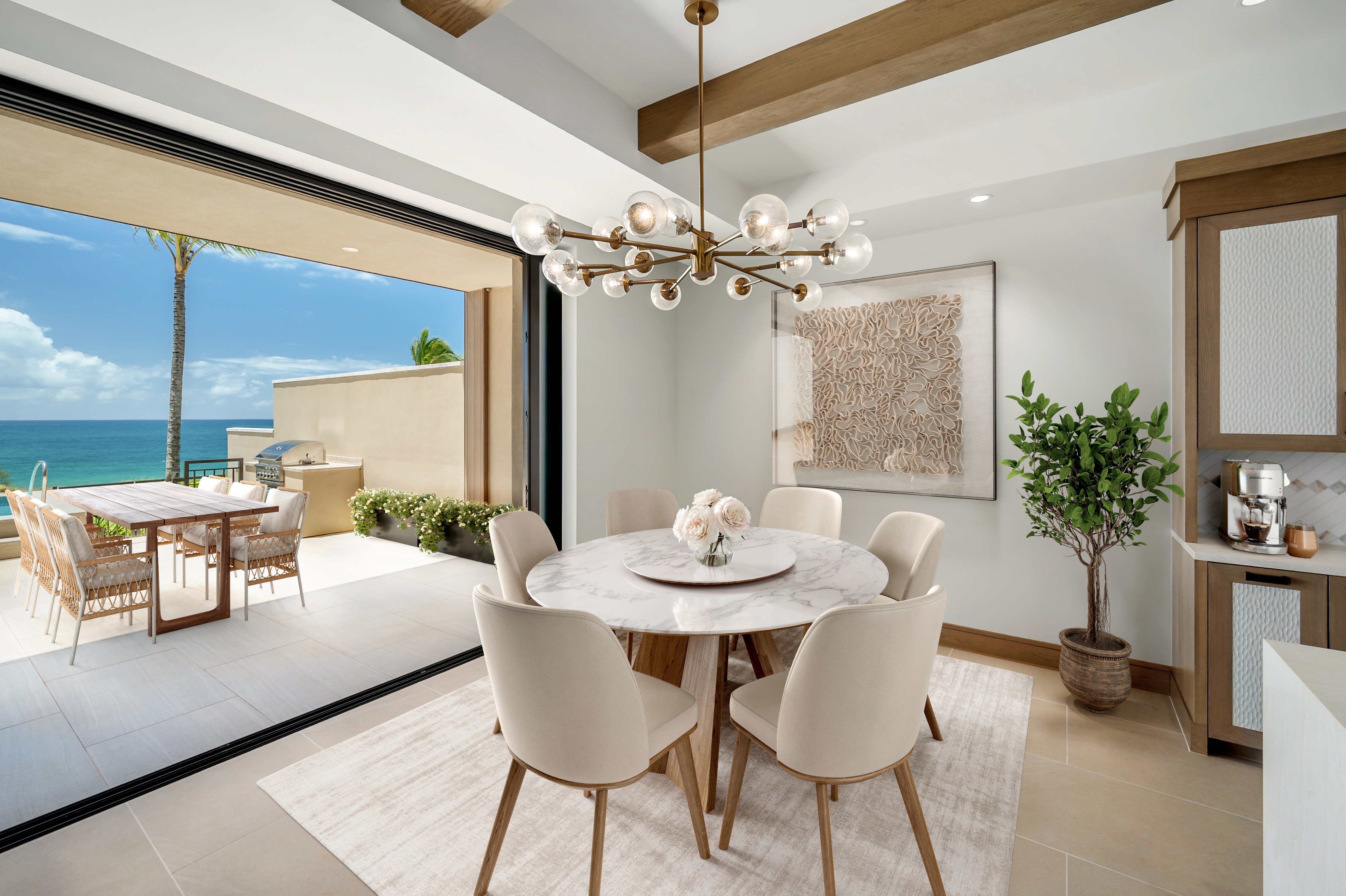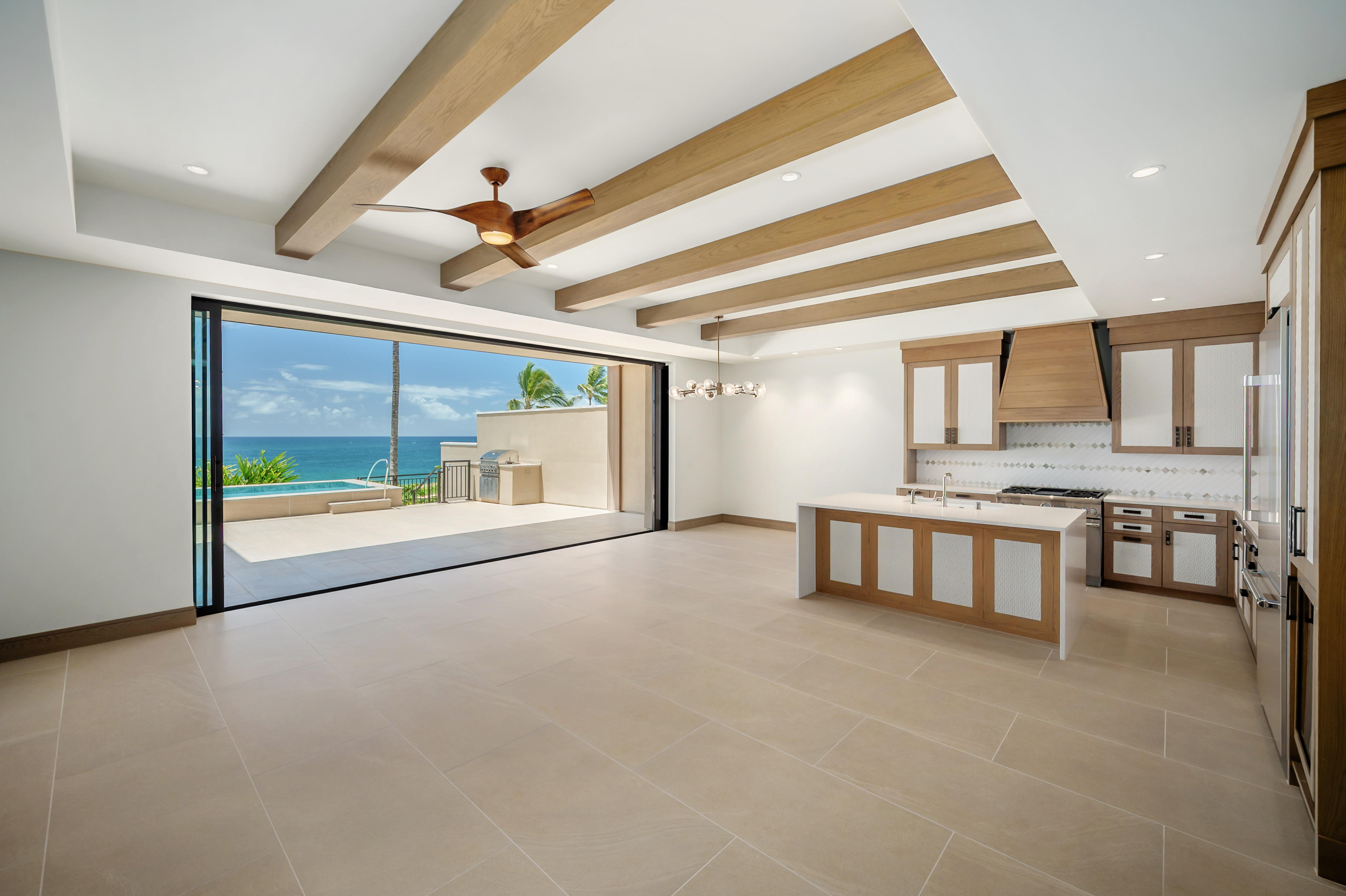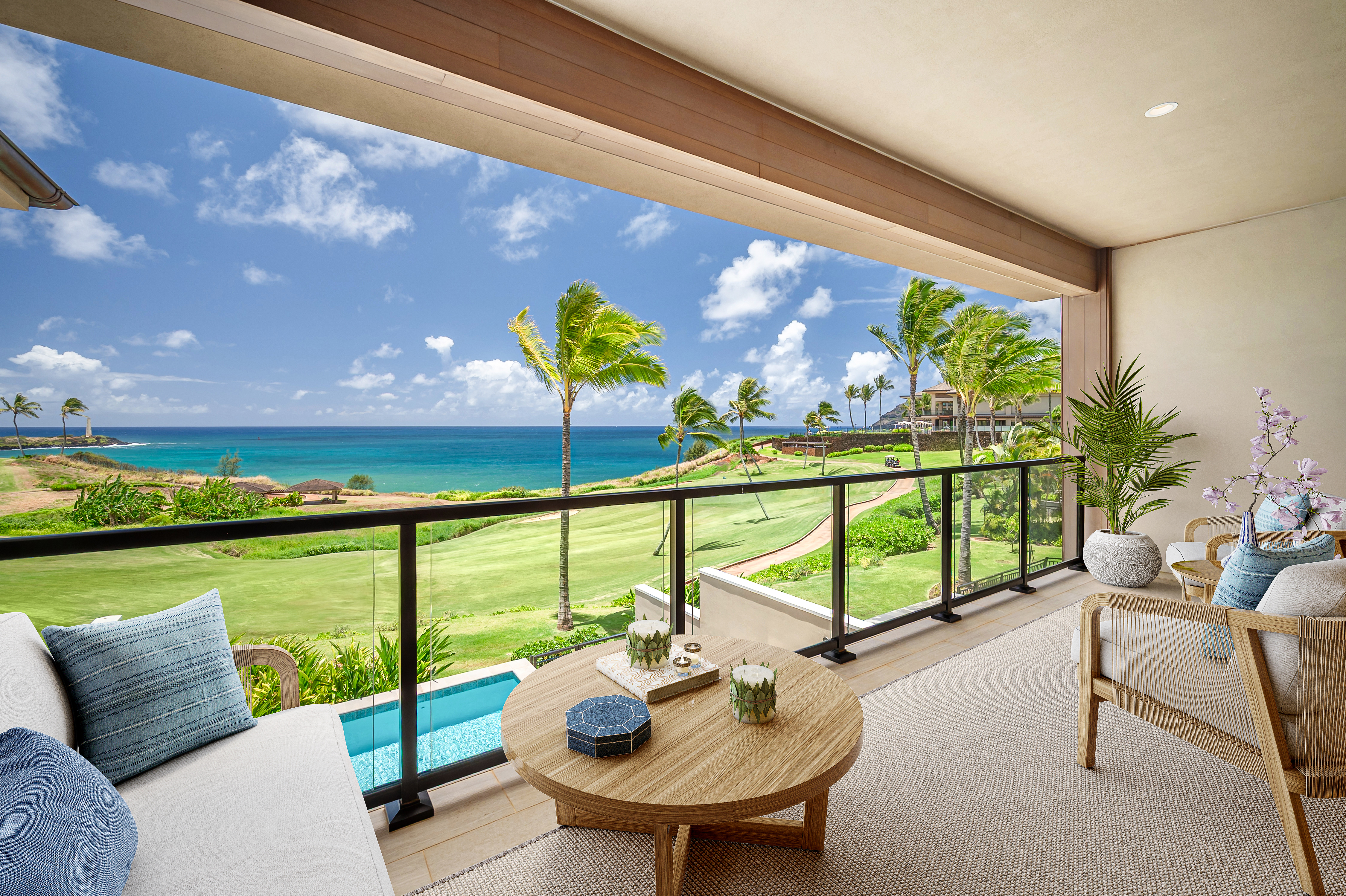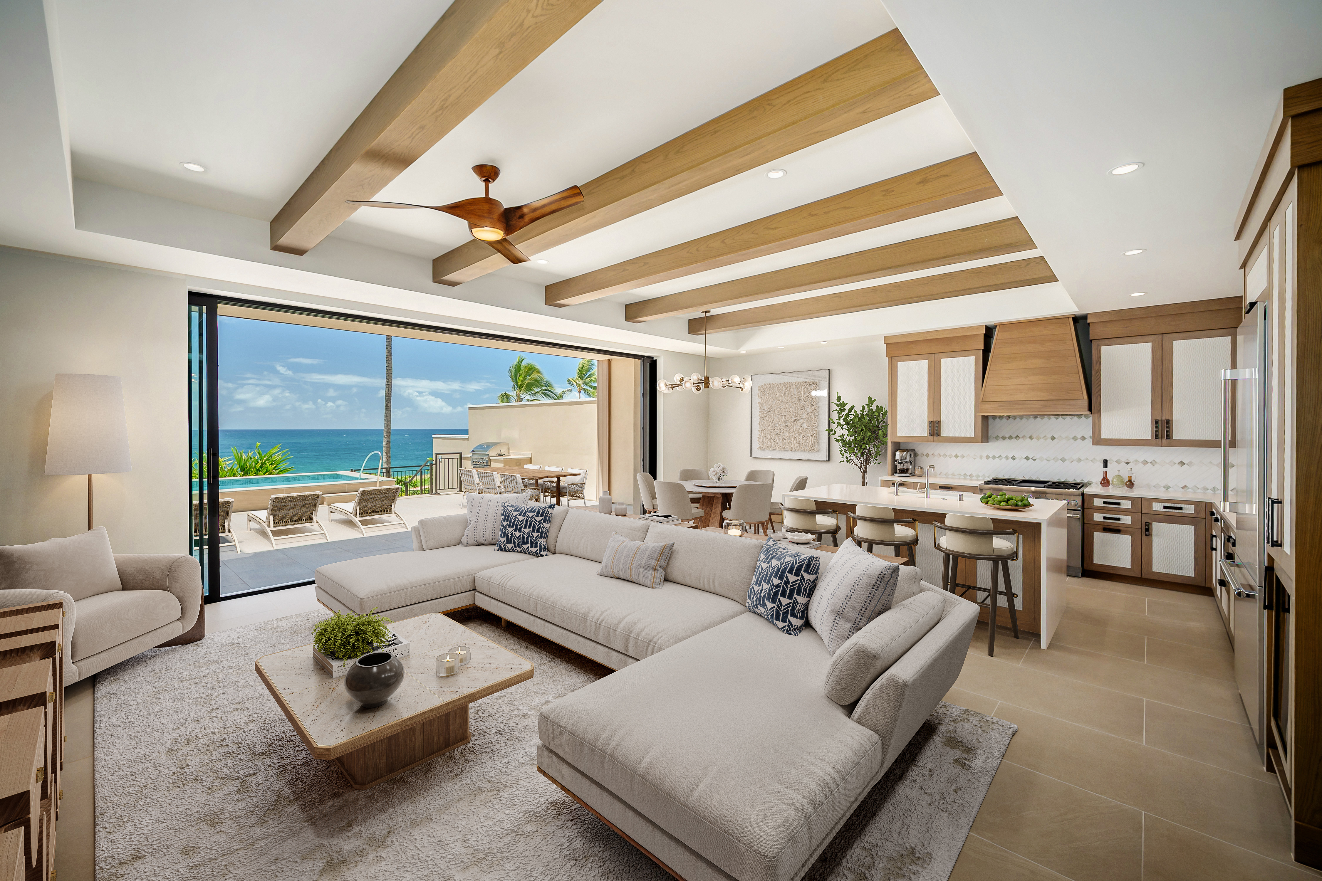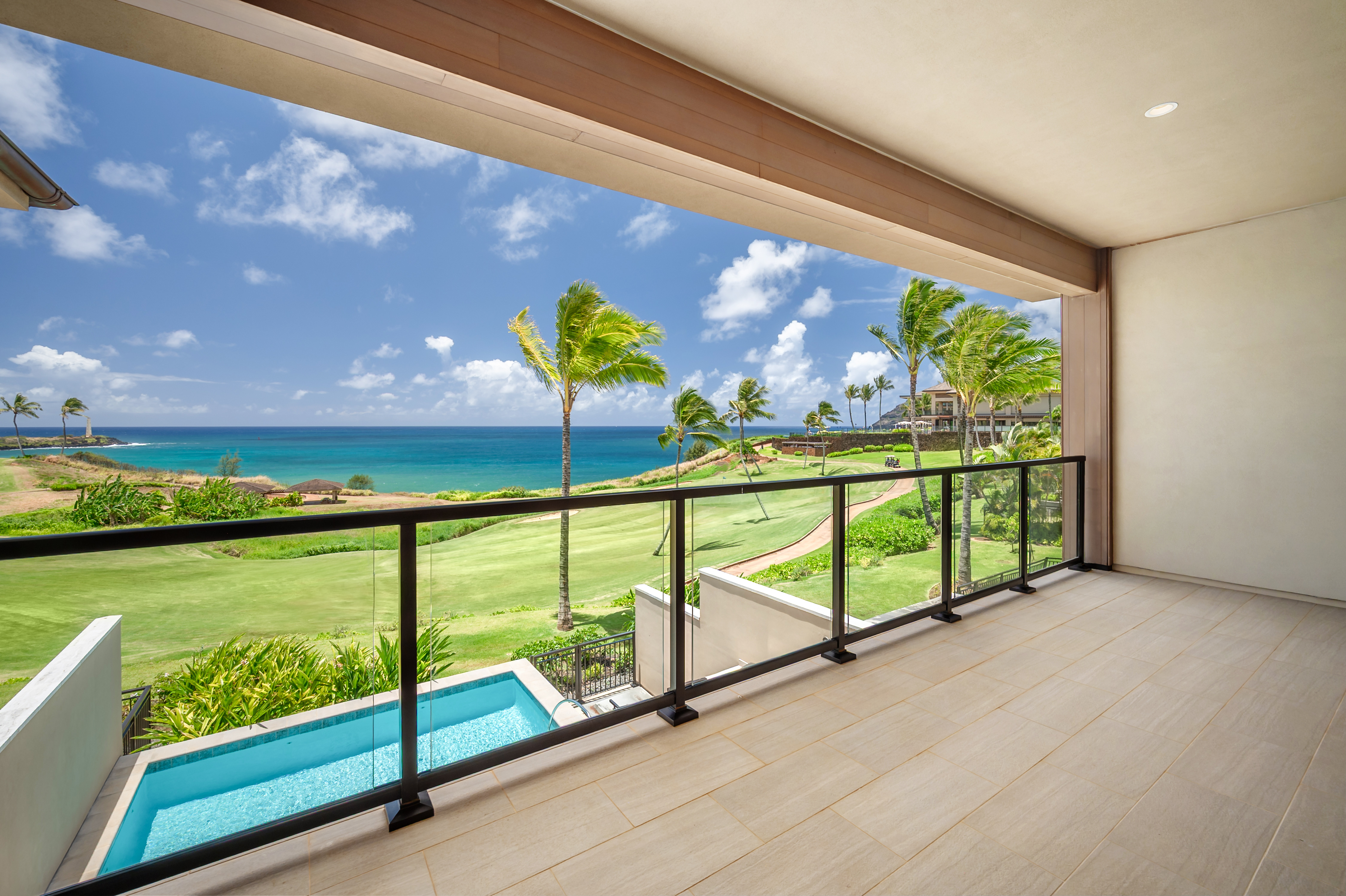 Laola Nani 2002 is a new 3 bedroom/3.5 bath ocean view townhome showcasing breathtaking views of the shimmering waters of the Running Waters Bay and the Ninini Pt. Lighthouse. Here, relaxation is waiting to welcome you home. These gorgeous 2-story villas frame the prized oceanfront hole #15 of the signature Nicklaus designed Ocean Course and feature tropical contemporary design with elements such as custom wood cabinetry and natural stone countertops.   The disappearing floor to ceiling glass doors create seamless indoor/outdoor living opening to a generous lanai with private plunge pool and built-in BBQ. The kitchen is a chef's dream with Thermador Pro Grand Series appliances, wine/beverage cooler, custom mosaic tile backsplash and quartz countertops. The photos are virtually staged.  Custom furniture package is available.