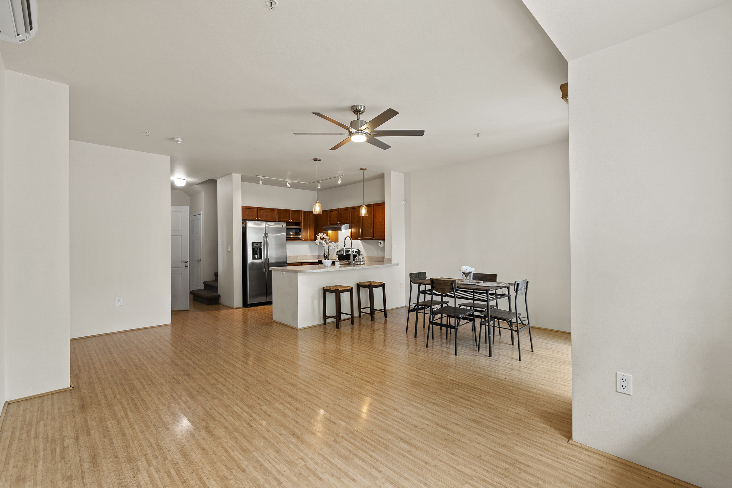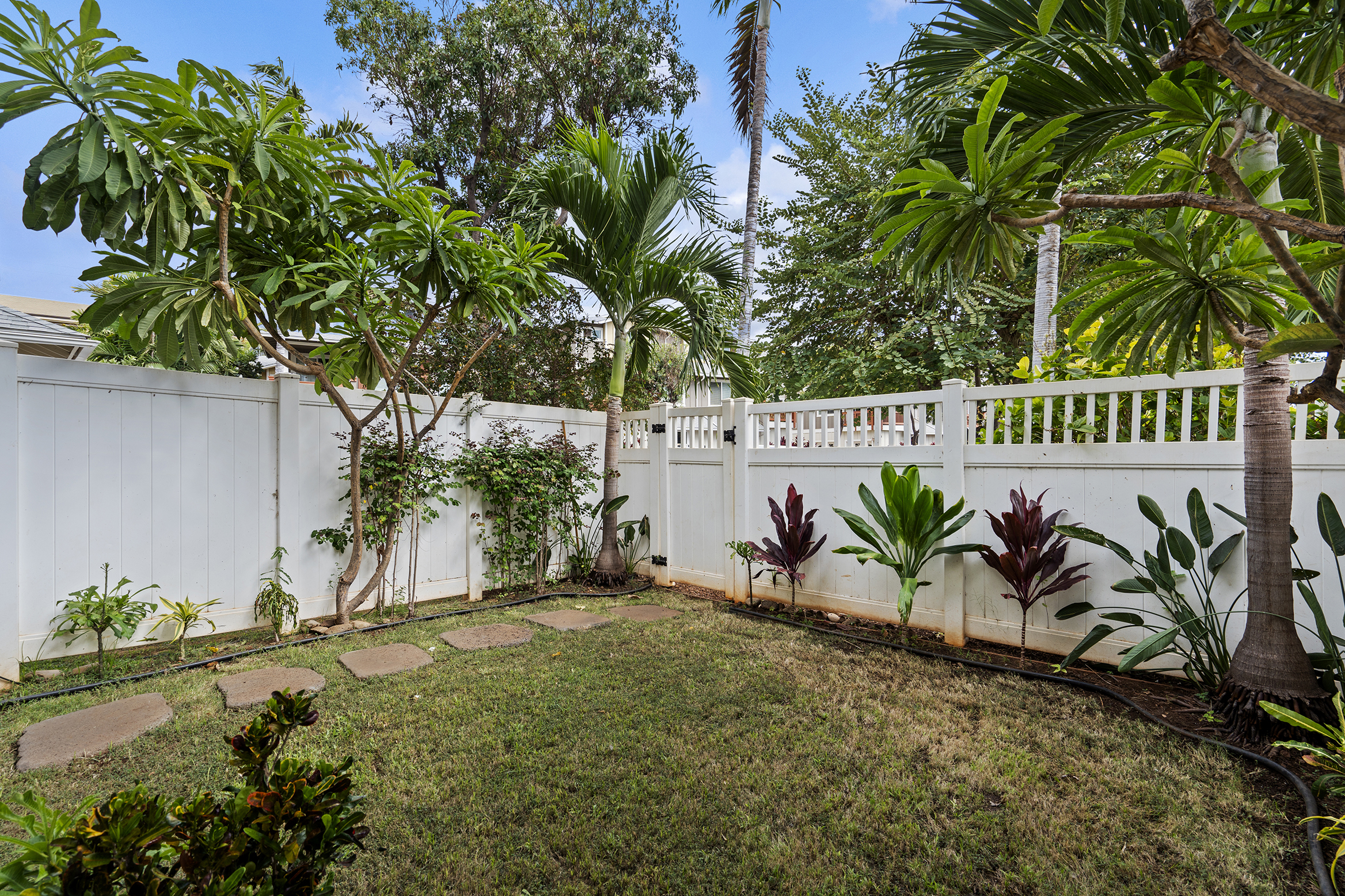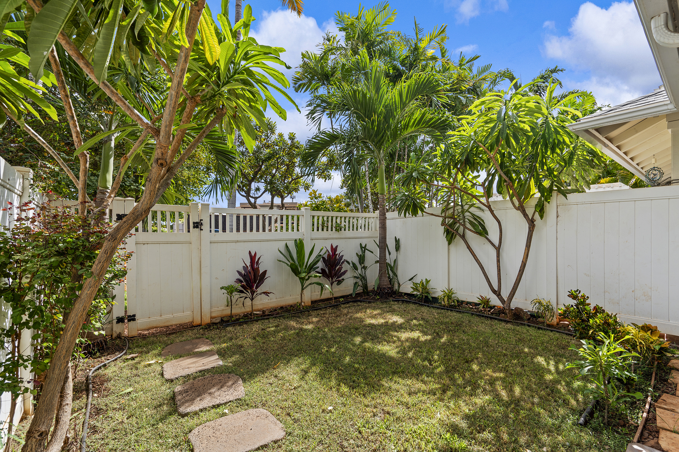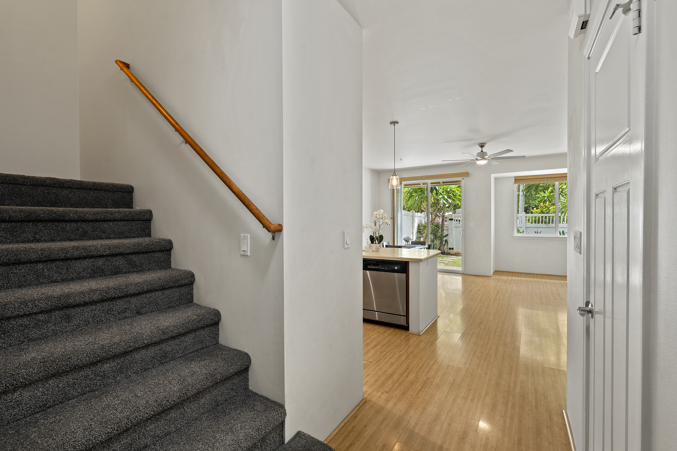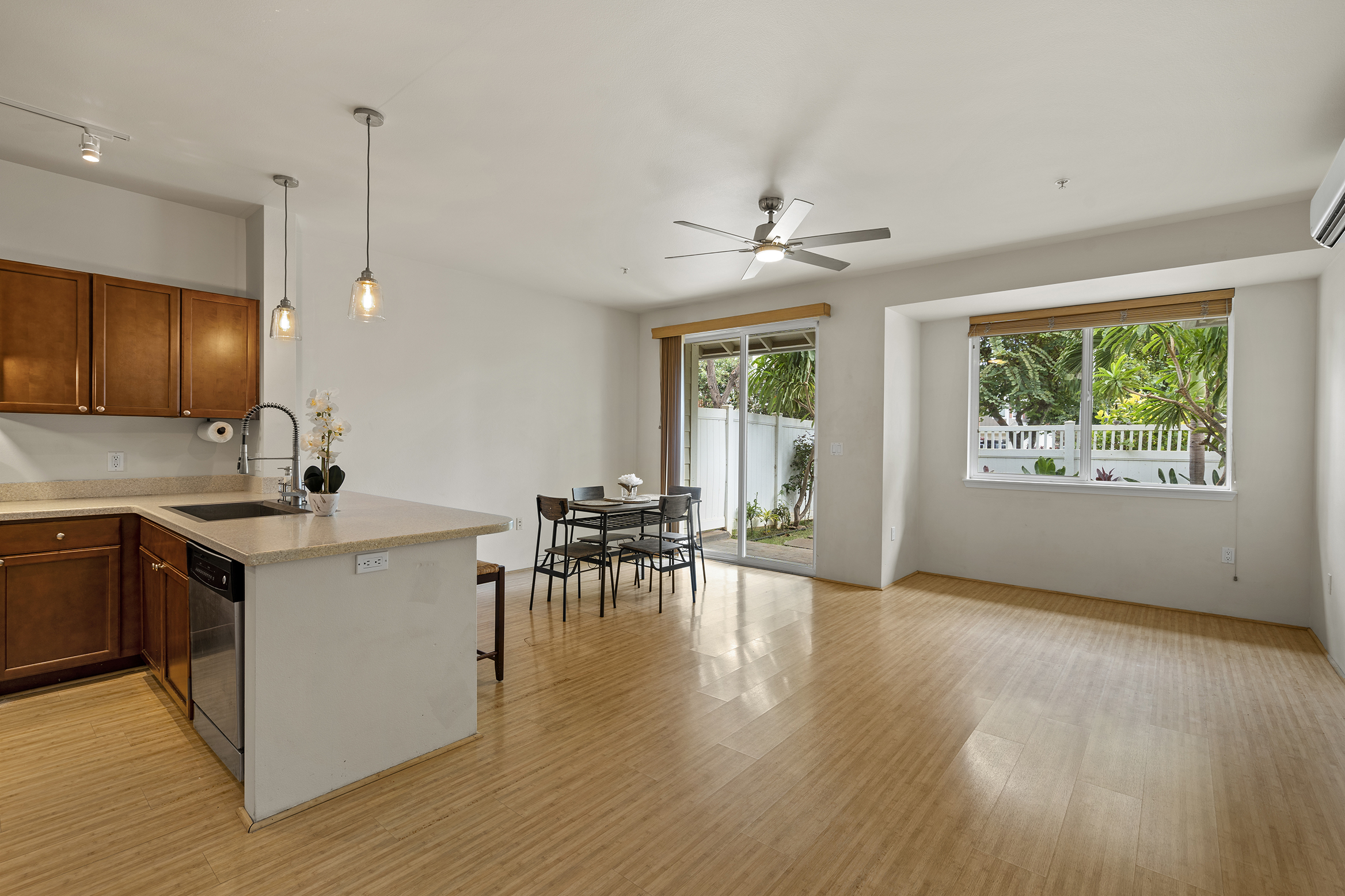 Step inside to a bright, open-concept kitchen, dining, and living area filled with natural light, featuring bamboo flooring, stainless steel appliances, a split AC system, a wired alarm, and custom shades. A convenient half-bath on the main floor ensures guest privacy. Your private backyard lanai, surrounded by plumeria, palm trees, and tropical plants, is ideal for relaxing, hosting a barbecue, or enjoying time with your pet.