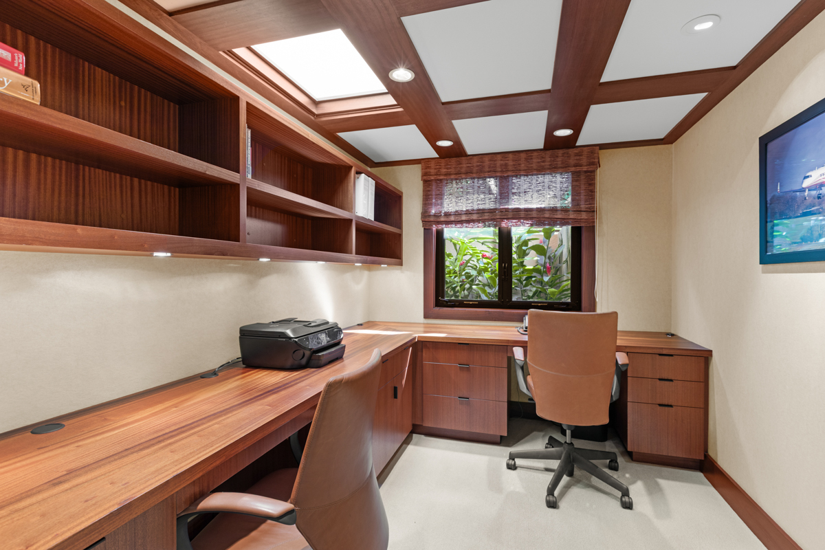Thoughtfully redesigned by Queen Construction, the villa features three ensuite bedrooms plus a dedicated primary office, 3.5 baths, and refined finishes throughout. Stone flooring and countertops, exquisite Craftsman-style cabinetry and woodwork, expansive sliders and picture windows, and electric blinds and shades enhance both comfort and elegance. Tastefully furnished and fully outfitted, the home is truly move-in ready.
