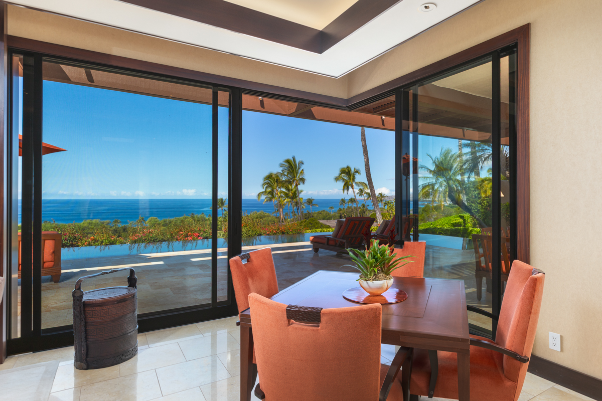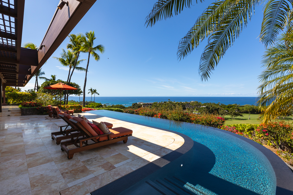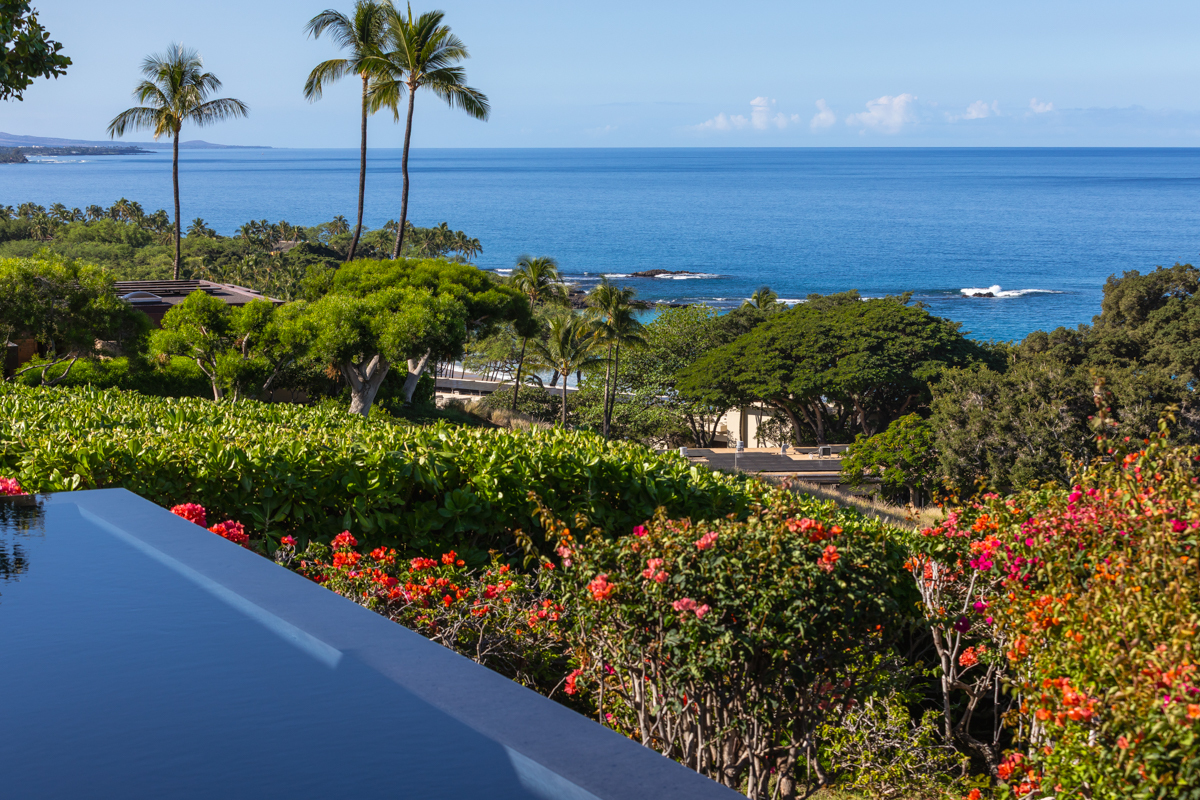 This exceptional residence offers unobstructed panoramic views spanning the Kona—Kohala Coast to Maui, with year-round sunsets sinking into the Pacific–visible from two bedrooms as well as the living, dining, and kitchen areas.