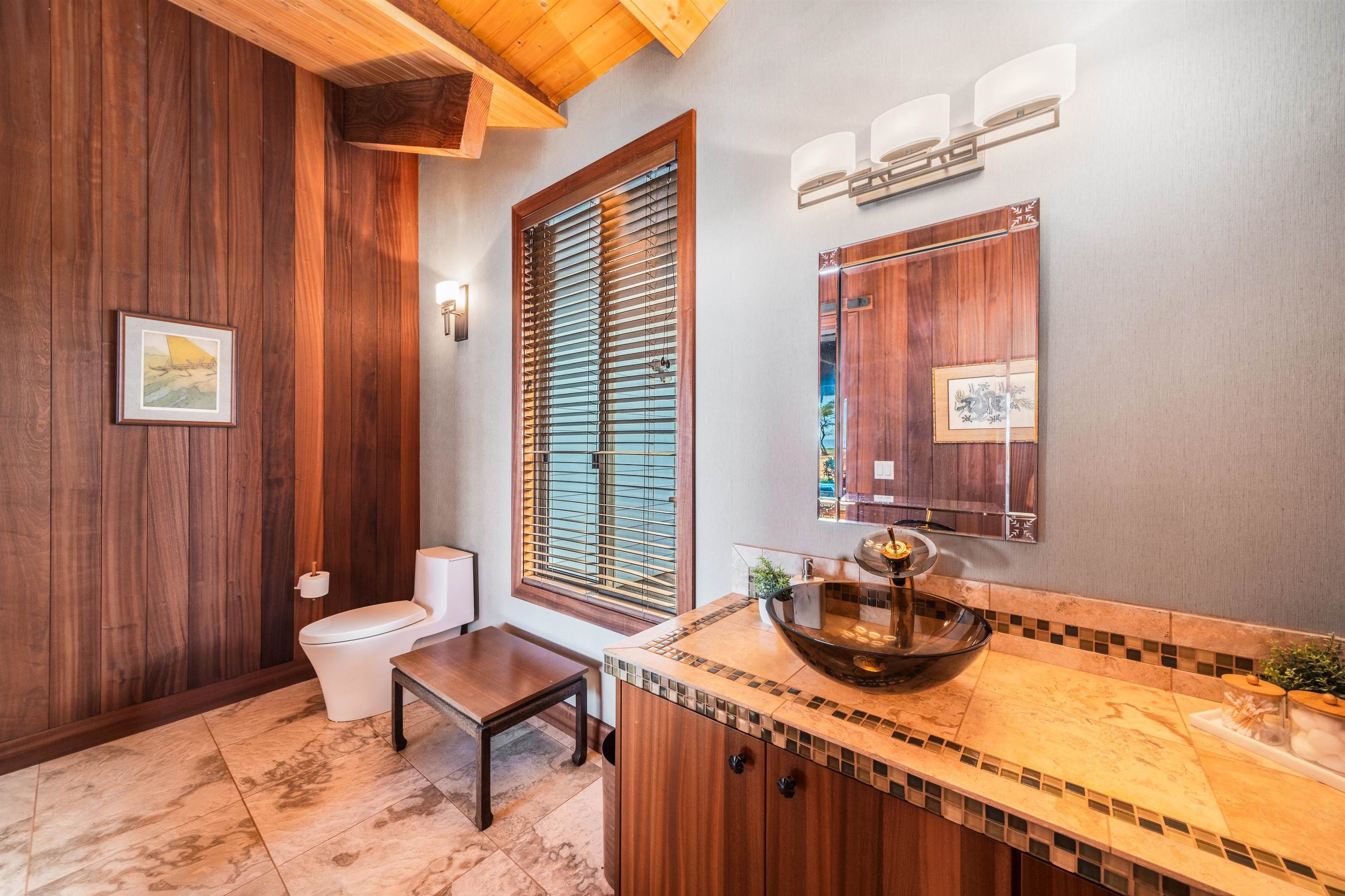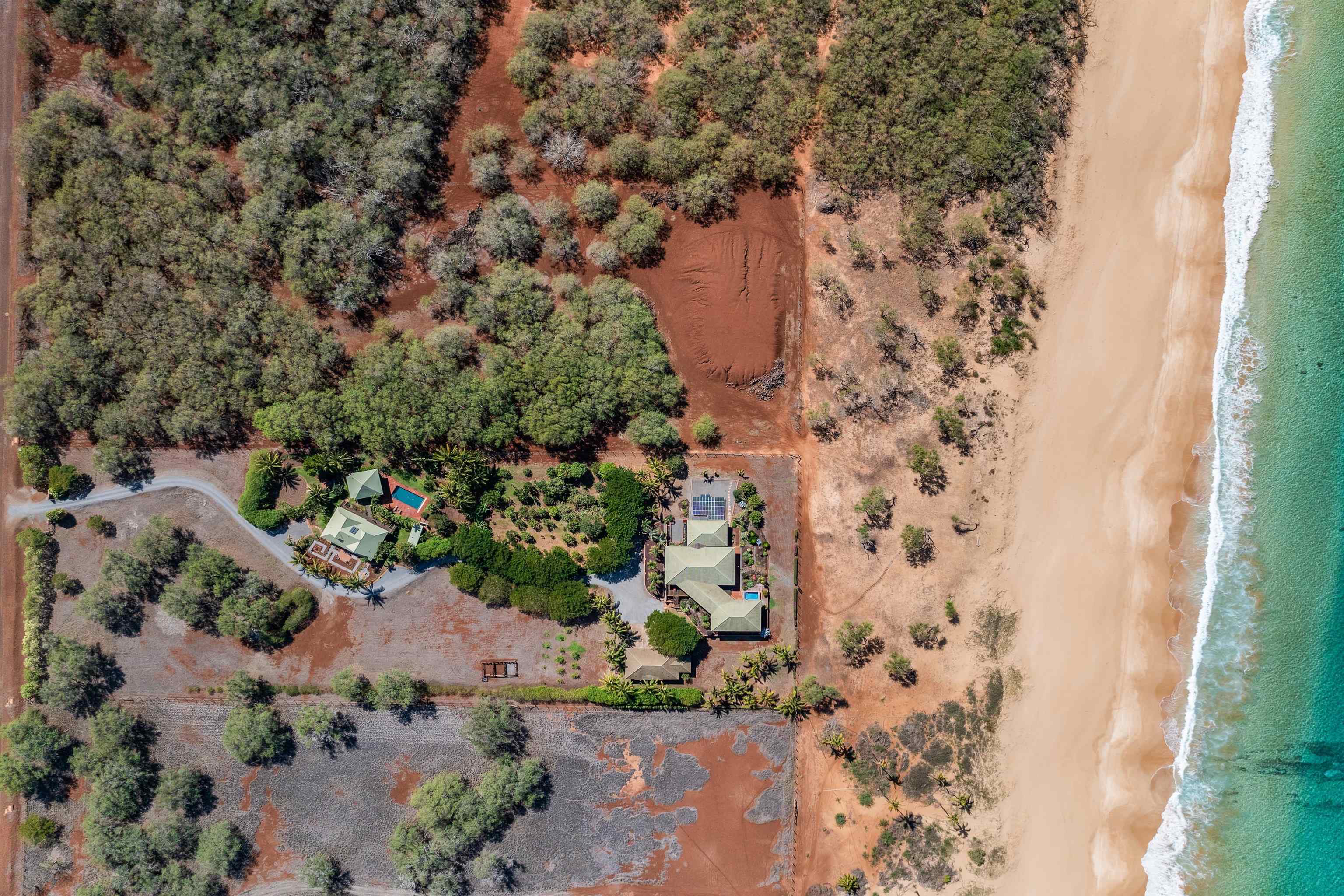 Experience the serenity of true beachfront living at 3036 Kalua Koi Way, an exceptional Molokai estate on nearly six acres along Papohaku Beach. Blending elegant Japanese-Hawaiian design with seamless indoor-outdoor living, the property includes a main oceanfront home with two primary suites and 2.5 baths, plus a separate two-bedroom, two-bath guest house. Enjoy a heated saltwater pool with cabana, a detached 3-car garage with bonus room, and a fruit orchard. Interiors showcase Sapele wood, bamboo floors, Fleetwood doors, and Ipe lanais framing panoramic ocean views. Powered by photovoltaic solar and fiber internet, this sustainable retreat offers luxury, privacy, and modern comfort–an antidote to modern hustle and a return to a more conscious way of living.