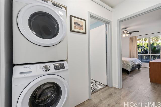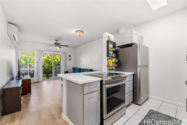 RARE ground floor 2 bedroom unit at Streamside at Launani Valley! Featuring 713 sq ft of interior living space, a 69 sq ft lanai, plus a private fenced in yard and many updates including split A/Cs in each room, modern bath & kitchen, stainless steel appliances, luxury vinyl floors, additional storage and 2 parking stalls. Streamside has under $1/sf maintenance fees, is VA approved, pet friendly, and fully insured! Enjoy access to both Streamside and Launani Valley amenities which offers a pool, jacuzzi, BBQs, rec room, basketball/tennis/pickleball courts, walking paths, dog park, guest parking, and more! Conveniently located near Schofield Barracks, Wheeler Army Airfield, and freeway access.