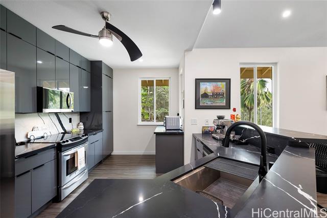 A rare designer-style townhome that redefines Launani Valley living! This spacious, three bedroom loft style CORNER unit with soaring ceilings and abundant natural light is thoughtfully designed from top to bottom where every finish was intentionally curated rather than simply upgraded creating a sophisticated, design-forward home that looks straight out of a high end magazine! With over $120,000 in detailed upgrades, you can enjoy a spa inspired bathroom with waterfall shower and custom vanity, brand new windows throughout, built in walk in closet, recessed lighting, and a sleek and modern kitchen with built in custom wine fridge and in line water filtration! Additional highlights include luxury vinyl plank flooring, newer carpets in bedrooms, AC, an attic fan, and extra storage closets. This stunning residence offers serene views in a well maintained association which recently completed roof replacements for added peace of mind. Enjoy access to their on site pool, clubhouse, and BBQ area , or the community association which offers a newly updated dog park, tennis courts, and basketball courts, all surrounded by the lush, serene landscape that is the perfect place to call home!
