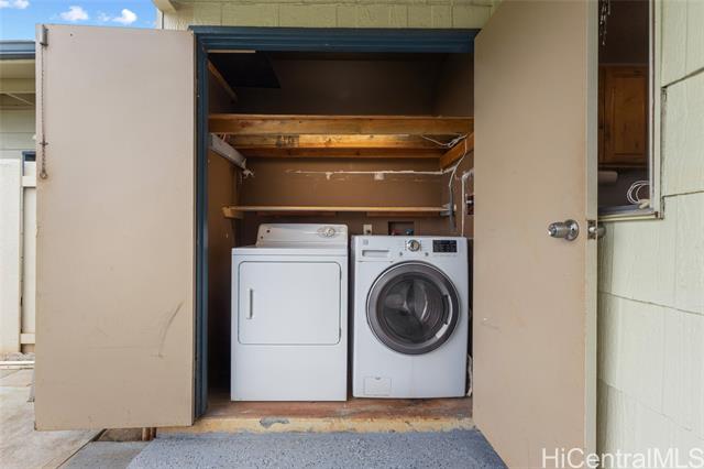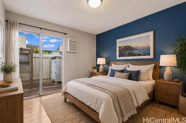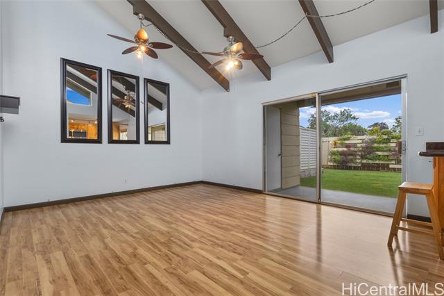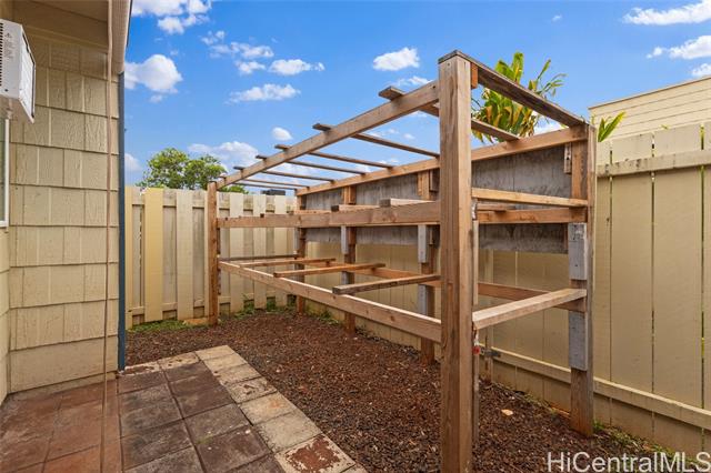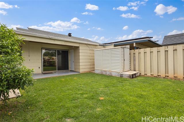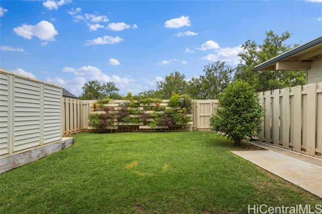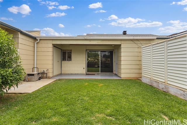 High vaulted ceilings and abundant natural light create a bright, spacious feel throughout this well-positioned single-level 2-bedroom, 1-bath Kealohi Hale Patio Home. Enjoy two private enclosed yard spaces—including one with a living wall—ideal for relaxing, gardening, or entertaining. The large fenced outdoor area extends your living space and offers the indoor-outdoor flexibility. Interior features include a walk-in closet in the primary bedroom, pantry storage, updated kitchen, AC units in both bedrooms, and additional overhead storage near the entryway. A generous exterior storage area adds even more everyday functionality. Two side-by-side parking stalls are conveniently located near the unit. Desirable single-level living with private yard space in the heart of Mililani, close to parks, shopping, schools, and recreation centers