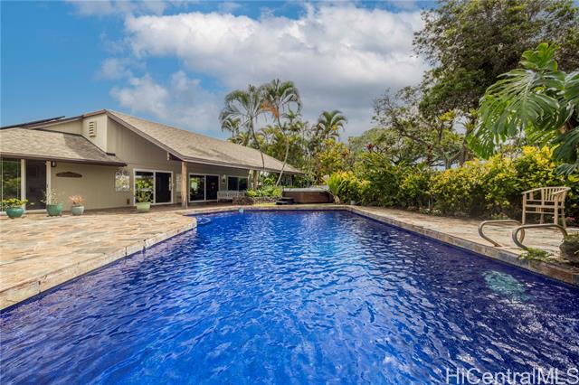 Hawaiian paradise; a single-level, 4-bdrm resort-style home in the heart of an 11,000+ sq ft tropical oasis. Vaulted ceilings elevate 2 expansive living areas, kitchen and dining open floor plan. Travertine floors, granite kitchen/bath countertops, stainless appliances, Bosch dishwasher. Large open travertine showers say goodbye to squeeze-gang glass shower doors! Situated for privacy, neutral light and cross-breezes scented with plumeria and white ginger plantings. Spacious cathedral-ceilinged lanais, 35 foot tiled pool, Bullfrog hot tub, outdoor shower, dedicated BBQ space. Fruiting orange, lemon and cacao trees, butterflies and birds. 36 owned, net-metered photovoltaic panels and battery, reflective cool roof, coated double pane windows and doors (transferable lifetime warranty), solar cool attic fan. Upgraded electrical, plumbing. HOA maintains sidewalks, parks, & recreation centers for residents. Close to quality public schools, golf, shopping centers, medical offices, restaurants, YMCA, and weekly Farmer’s Market.