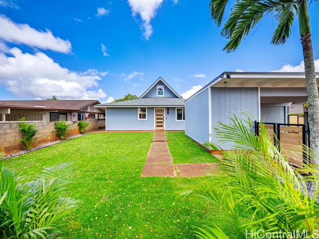 Discover modern island living in this stunningly renovated 4-bed, 2-bath single-family home with bonus flex space! Perfectly positioned on a quiet cul-de-sac in sought-after Mililani, this home offers privacy and a prime location just minutes from Schofield Barracks, parks, shopping, community pools, and walking distance to schools. Inside, vaulted ceilings provide natural light, and the open-concept layout is ideal for seamless living. The gourmet kitchen and dining area shine with waterfall-edge countertops, open shelving, soft-close cabinetry, a wine fridge, and brand new appliances. USB outlets, double-pane windows, and insulation ensure comfort and efficiency. The primary suite offers a luxurious ensuite bath, sleek LED mirrors, and stylish finishes. Mini split A/C and a full-size in-house washer/dryer add modern convenience. Outside, a custom deck and pergola with market lights create the perfect space for relaxing, complemented by fresh sod, automatic sprinklers, and a fire pit. Carport features two lockable storage areas including a workbench. Everything is new, new, new—a true turnkey opportunity to own a slice of paradise in one of Oahu’s most desirable communities.
