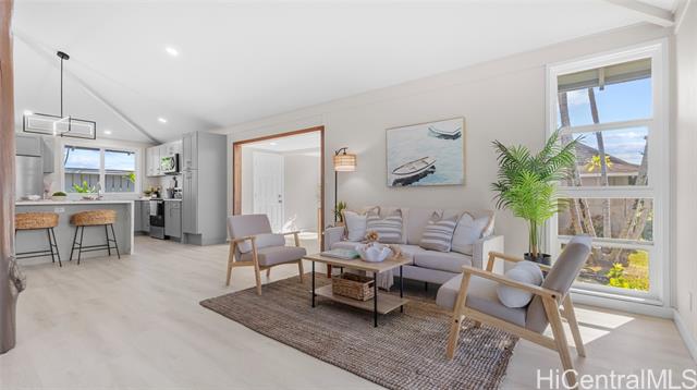 Come see this beautifully renovated home, fully remodeled in 2024! The contemporary kitchen boasts new sleek gray cabinetry, stainless steel appliances, and quartz countertops, perfectly complemented by an open-concept layout that flows into a bright and airy living space. Vaulted ceilings and large new windows invite natural light, offering stunning views of the lush backyard. The chic bathrooms are upgraded with modern fixtures and stylish tilework, providing a spa-like retreat. Enjoy outdoor living in the expansive, private yard, perfect for relaxing or entertaining. The thoughtful design merges comfort with elegance, making it the perfect blend of style and functionality. Located in a peaceful community not far from freeway access and close to local amenities like golfing, parks, schools, shopping, and groceries, offering the ideal balance of convenience and comfort. This home is part of Mililani Town Association (HOA fee ~$48/month), a community designed to offer its residents a high quality of life. The Association oversees the management of the community’s parks, recreation centers, and other amenities, ensuring the neighborhood maintains a clean and appealing environment.
