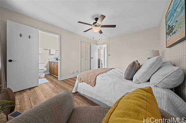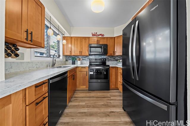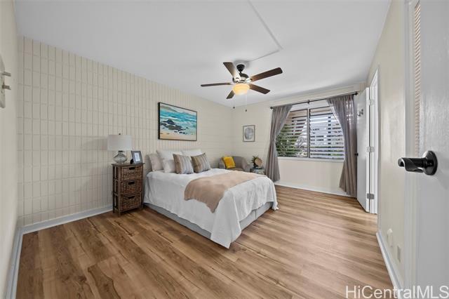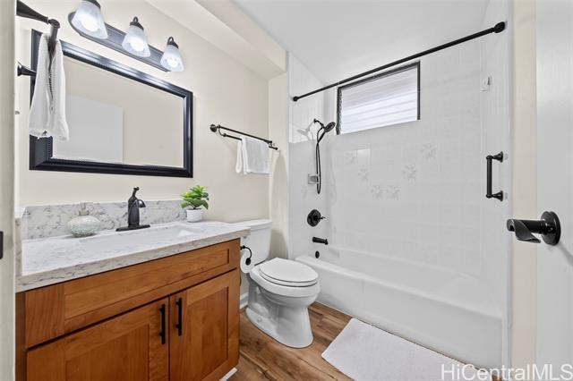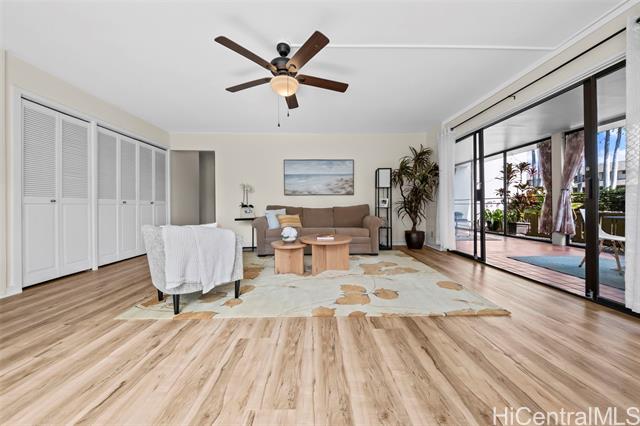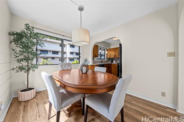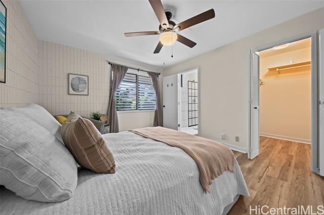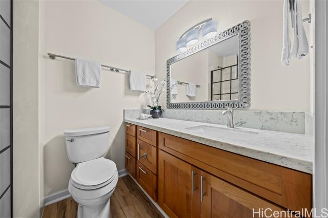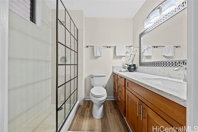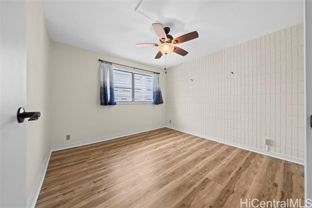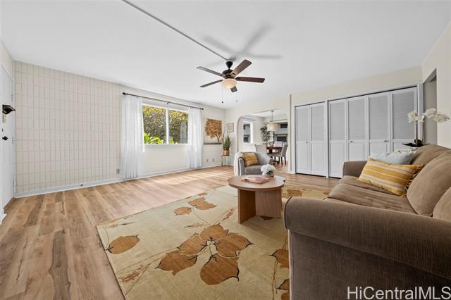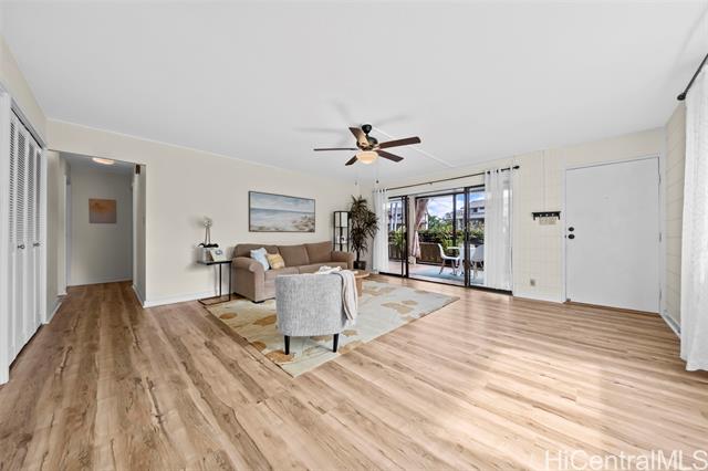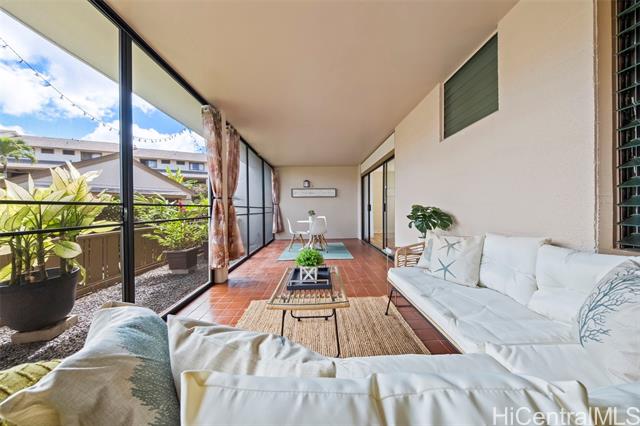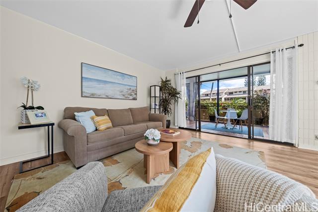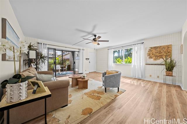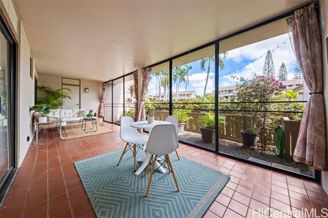 Peace, tranquility, and comfort await you in Mililani's Kuahelani Apts! Nestled on a quiet street near Mililani Golf Course, this 2 bed, 2 bath first floor unit has been lovingly taken care of and upgraded over the years. Upon stepping foot through the front door, you'll be greeted by a spacious living area, flooded with natural light, and neatly upgraded with luxury vinyl plank flooring. Impressive archways will guide you towards the designated dining room and full kitchen that has everything a home chef could need including ample cabinet space, a dishwasher, and large quartz countertops. Last, but not least, envision yourself relaxing with family and friends on your extra large enclosed lanai - an ideal, flexible space that can be used for outdoor entertainment, a home gym, or a yoga studio! Two side-by-side covered parking stalls and two extra-large storage rooms are a huge bonus! Just a few minutes drive from Mililani Town Center, Mililani Shopping Center, and Mililani High School! Must see to fully appreciate all this gem has to offer.