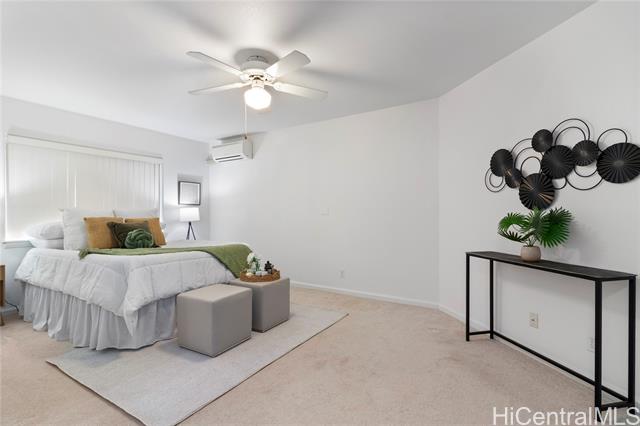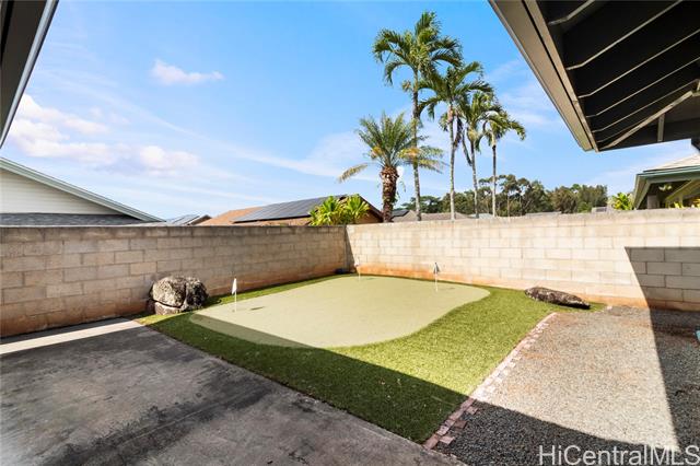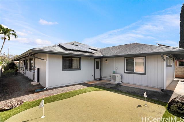 Welcome Home to Mililani Mauka! Step into this rarely available 4-bedroom, 3-full-bath detached single-family home perfectly situated in the desirable Mililani Mauka community. With 2,058 sq. ft. of interior living space, this home boasts soaring vaulted ceilings, an inviting open-concept kitchen, and a spacious primary suite that includes a bonus ensuite with a wet bar and separate entrance - perfect for guests, multi-generational living, or a potential renter. Beautifully renovated and meticulously maintained, this home features a fully gated property, a low-maintenance yard, and your very own private putting green. Enjoy energy efficiency and sustainability with 43 OWNED PV panels, a Tesla battery, and a solar water heater, helping you keep electricity costs low. There are no HOA fees — just the Mililani Town Association membership, which provides access to 7 recreation centers, 5 pools, 12 tennis courts, and over 15 parks! Conveniently located just minutes from the freeway onramp, Costco, multiple shopping centers, and top-rated schools including Mililani High School, Mililani Middle School, and Mauka Elementary. Homes like this don’t come along often!