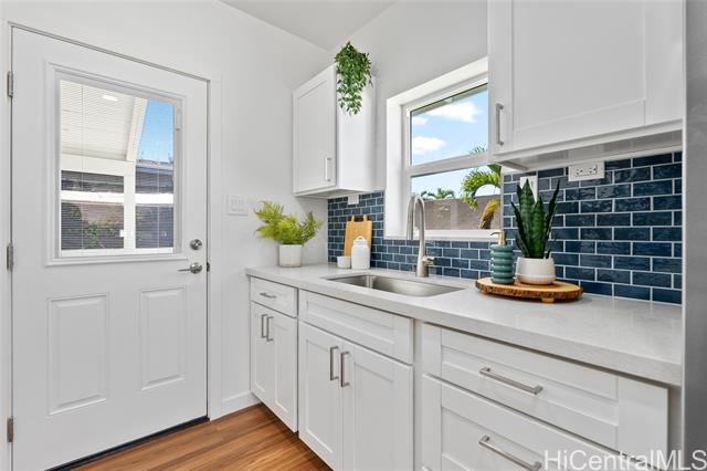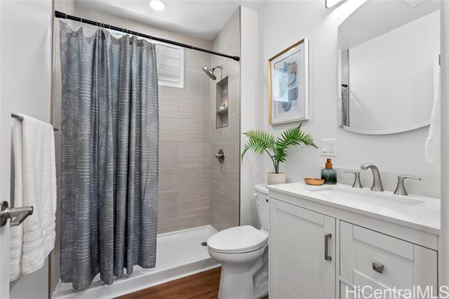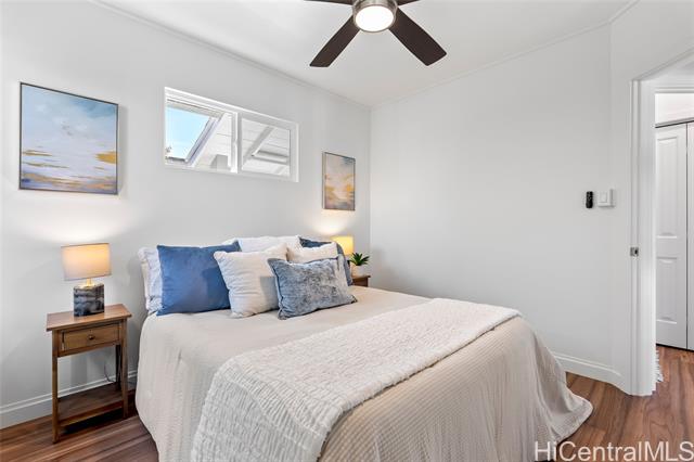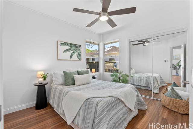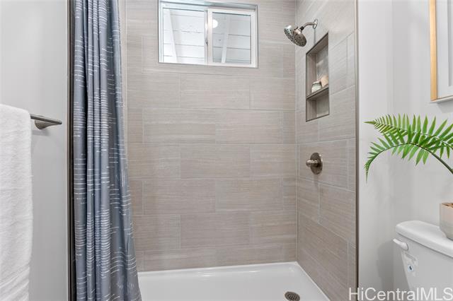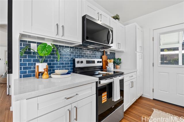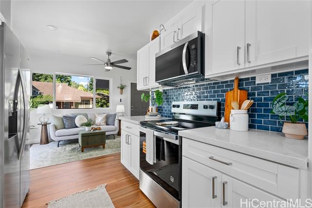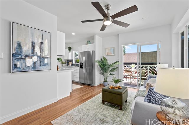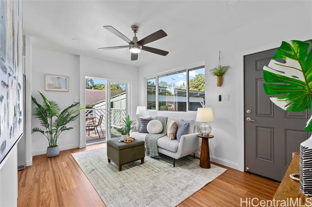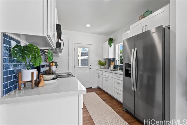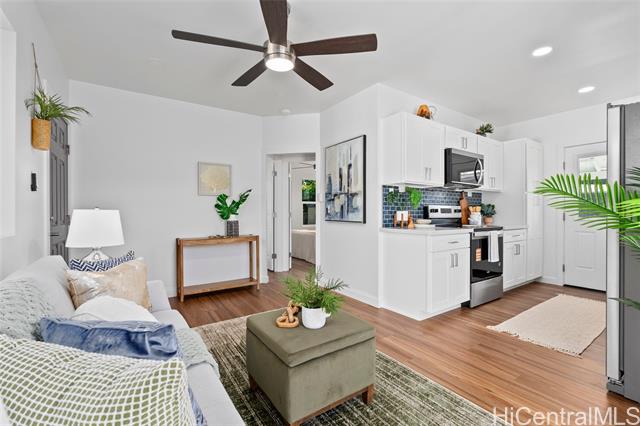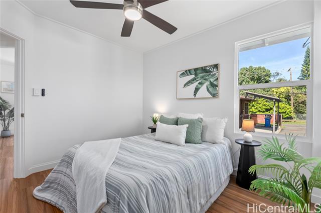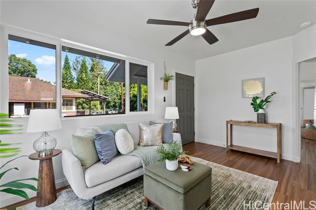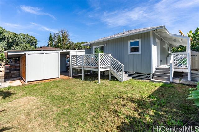 Welcome to 1281 California Ave #3, a fully renovated and redesigned 2bd/1ba home offering the feel of modern new construction with the charm of its original cottage style feel. Taken down to the studs and reimagined, this former home now features new exterior siding and trims, new windows, a new asphalt shingle roof, hurricane clips, full drywall, updated plumbing, and new electrical — essentially creating a modern home. The open-concept living area flows into a brand-new kitchen with stainless steel appliances, tile backsplash, new cabinetry, quartz countertops, and recessed lighting. Warm wood vinyl flooring runs throughout. The fully redesigned and renovated bathroom and large bedroom closets complete the interior. A new sliding door opens to a deck and fully fenced yard, plus a covered rear lanai for added living space. The enclosed two-car carport fits two full-size vehicles with room for storage. Set back from the street as the rear home down a private driveway, this property enjoys added privacy and a peaceful setting. No maintenance fees and an exceptional value in Wahiawa.
