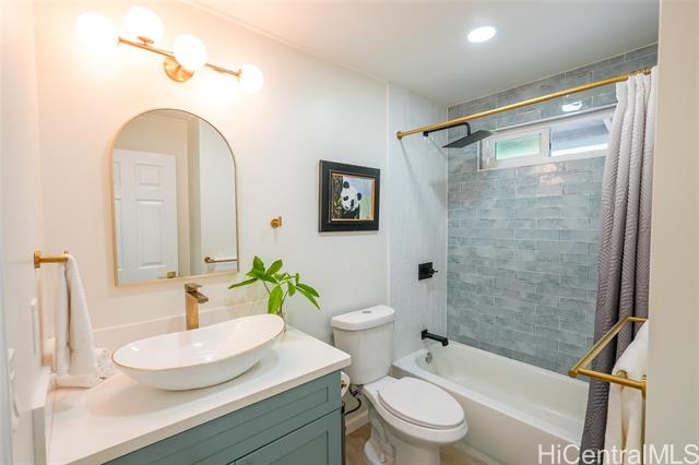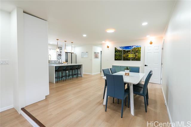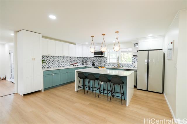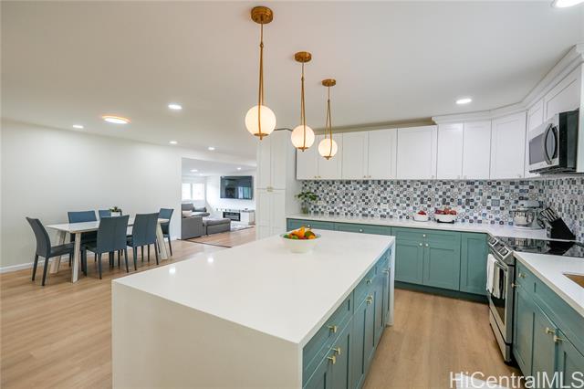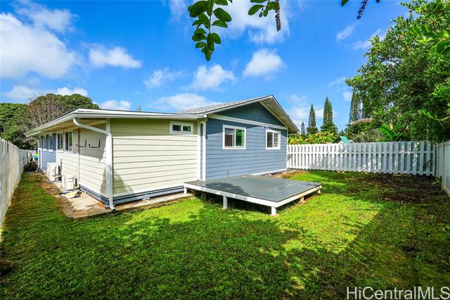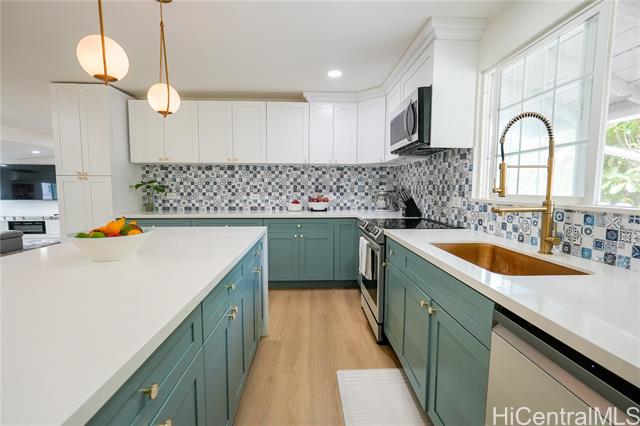 Tucked away in Wahiawa Heights, this newly renovated 5-bedroom, 2.5-bath home blends modern elegance with everyday comfort. Recently appraised at $1,040,000, this property offers exceptional value and peace of mind. Featuring an expansive 860 sqft permitted addition, the home offers an open, spacious layout. The stunning kitchen is a chef’s dream, designed for both style and functionality, with ample counter space, an island, and a pantry. Every detail has been thoughtfully crafted, from sleek gold fixtures to perfectly matched cabinetry in both kitchen and bathrooms. The bathrooms feature exquisite tile work, adding an extra touch of sophistication and charm. The primary bedroom includes a spacious walk-in closet that could be used as an additional room. Outside, the property has a cement driveway, 2-car covered carport, grassy front yard, and a lush backyard with a deck, ideal for relaxing or entertaining guests. Situated in a quiet neighborhood with easy access to North Shore beaches and freeway for a quick trip to town, this modern home offers the best of Wahiawa living. With everything in perfect condition, this home is move-in ready and waiting for you to make it your own.