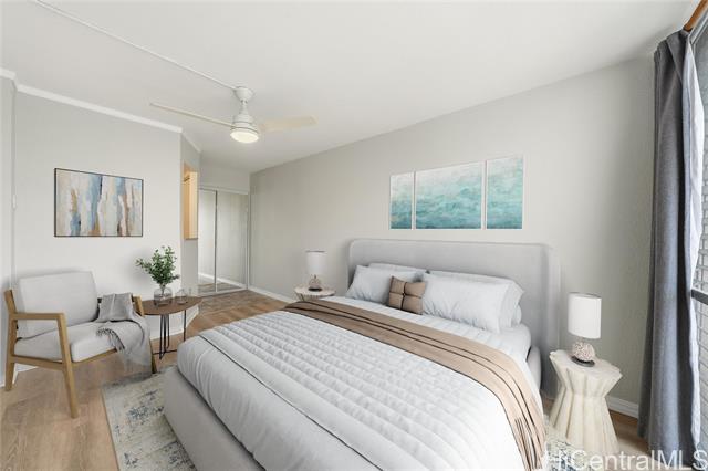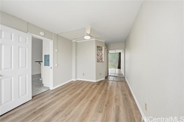E Komo Mai, welcome to Cathedral Point! This Corner 1 bedroom 1 bath unit has been freshly painted throughout. The updated primary bedroom boasts light colored luxury vinyl plank flooring, walls are painted with a tasteful modern touch of soft gray. Ceiling was also freshly painted. Closet was updated and sliding mirror doors installed. The bathroom tub and stall has just been refinished to a clean white.(photos were taken prior to being done, see new 1 photo attached for update) The back of the front door was repainted as well (photos were taken prior into painting, see 1 photo attached for update.). This Pet friendly building(verify with AOAO) also offers a community pool, a park nearby, it's located near Schofield/Wheeler AFB. Mililani Town has Theaters, Shopping, Restaurants and more. Easy freeway access Come see it today! 3-5pm OPEN HOUSE this Sunday Nov 8th