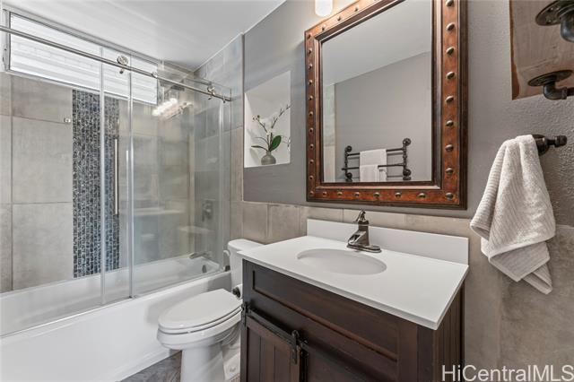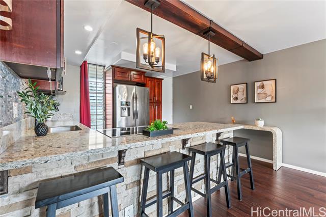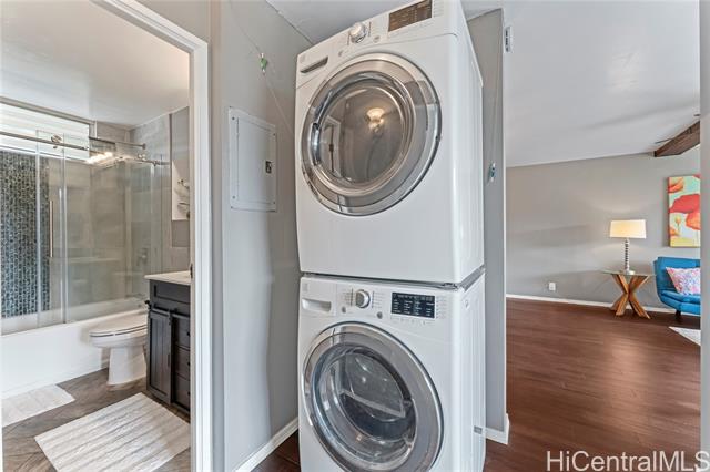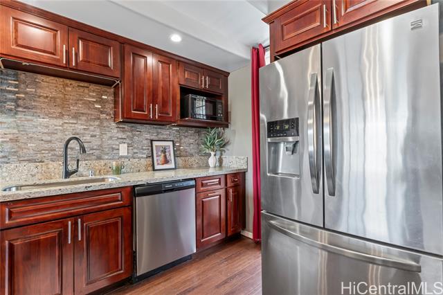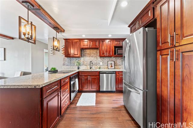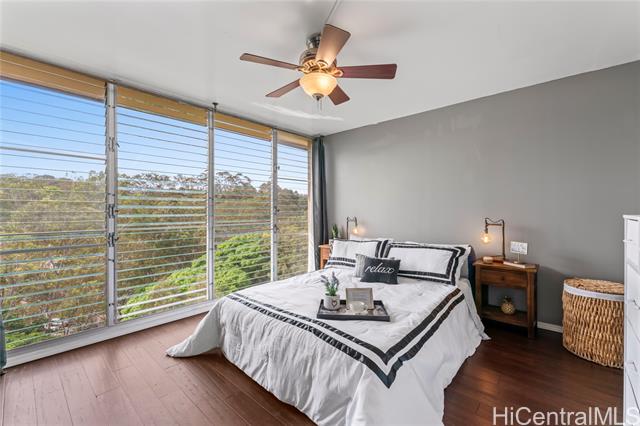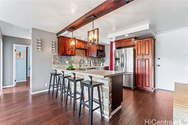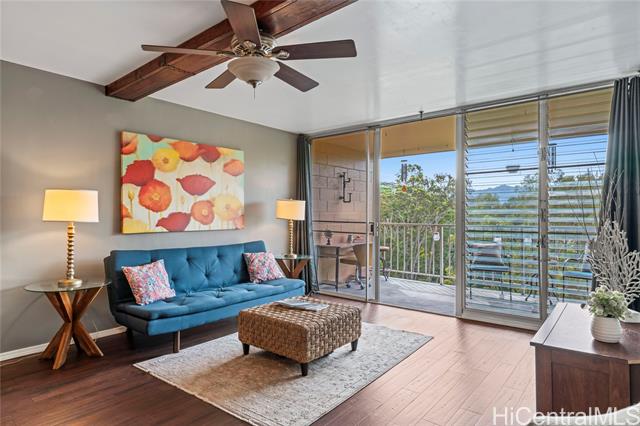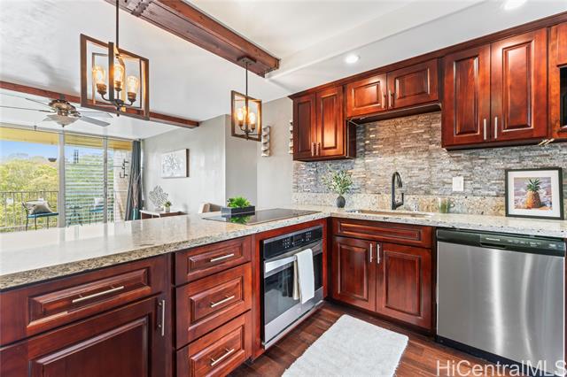 Treetop breezes and gorgeous valley views from this uniquely renovated 2 bedroom, 1 bathroom, 2 parking (one covered), condo with in-unit laundry (in the hallway, NOT in the kitchen)& external storage area. Kitchen features upgraded cabinets and appliances, stone countertops and backsplash, pendant lights and breakfast bar overlooking living room. Living room features wood beam ceiling, with ceiling fan and access to the lanai with gorgeous, breezy views (You can even see the swimming pool!). Storage area approximately 6' x 6' and located on the 9th floor. Two assigned parking spaces, one covered on the second floor and one uncovered on the third floor. You DON'T have to walk up any stairs to get to the unit from the parking stalls. There are walking bridges to the building from both stalls. Maintenance fee covers sewer, water, trash, cable and internet. 5 minute drive to Wheeler Army Airfield. 10 minutes to Schofield Barracks and NCTAMS. 15 minutes to HMR. 25 minutes to JBPHH. 30 minutes to Fort Shafter/Camp Smith. *School zones obtained from Hawaii DOE School Finder website. Buyer to verify.