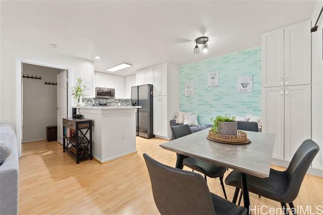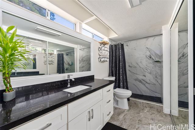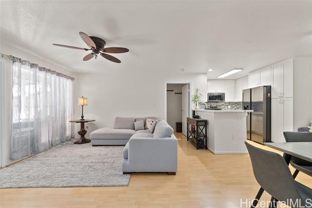 Discover privacy and modern comfort in this renovated corner end-unit in Launani Valley. Surrounded by lush hillside views and accessed by a private back stairway, this home has been thoughtfully upgraded throughout. The kitchen features white shaker cabinetry, marble-style quartz counters, a glass tile backsplash, sleek black stainless appliances, and a cozy breakfast nook with built-in seating and storage. Both bathrooms have been transformed with new vanities, modern lighting, and elegant tilework—including a stunning walk-in shower in the primary suite. The dual-suite layout offers spacious bedrooms on opposite sides of the home, each with direct access to the covered lanai and open yard space, ready for your imagination, gatherings, or indoor-outdoor living. Includes 1 covered and 1 open parking stall with storage. Enjoy community amenities including a pool, hot tub, playground, walking paths, and car wash.