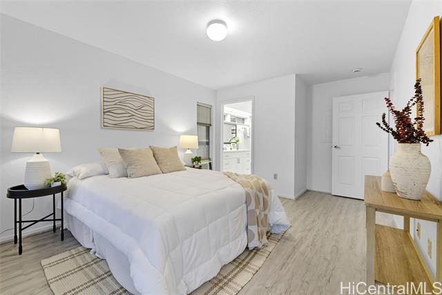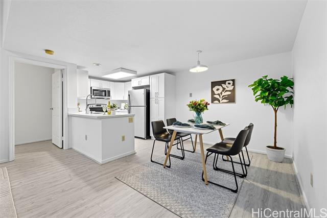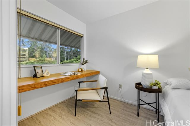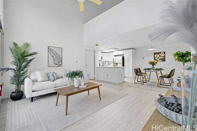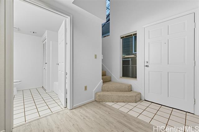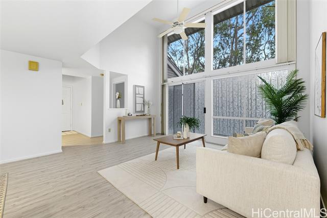 E Komo Mai! Welcome to this beautifully remodeled 3-bedroom, 2-bath split-level residence in Evergreen Terrace, offering a serene and tranquil setting. Upgrades include luxury plank flooring, fresh interior paint, and refreshed bathrooms with new vanities, toilets, and reglazed showers. The bright, open layout flows seamlessly, with a versatile loft space ideal for an office, guest room, or private retreat. Enjoy the convenience of two assigned parking stalls (one covered, one open) plus ample guest parking. Community amenities—pool, whirlpool, BBQ area, and playground—make it easy to relax and entertain. Perfectly located near shopping, dining, and major thoroughfares, this move-in-ready residence is truly a must-see.