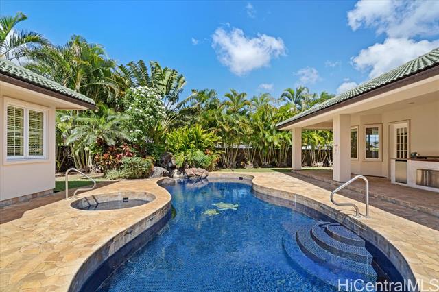 Experience the perfect blend of island elegance and modern comfort in this rarely available single-level custom home. The open layout with high ceilings flows into a chef’s kitchen with Viking and Sub-Zero appliances—perfect for casual meals or entertaining friends. The expansive primary suite offers relaxing views of the pool and garden, plus a spacious closet and spa-like bath. A second suite with its own entrance and bath adds flexibility for guests or a caretaker. Just outside is your own retreat with a lava rock waterfall, saltwater pool, and spa surrounded by tropical landscaping—ideal for unwinding or weekend gatherings. Natural light fills the home, while central and split A/C keep it comfortable year-round. A two-car garage, full lava rock wall, tile roof, and 44-panel PV system add convenience and efficiency. Close to markets, restaurants, schools, beaches, parks and freeway access, this home blends elegance, comfort, and unmatched convenience.