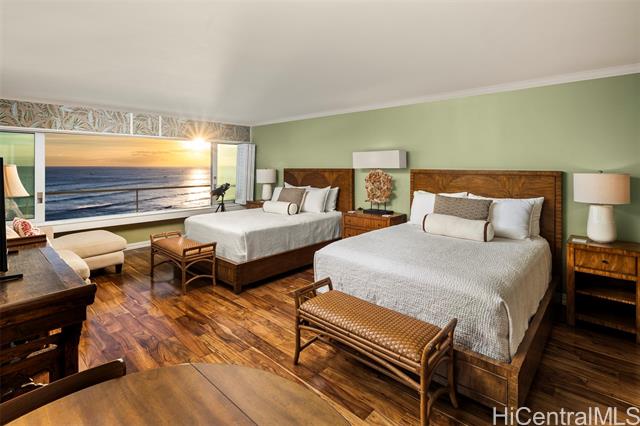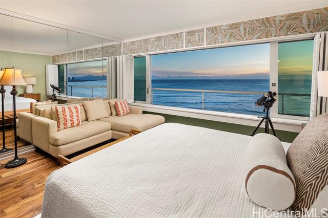 TIMELESS BEACHFRONT LIVING WITH FRONT ROW VIEWS. Perched in a prime front row setting within the iconic Colony Surf, this beautifully renovated studio residence offers an exceptional opportunity to enjoy oceanfront living along one of Oahu’s most coveted sandy beachfronts. The residence captures stunning views of the Pacific Ocean and is filled with natural light, creating a warm and inviting island-inspired interior. Rich acacia wood flooring brings warmth and a relaxed island style. The thoughtfully designed kitchen features custom mahogany cabinetry, granite countertops, open display shelving for china, and a built in cooktop, blending style and functionality. The full bath is beautifully appointed with custom mahogany cabinetry, granite counters, and a walk in shower. A built in washer and dryer adds everyday convenience. Designed for effortless island living, the residence is complemented by the soothing sound of the surf and gentle trade winds. Enjoy immediate beach access and close proximity to Kapiolani Park and Waikiki’s vibrant lifestyle, with acclaimed dining just moments away including Michel’s, Hau Tree, and Arden, making this front row oceanfront residence a true gem.