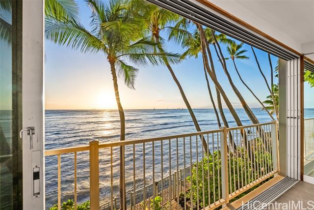 Prestigious Gold Coast Oceanfront end unit with stunning endless ocean views. Only listing at Oceanside Manor. Completely remodeled in 2025. Oceanfront at its best! As you enter you will feel the peace and tranquility of the ocean. Wake up to the magnificent Ocean & Diamond Head views. Listen to the sounds of the ocean - Hawaii living at its best. Enjoy the sunsets every evening. This oceanfront retreat with floor-to-ceiling pocketing sliding doors awaits you. Oceanside Manor has only 2 units per level. Updates: Drop ceiling & recessed lighting, New Italian color-body large format porcelain tiled floors, complete electrical rework including wiring and fully updated/replaced panel, New ceiling fan and light fixtures, All new appliances and finishes, New Ductless washer/dryer combo side access unit, New Split AC system, Relocated New Custom water heater cabinet with full removal access for maintenance. Red Balau–Luxury Tropical Hardwood and so much more! A must see. Located close to the Elks's Club, Outrigger Canoe Club, Michel's famous beachside restaurant, Kapiolani Park & more. Located in the quiet section of Kalakaua Ave. This building is fully insured. Easy to see.