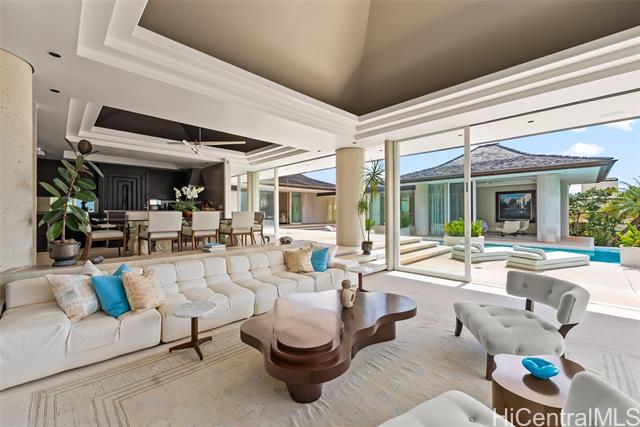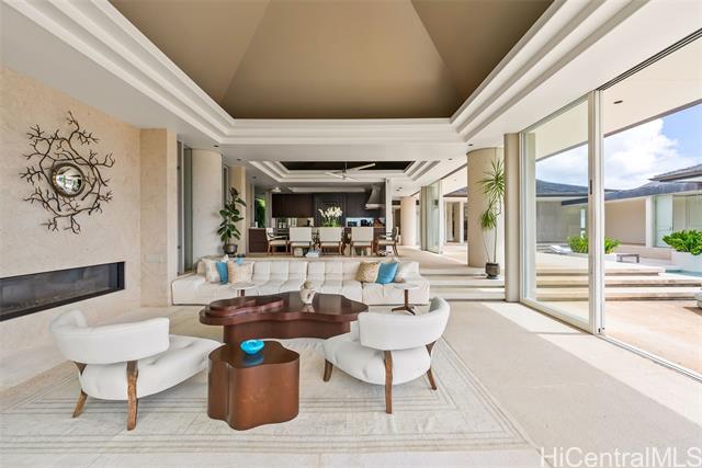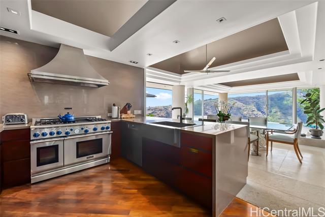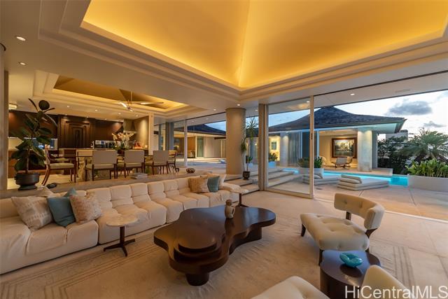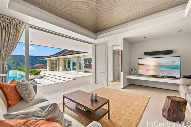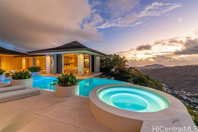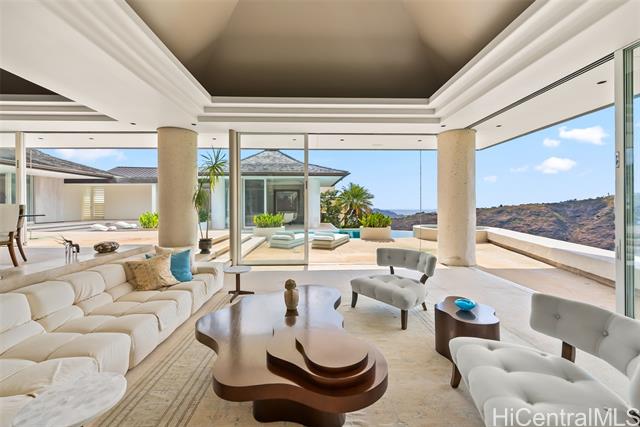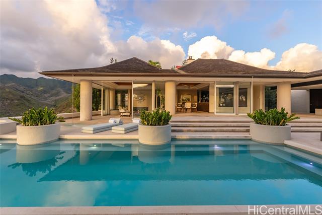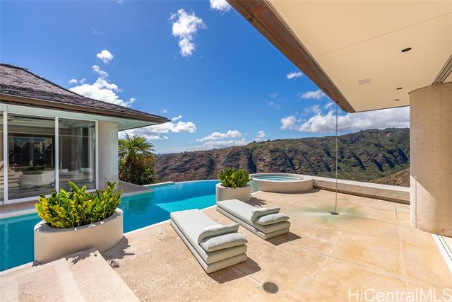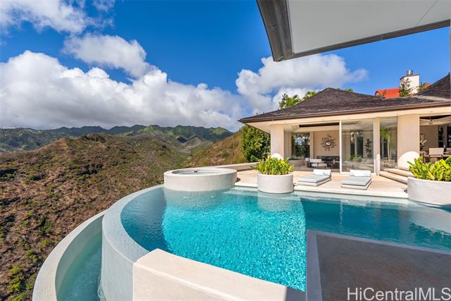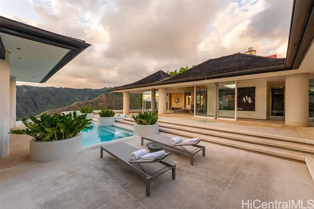 Perched atop the prestigious gated community of Hawaii Loa Ridge, The Summit Retreat House is a rare architectural gem designed by renowned architect Norman Lacayo. Blending timeless design with tropical elegance, this 3-bedroom, 3-bath home features an open floor plan with rich mahogany details, natural stone finishes, and an interior garden that brings the outdoors in. Expansive floor-to-ceiling windows frame panoramic views of both the Pacific Ocean and the majestic Ko'olau Mountains, filling the home with natural light and a sense of serenity. Positioned on a rim lot, the property captures some of the most breathtaking sunsets on Oahu. Enjoy an infinity-edge pool and spa overlooking the ocean, and a chef’s kitchen equipped with high-end appliances designed for both everyday living and entertaining. Located within the secure gates of Hawaii Loa Ridge, this residence offers privacy, serenity, and easy access to Honolulu’s best shopping, dining, and beaches. The Summit Retreat House is more than a home—it’s a refined retreat above it all, where modern design meets Hawaii’s natural beauty.