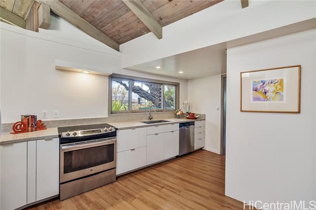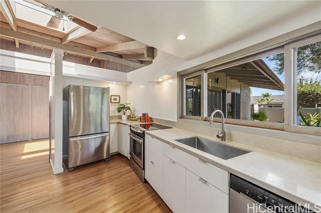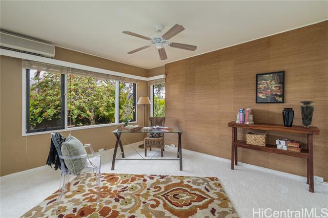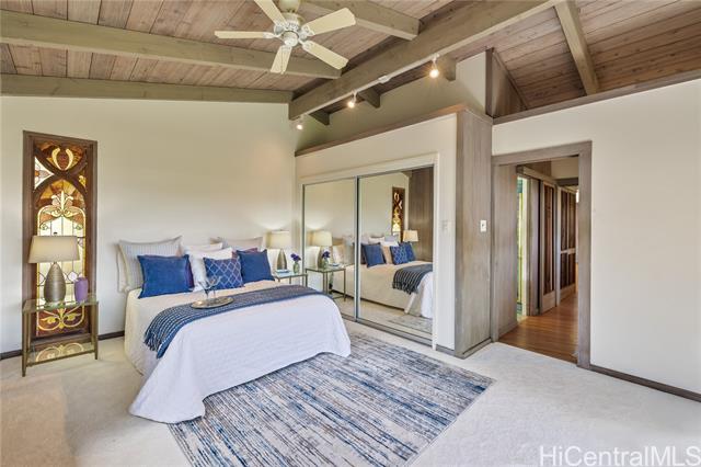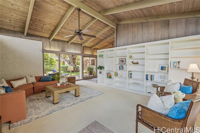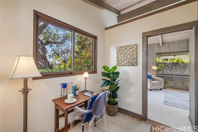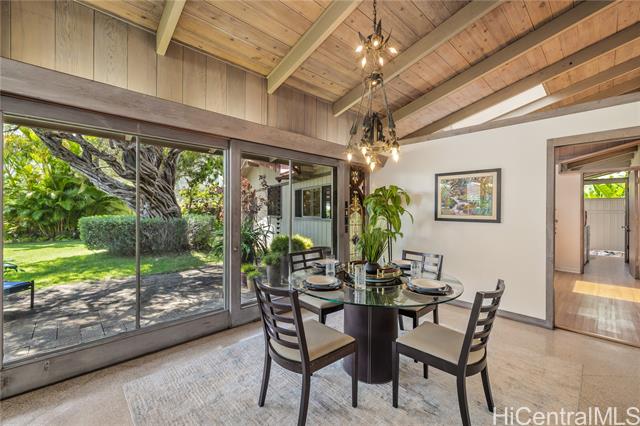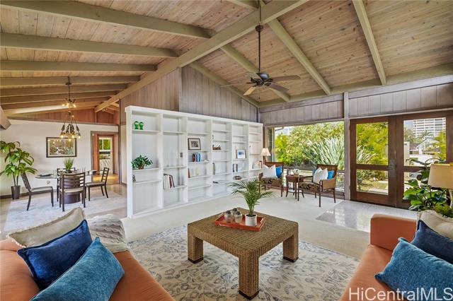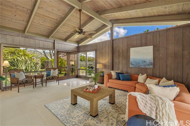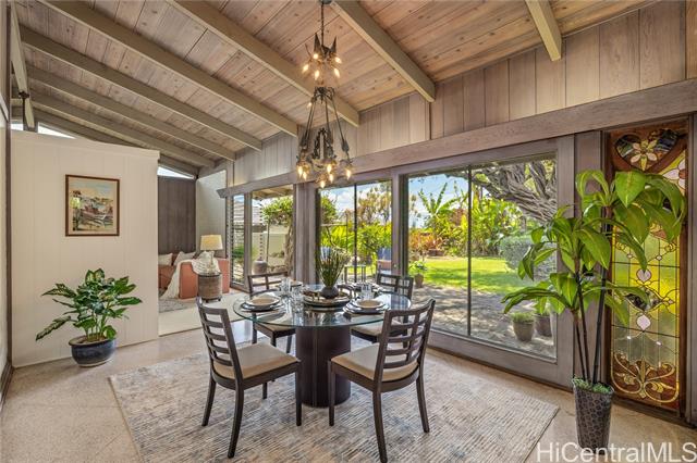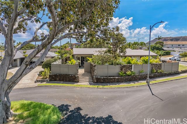 First open house Sunday October 5th 2:00 p.m. to 5:00 p.m. Discover this mid-century modern single-level home with mountain views perfectly situated on a spacious corner lot. Thoughtfully designed for both style and comfort, the home offers three bedrooms, each with its own private en-suite bathroom. Large windows invite natural light throughout, highlighting the home’s clean lines and timeless design. The expansive living room and dining room have soaring ceilings, natural wood walls, and the dining room has a Terrazzo floor, true to the era of the home. The fully fenced property features a serene backyard anchored by a stunning olive tree, offering both beauty and privacy for outdoor living and entertaining. Ideally located in a cul-de-sac, close to the beach, and Kahala Mall with Whole Foods, movie theaters, boutique shops, and restaurants. This property also has easy freeway access. Living and garage square footage are as per 2022 appraisal. Don't miss this architectural gem.