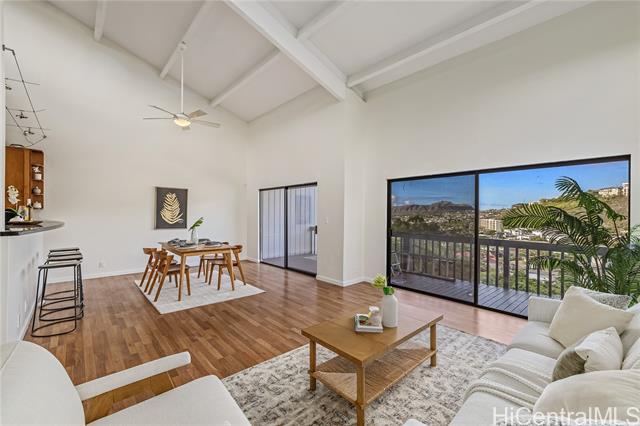 Rare find, a great buy! Welcome to Kahala View Estate, 4-bedroom (4th bedroom has no closets) , 2.5-bath split-level townhome offering spectacular Diamond Head, ocean, mountain, and city views. Perched above Kahala in a secure gated community, this residence combines privacy, convenience, and timeless island elegance. Step inside to an open-concept living and dining area with high ceilings, abundant natural light, and a seamless flow to the spacious lanai-perfect for entertaining or unwinding while enjoying panoramic vistas. The upgraded kitchen features sleep cabinetry, Quartz countertops, and Stainless Steel appliances. The primary suite includes a private balcony, walk-in closet, and an ensuite bath. Residents of Kahala View Estate enjoy resort-style amenities including a swimming pool, tennis courts, BBQ area, and walking paths surrounded by lush tropical landscaping. Conveniently located just minutes from Kahala Mall, Waialae Country Club, top-rated schools, and world-class beaches, this home offers the best of island living on one of Honolulu's most desirable neighborhoods. Unit needs little TLC, to be sold strictly "As Is". Seller will not accommodate any repairs.