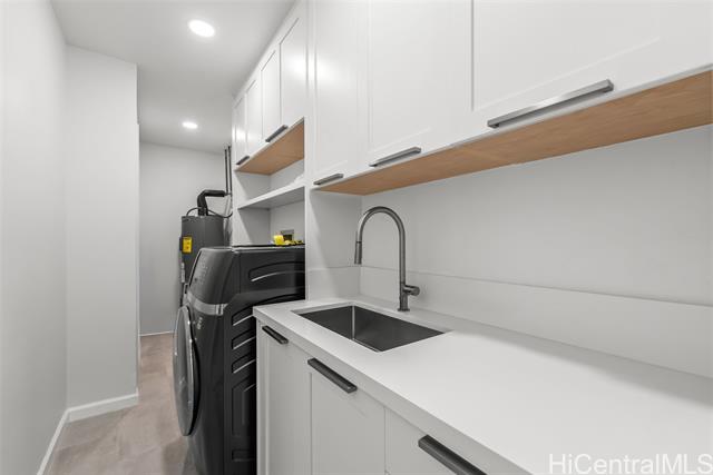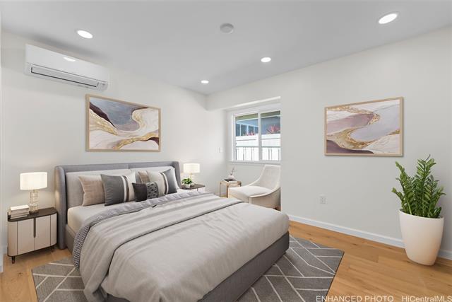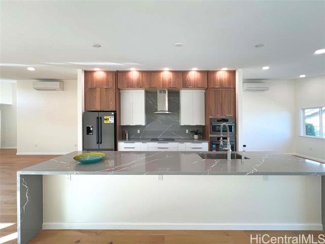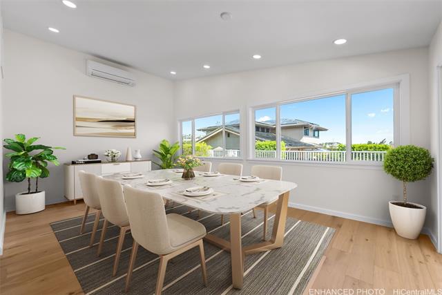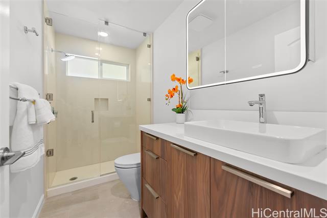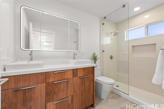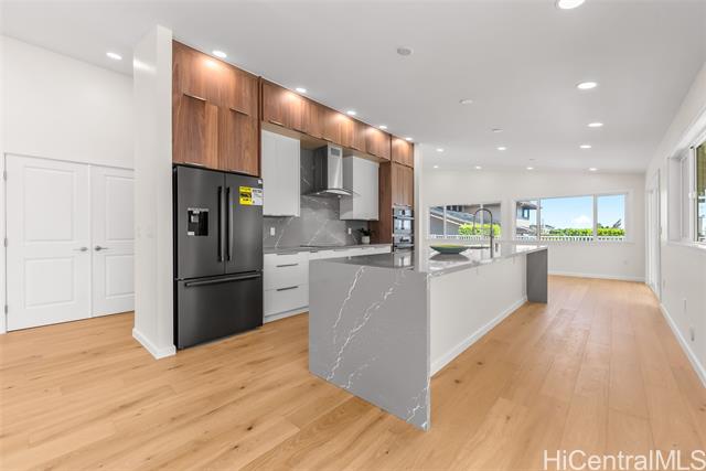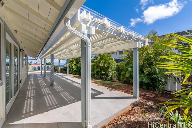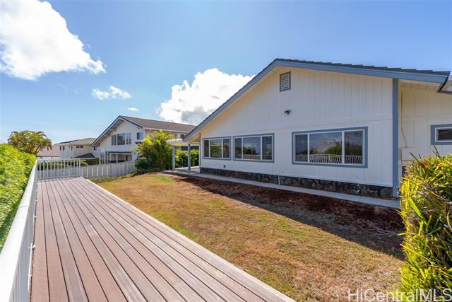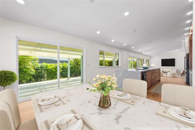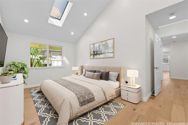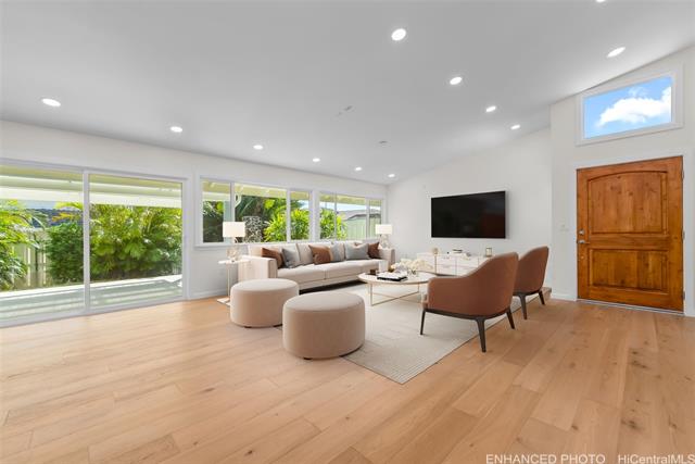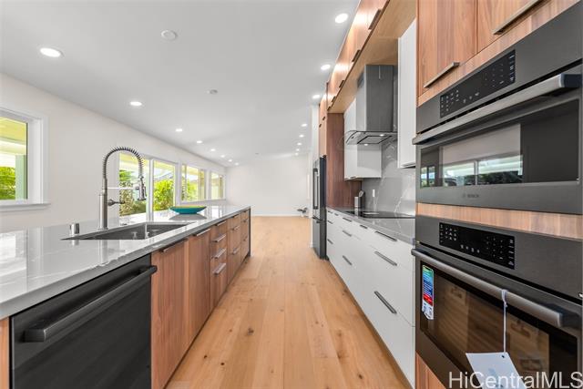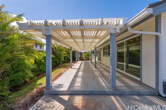 Nestled within the exclusive gated community of Waialae Iki V, this beautifully fully renovated single-level residence blends contemporary elegance with island living. Featuring three spacious bedrooms and three full bathrooms, this home offers a seamless blend of luxury, functionality, and comfort. Step inside to discover soaring ceilings and rich wood flooring that flows effortlessly throughout the open-concept living spaces. All bathrooms are finished with sleek porcelain tiles, Toto toilets, and frameless glass-enclosed showers, creating a spa-like experience in every suite. At the heart of the home is the designer kitchen outfitted with high-end, natural wood-faced cabinetry, a striking waterfall-style island, and brand-new luxury appliances. Enjoy an abundance of natural light thanks to strategically placed skylights and quality aluminum roof shingles that add both style and durability. The home is surrounded by tropical landscaping with an open lawn, covered lanai, and an expansive open deck—perfect for indoor-outdoor living and entertaining.