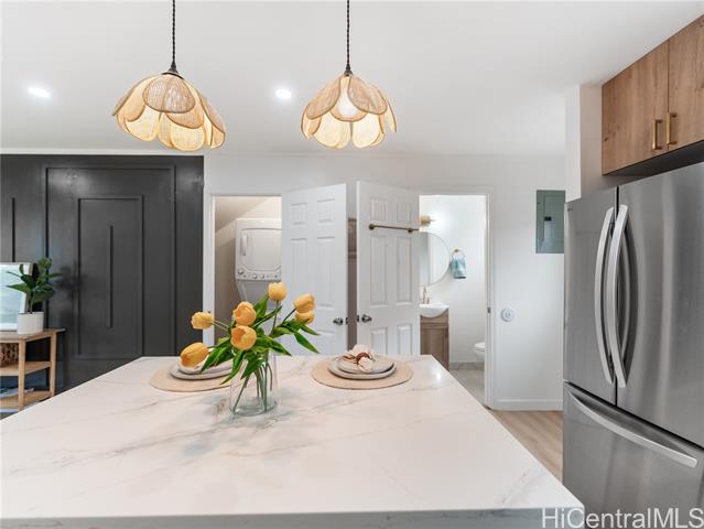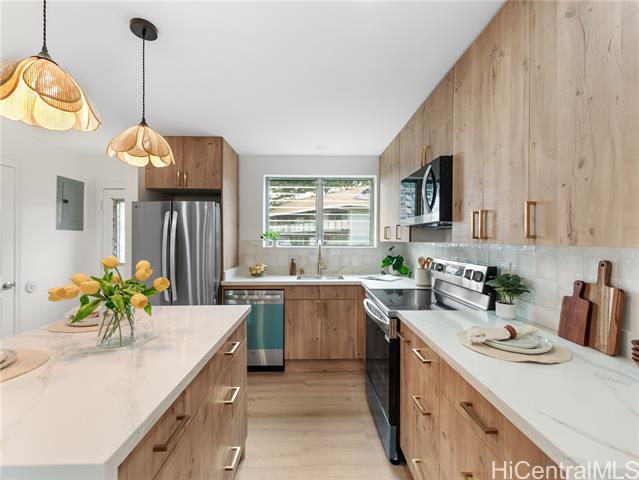 This beautifully renovated, pet-friendly townhome offers over 1,000 sq. ft. of modern living space. Fully remodeled in 2025, this 2-bedroom, 2-bath residence showcases a tasteful contemporary design with quality finishes throughout. Enjoy peace of mind knowing that all major association improvements have already been completed for this unit — including a new roof, fresh exterior paint, new sidewalks, updated landscaping, and a newly paved parking lot. Additional upgrades such as exterior water drains add everyday convenience. The location offers the perfect mix of charm and convenience. You’ll be just moments away from Kuono Marketplace, home to Foodland, Purvé Donuts, and Lanikai Juice, with Kahala Mall right across the street. Easy access to H-1 makes commuting a breeze. Don’t miss this rare opportunity to own a beautifully updated home in the highly sought-after Waialae Nui–Kahala neighborhood!