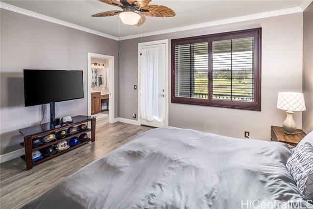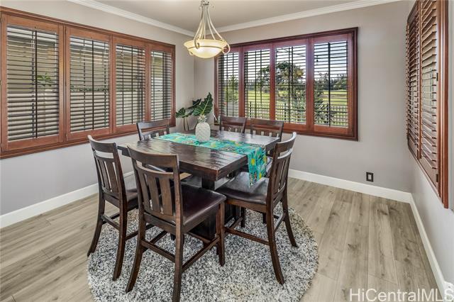 A refined golf-course–front residence offering generous living spaces and thoughtful updates throughout. Located minutes from the beach park and a major shopping center with grocery, dining, and everyday conveniences, this home balances leisurely retreat with practical living. Four bedrooms include a private ground-floor suite with a full bath—ideal for guests or multigenerational needs—while a welcoming Ohana room on the second floor creates a bright, flexible gathering space. Plantation shutters accent nearly every window, lending a tailored, finished look. Recent improvements include a three-year-old HVAC system (new evaporator and condenser), a 2024 GE Profile refrigerator, updated microwave, brand new solar hot water heater and an easy-care artificial lawn framing the backyard. Situated in a friendly, distinguished community with no onerous HOA fees, the property comes with a pre-listing inspection; the inspector is available to walk the home at no cost to buyers upon opening escrow. Ready for discerning buyers seeking comfort, style, and convenience.