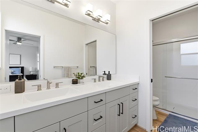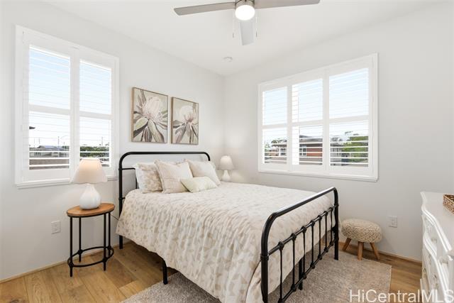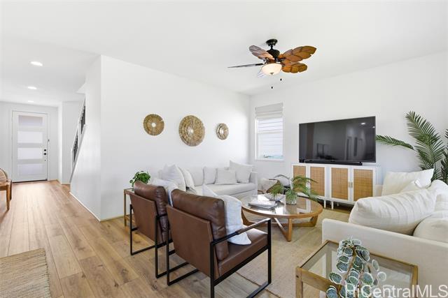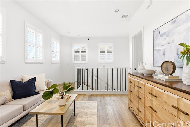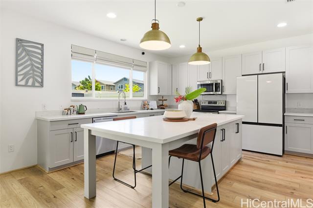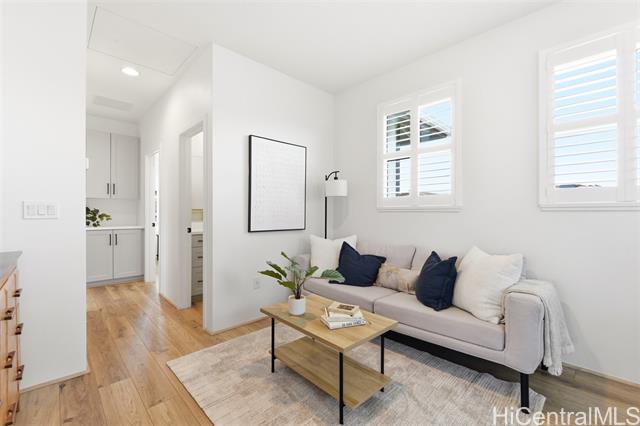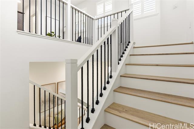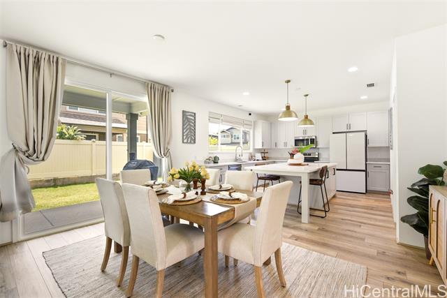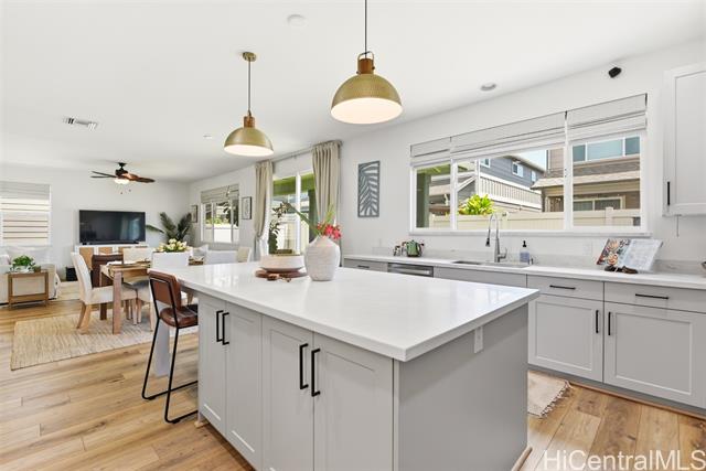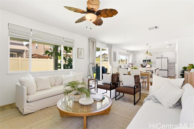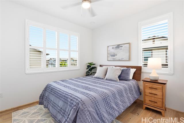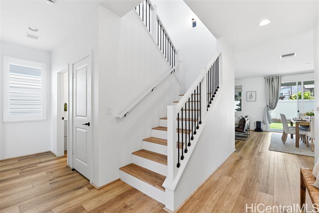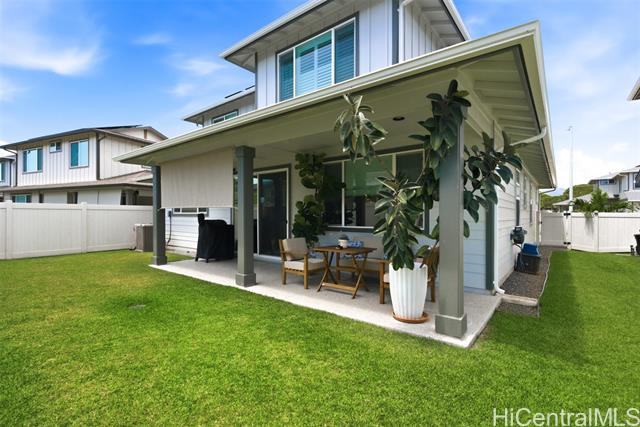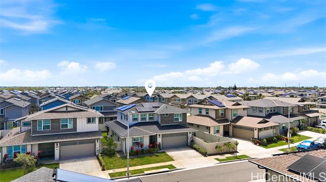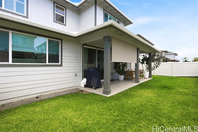 Tucked at the end of a cul-de-sac in Makamae, this 2023-built home checks the boxes buyers are actually looking for. Eighteen owned solar panels paired with two batteries keep energy costs right around $100/month. Inside, you’ll find upgraded long-plank LVP throughout, custom shutters upstairs and in the downstairs guest room, and woven natural shades that give the main living areas a clean, elevated feel. The layout is just as functional as it is thoughtfully finished, with a highly sought-after first-floor bedroom and full bath making this home ideal for guests or multi-generational living. Additional upgrades include an EV charger, concrete-coated garage and patio (complete with sunshade), plus French drains and irrigation already installed in the backyard. HOA is just $65/month. All of this in a location that puts you minutes from White Plains Beach, Wai Kai, Ka Makana Ali‘i, Laulani Village, and key military bases including Schofield and Barbers Point.