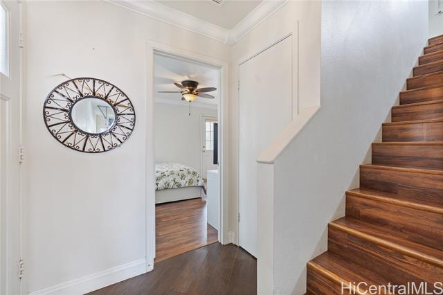 This rare offering presents a detached single-family home thoughtfully designed for comfort and flexibility. A primary suite on the ground floor provides effortless access from the garage to the bedroom and onward to the yard—an inviting access to your own outdoor space. Second Floor offer 2 bed 1 bath open kitchen layout with additional features including plantation shutters, an open-concept kitchen, refined crown molding, and a maintained interior style.