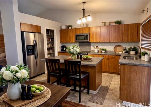 Beautiful single-family home in Ewa by Gentry Prescott featuring a spacious open floor plan and soaring vaulted ceilings that create a bright and inviting atmosphere. This well-maintained residence offers comfort and modern island living with an owned photovoltaic system and Tesla battery for energy efficiency and savings. The flexible layout includes a full bedroom and bathroom on the first floor, ideal for guests, extended family, or a home office. The kitchen offers ample cabinetry, generous counter space, a large pantry, and an island with countertop seating, opening seamlessly to the main living areas for easy entertaining. Relax under the covered lanai, perfect for gatherings or enjoying the private yard. Additional features include central AC and a lawn sprinkler system. Conveniently located near parks, golf courses, beaches, and Kapolei shopping, dining, and entertainment. First available showing is 4/1/26.