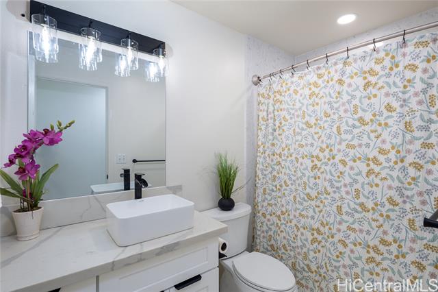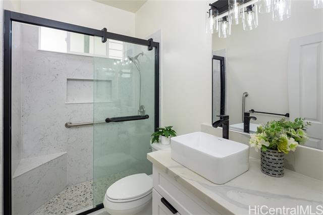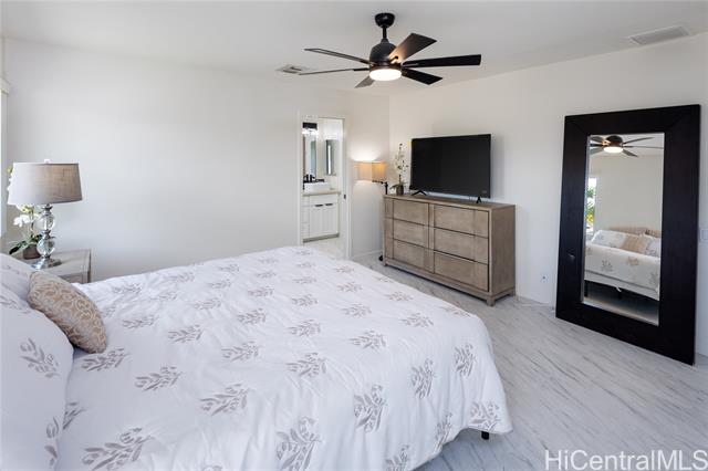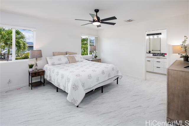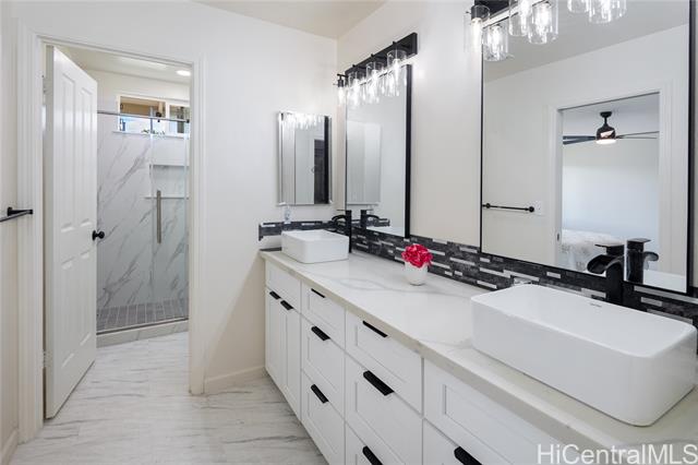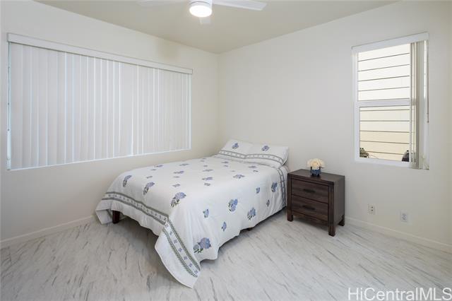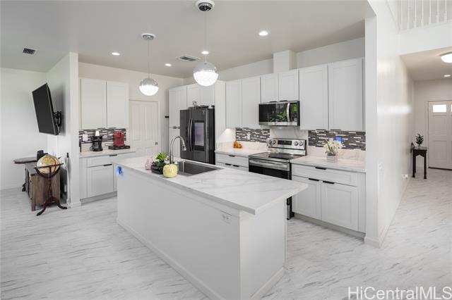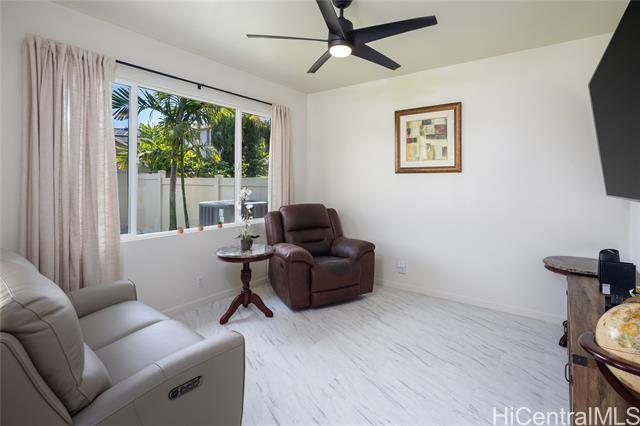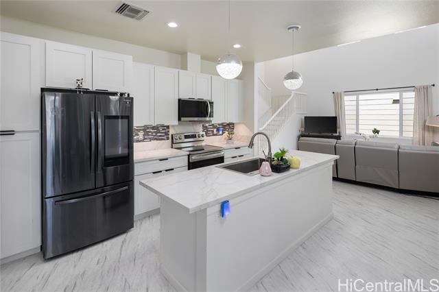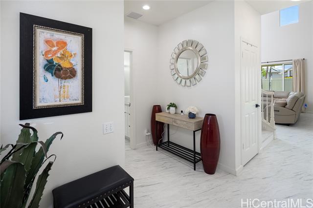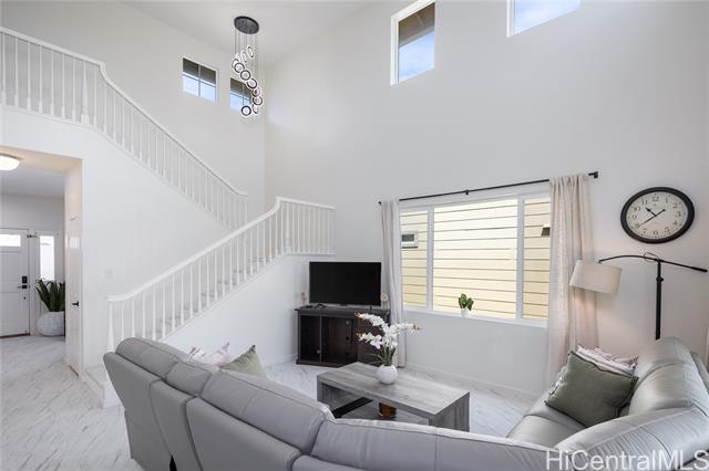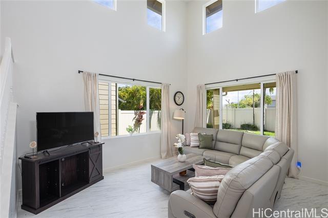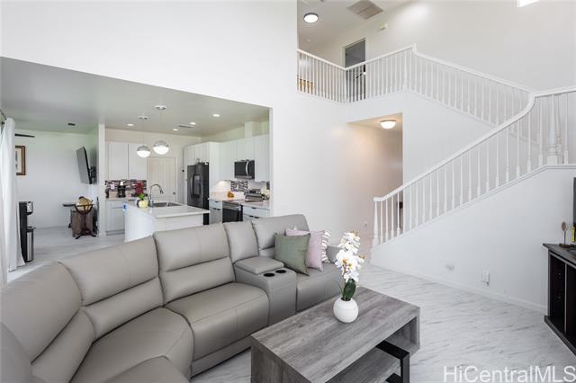 Stunning and fully upgraded, this Ewa Beach home is ready to impress. With NO MAINTENANCE FEES, it offers modern style and everyday convenience. The kitchen has been completely remodeled with custom cabinetry and sleek counters, creating a centerpiece that is both beautiful and functional. The living room opens to soaring two-story ceilings that fill the home with natural light and highlight the elegance of the open layout. Bathrooms have been thoughtfully redone with stylish vanities, tile, and fixtures, giving each space a fresh and refined feel. A BEDROOM and FULL BATH on the GROUND FLOOR provide comfort and flexibility. All NEW WINDOWS were just installed, adding style and reliable functionality throughout the home. Step outside to the spacious covered lanai, perfect for enjoying the beauty of Hawai‘i, and a generous yard with ample room to make it your own. Parking is easy with an oversized two-car garage and additional driveway space. Located on a cul-de-sac, this home blends upgraded interiors, versatile outdoor living, and a convenient location near shopping, schools, and recreation. All furniture is available for purchase under a separate bill of sale.