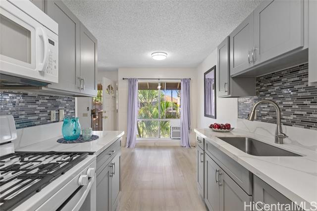 ** Move-In Ready Upstairs Corner Unit with Renovated Kitchen & Bath!** Looking for a stylish, move-in ready home? This beautifully renovated upstairs corner unit, updated in 2021, offers modern comfort & convenience. Enjoy elegant vinyl plank flooring in the hallway kitchen and living room areas, carpet in the bedrooms, updated lighting, high-quality ceiling fans, & a sleek kitchen featuring white quartz countertops, grey cabinets, matching backsplash, refrigerator, and microwave. The bathroom has also been tastefully updated with a new bathtub & contemporary shower tile work. This home comes with two parking stalls—one covered and one open—and is located just steps from the community pool and recreation area. With affordable maintenance fees of $636.92/month and HOA dues of $50/month through Ewa by Gentry, it’s a great opportunity for first-time homebuyers as the building is VA approved. Pet-friendly (check house rules for specifics) and perfectly located near shopping, gas stations, & convenient freeway access, this unit offers everything you need and more. Don’t miss your chance to own a beautifully updated home in a great Ewa location!