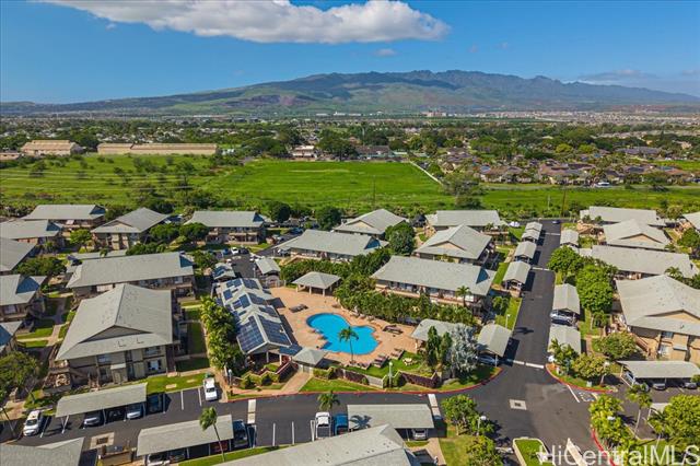 Welcome to Palm Court, a desirable gated community offering comfort and island living. This upstairs 2-bedroom, 2-bath condo features a spacious layout and an oversized lanai with mountain and sunset views- perfect for relaxing or entertaining. Enjoy resort-style amenities including a pool, BBQ area, and clubhouse. Two assigned parking stalls, including one covered, add convenience. VA loan assumption available, offering a unique opportunity for qualified buyers. A wonderful opportunity to enjoy privacy, security, and the best of Hawaii living.