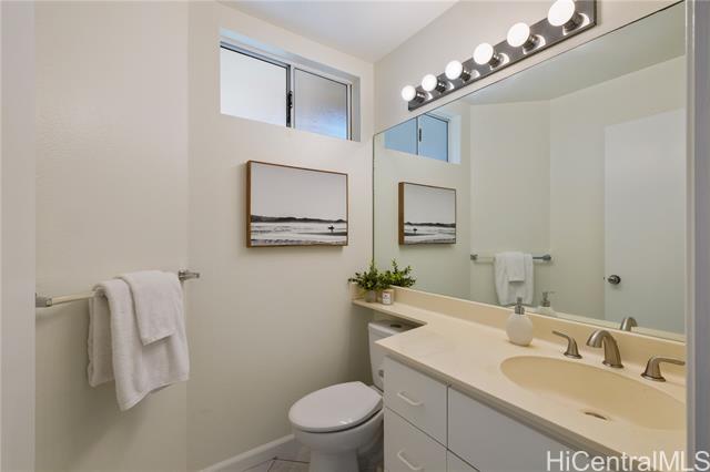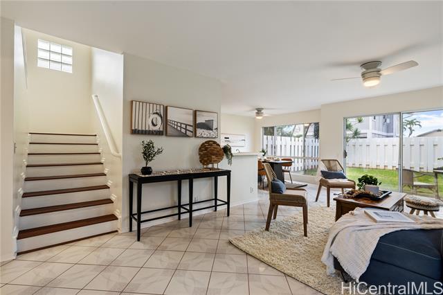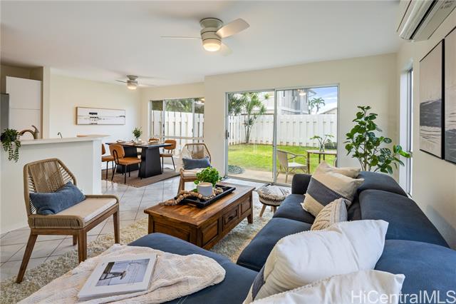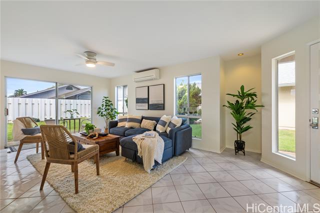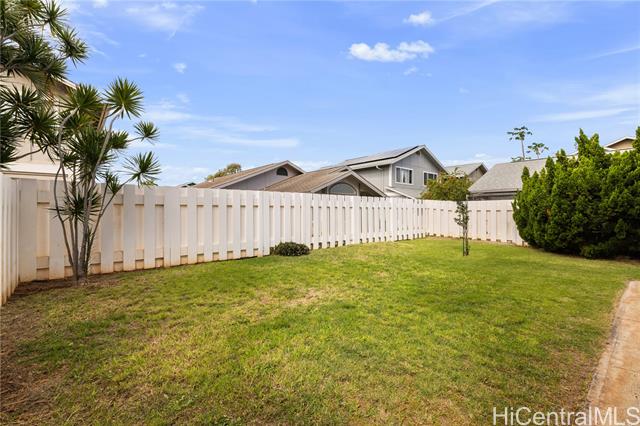 Priced WELL below its taxed assessed value and priced to sell, this 3-bedroom, 2.5-bathroom home in the desirable Sun Terra neighborhood of Ewa Beach is ready for its new owner. Situated on one of the larger lots (over 4,000 sq. ft.) at the end of a quiet cul-de-sac, it offers added privacy. Recent upgrades include fresh interior paint and removal of popcorn ceilings. The primary bedroom features a split AC unit with an en suite. Durable laminate and ceramic tile flooring throughout. Split AC in main living area keep the kitchen and living room cool and comfortable. Enjoy a fully fenced wrap-around yard and a spacious outdoor area—perfect for families, entertaining, a children’s play zone, or a garden. Additional perks include a two-car garage with extra driveway parking and a low HOA of $50/month. Convenient access to neighborhood shopping, beaches, schools, parks, golf courses, and Fort Weaver Road. Priced to reflect buyer upgrades. Sold As-Is.