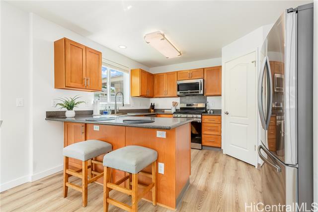 NEW PRICE. Ready to go. Check out the entertainment-ready backyard. Welcome to the Ho'onani community in Ewa Beach on the West side of Oahu. Built in 2014, this 3 bedroom/2 1/2 bath home has been updated with new solid surface flooring, new appliances & freshly painted interior. Located on the corner, this attached, single-family residence includes 13 leased Photovoltaic panels, a 2-car garage, extra parking in the driveway, a fully fenced and landscaped backyard with a covered patio. Enter an open and spacious living area with a separate dining space adjacent to the kitchen. The kitchen features new stainless steel appliances and a gas stove. The half bath is conveniently located on the first floor. At the top of the stairs there is a multi-use space that could be used as an office or play area. Upstairs there are three bedrooms and two full baths. The primary bedroom is spacious and includes a walk-in closet, ensuite bathroom with double sinks and a tub shower combination. Ewa Beach has shopping, schools, dining, parks and beaches are nearby. Please schedule private showings.