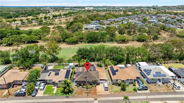 Golf Course Frontage Home in Historic Ewa Villages this home has many great features from the open living room and dining room along with a nice expanded primary bedroom, extended car-port, owned photovoltaic system and more. The special features of this property include a large cover patio of 428 sq ft which may be accessed from the kitchen area and primary bedrooms. The large covered patio area leads the lush manicured yard perfect for entertaining family and friends. Within minutes to Ka Makana Alii Mall, and White Sandy beaches. Come and See this great buy before it is gone. VA ASSUMABLE RATE AT 3.75%.