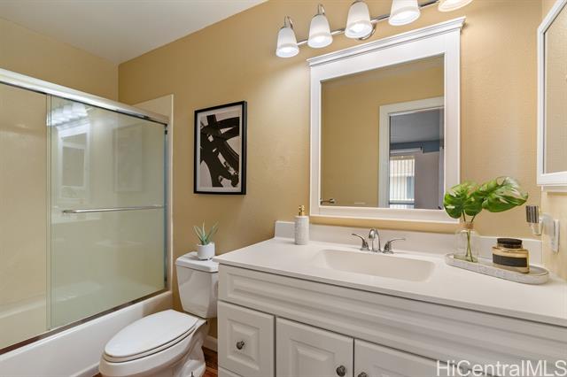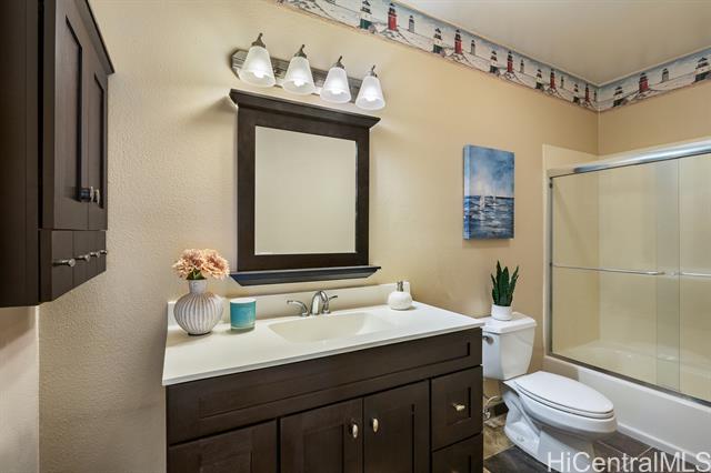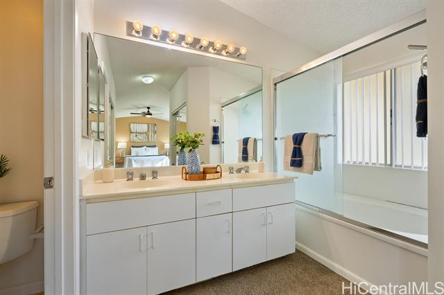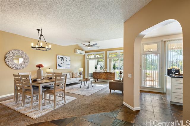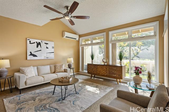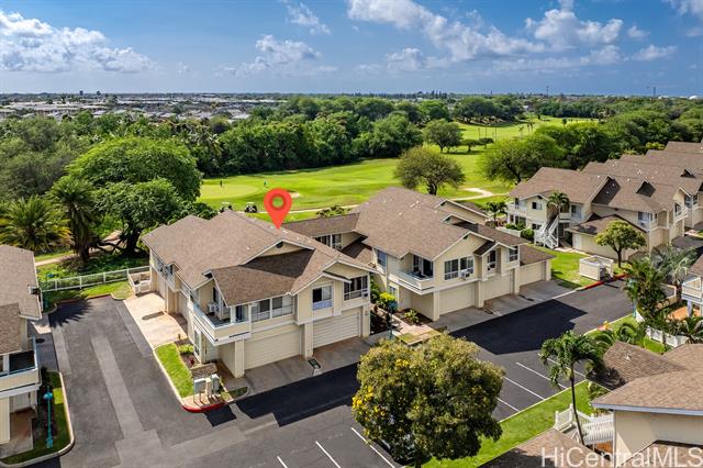Golf Course Views at The Arbors! Enjoy tranquil fairway views from this spacious 3-bedroom, 3-full-bath townhouse that lives like a single-family home. The open-concept living, dining, and kitchen area is ideal for everyday living and entertaining. A convenient first-floor bedroom and full bath offer flexibility for guests, a home office, or multigenerational living. Enjoy your morning coffee or evening beverage on the private lanai overlooking the 5th green of the Coral Creek Golf Course. The expansive primary suite features two large closets and a relaxing retreat-like feel. The second bedroom upstairs features a Murphy Bed, perfect for guests! Separate downstairs laundry room with full size Washer & Dryer, sink and plenty of storage. Additional highlights include a 2-car attached garage, secure gated community access, community pool and clubhouse, and plenty of guest parking conveniently located in front of the property. Ideally situated close to shopping, dining, golf courses, beaches, and the H-1 Freeway, this home offers comfort, convenience, and low-maintenance living. VA Assumable Loan at 2.875% rate with monthly payment of $2600; balance of loan is approximately $463,000.