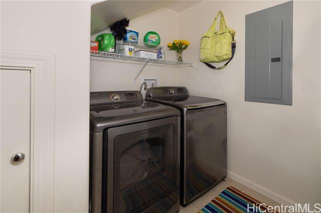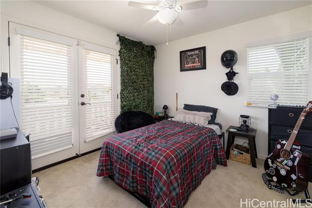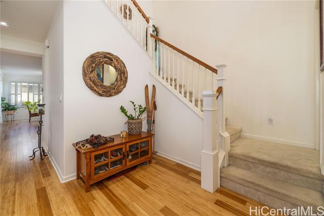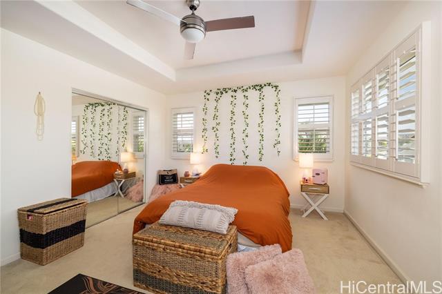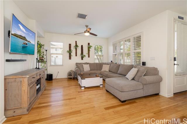 Spacious 4-bedroom, 2.5-bath home on a corner lot, featuring Berber carpeting upstairs, upgraded shaker cabinets, 42 NEW windows, plantation shutters and a large yard perfect for outdoor enjoyment. The primary suite offers an ensuite bathroom with a garden soaker tub and step-in shower. Energy-efficient photovoltaic panels help keep utility costs low. Conveniently located near shopping, Wai Kai and the esteemed Hoakalei Country Club. Monthly association fees cover essential amenities such as internet, basic cable, access to a dog park, and resort-style recreation center with tennis and pickleball courts, pool and hot tub.