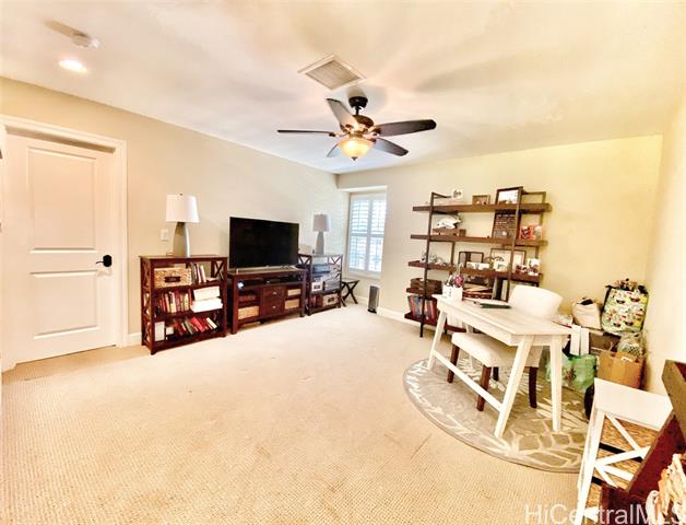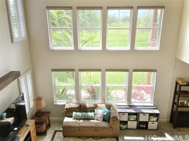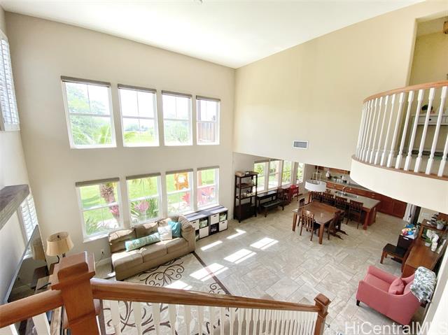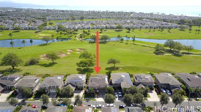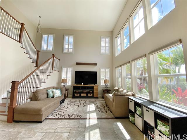 Charming, well-maintained and rarely available golf course home in Kamakana at Hoakalei resort area. This 6510 series home is situated along the 9th hole of the Hoakalei Country Club golf course. The spacious layout features modern finishes, with an open concept design that allows for easy flow between the living, dining, and kitchen areas, ideal for both relaxing and entertaining. Featuring a family-style floor plan, with 4 bedrooms and 3 full baths, a full bed and bath downstairs, and a large loft upstairs. Home includes 21 OWNED panel PV and solar water heater, custom wrapped-around sidewalk with natural quartzite stones all around, new sprinkler system, 5 security cameras, freshly paint interior, new AC condenser, a fully-equipped kitchen with stainless steel appliances, sleek countertops with plenty of cabinet space, plantation shutters, and remote operated shades for the gorgeous views to the golf course. The bright and airy living spaces area accentuated by natural light streaming through large windows, making the home open & inviting. Enjoy the private fences-in backyard, offering a peaceful space for outdoor gatherings or quiet relaxing afternoon.