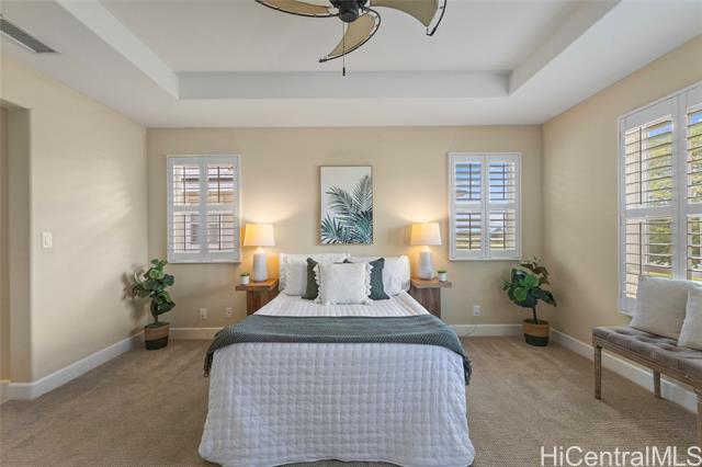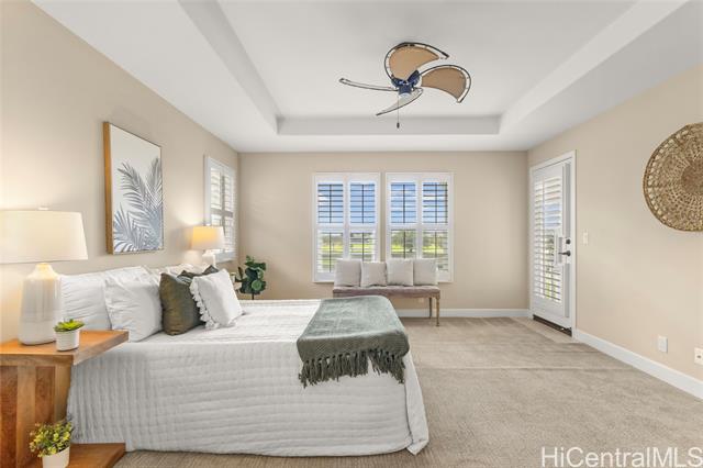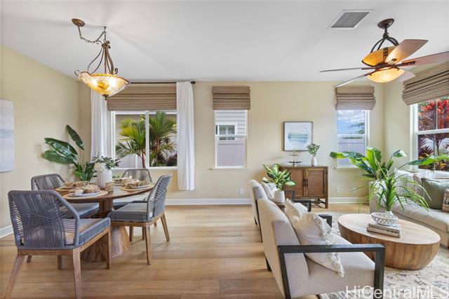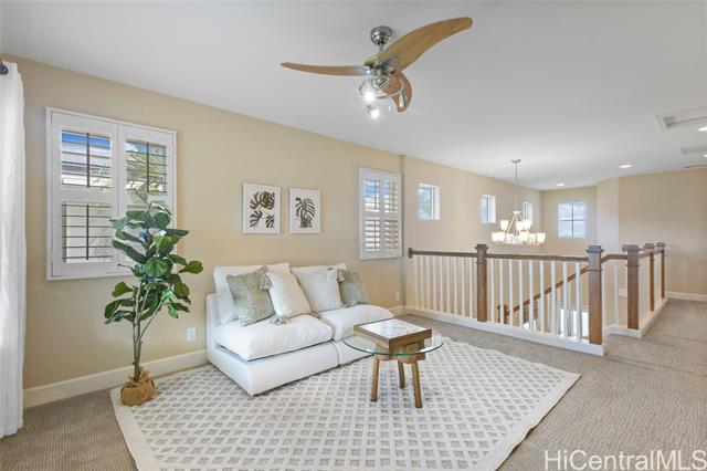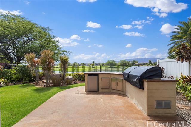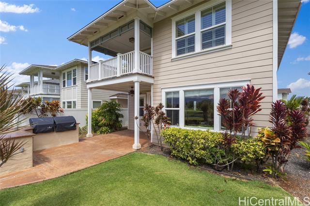 Now with Seller offering $20,000 Credit toward closing! Enjoy golf course views from this island oasis home. Overlooking the fairway of Hoakalei Country Club, this stunning 4 bed, 3 bath home offers an unmatched blend of comfort and island elegance. Its thoughtful design creates a seamless flow between indoor and outdoor living. The heart of the home is a modern, open-concept kitchen outfitted with granite countertops, stainless steel appliances and custom cabinetry. Just outside, the covered lanai leads to lush green space and a patio, featuring built in gas grills. Whether you’re preparing a meal or entertaining friends, this space is as functional as it is beautiful. The bedroom and full bath on the first floor provides convenience and ease of accessibility for guests or extended family. A versatile loft upstairs offers multiple use options — perfect for a home office, playroom, or media space. The primary suite boasts a private balcony with sweeping views of the golf course and Waianae mountain range just across the water, bringing the resort lifestyle right to your backyard.