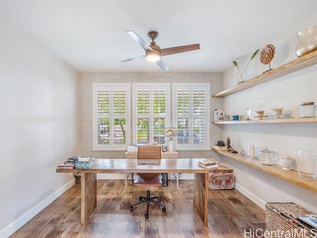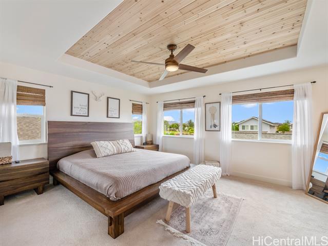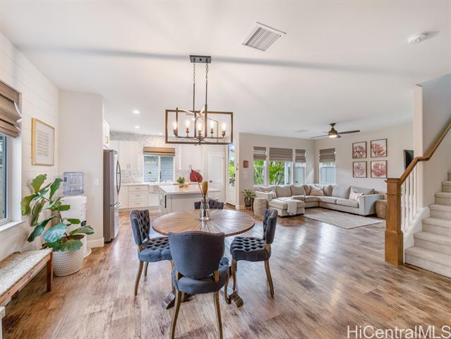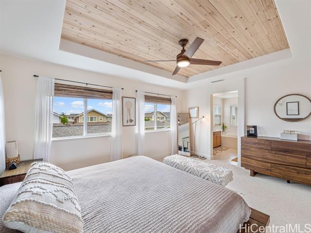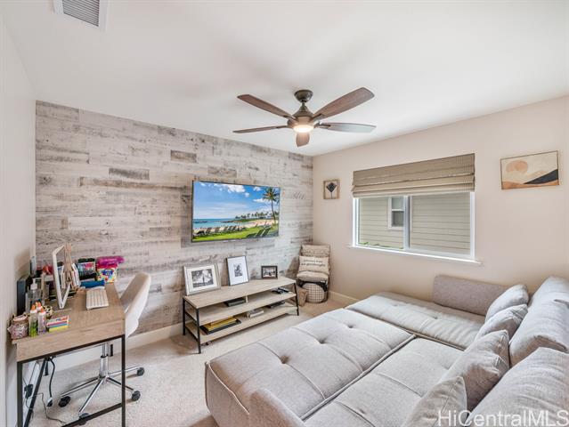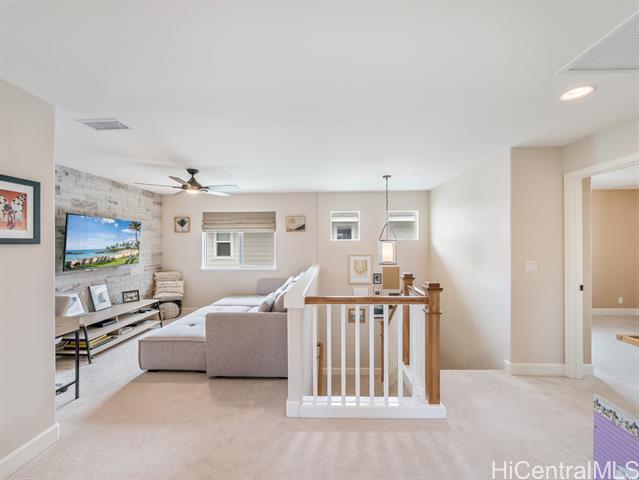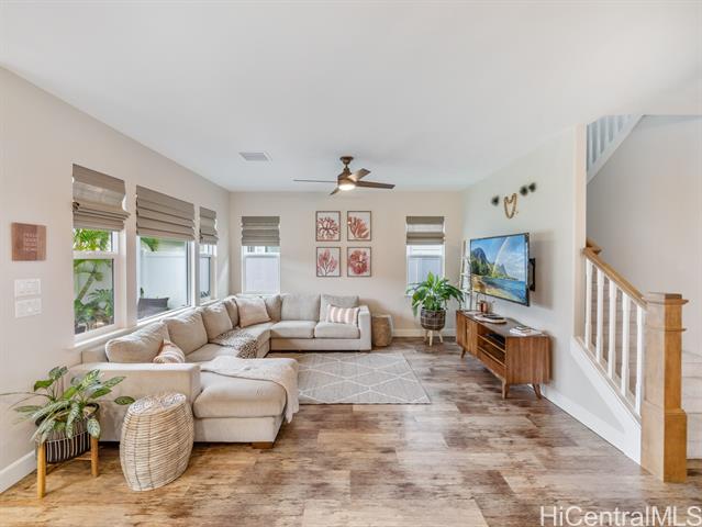 Enjoy elevated island living in this beautifully upgraded home in the desirable Kuapapa at Hoakalei community. The spacious layout includes a first floor bedroom and full bath, plus an office or study featuring neutral linen wallpaper and custom open shelving. High ceilings and an open concept floor plan design create a bright living and dining area that flows into the fully upgraded modern chef’s kitchen. Upstairs offers a spacious loft with a wood plank accent wall, a large primary suite with a designer tray ceiling, large walk-in closet and primary bathroom with a soak-in tub, two additional bedrooms, bathroom and a beautifully designed laundry room. Fenced-in landscaped backyard features a covered lanai and custom deck, perfect for relaxing and entertaining. The two car garage includes a Chamberlain smart garage system with WiFi, finished concrete flooring, built-in shelving, and wall mounted storage. HOA fees include cable/internet, access to the Wai Kai Hale Club and Kuapapa Swim Club with pool, spa, and BBQ areas. Located near the Wai Kai recreation center, beaches, golf courses, schools, restaurants, and shopping. Tenant occupied. Photos are from previous listing entry.