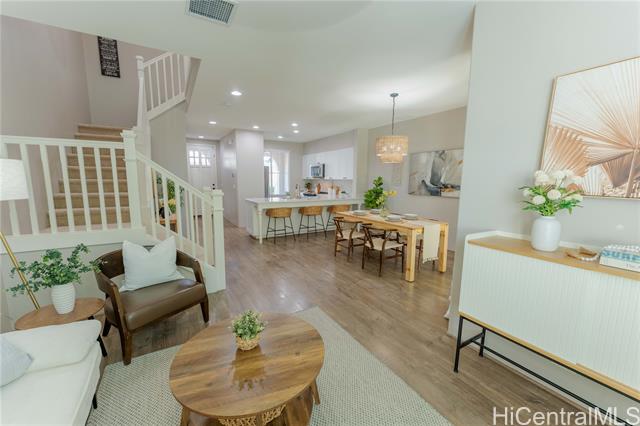 Lei Pauku is nestled in the serene Resort neighborhood of Hoakalei. This charming townhouse marvels 9 ft ceilings, laminate flooring downstairs and brand new carpet upstairs. A large window brightens the kitchen which features quartz kitchen countertops, oversized kitchen countertop for preparing food, cooking, and eating, lots of cabinets space, and stainless steel appliances. A separate laundry room that provides extra storage and half bath are situated downstairs. Upstairs includes a primary bedroom with an en-suite bath and a walk-in closet with a closet system, and 2 bedrooms on the opposite side. More additional storage in the two-car garage. Enjoy privacy with no rear neighbors and the fresh island trade winds from your lanais off both the primary and second bedroom, backyard and front courtyard. Residents of Lei Pauku have private membership to the Wai Kai Hale Club, providing access to a private beach area perfect for entertaining, relaxing, paddleboarding, kayaking, or simply enjoying the lagoon. On Thursday evenings join the community for the popular Farmers Market, come and be a part of this wonderful community in Hoakalei!