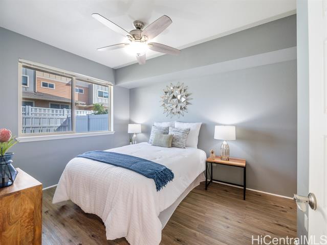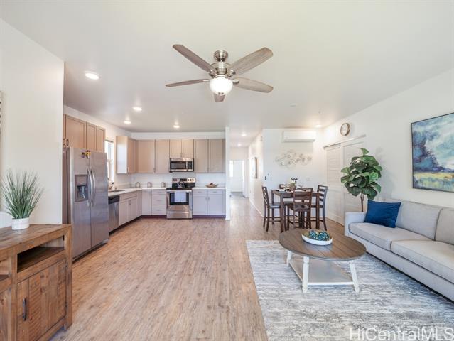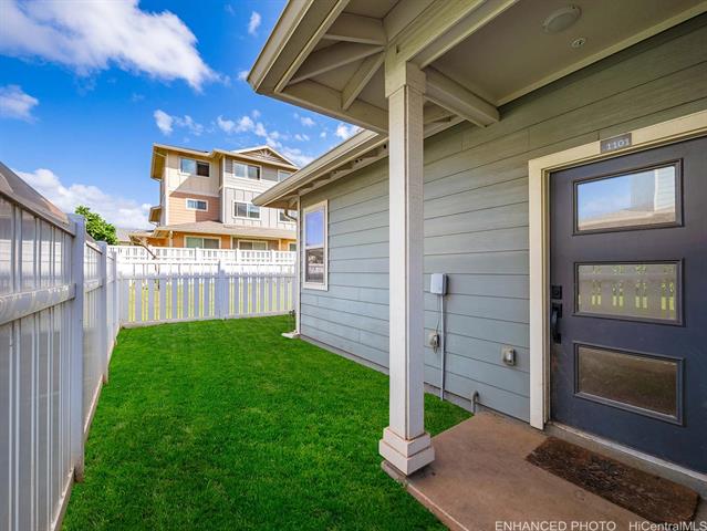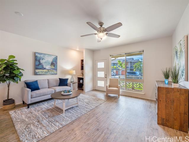 VA assumable loan, 3% rate and small gap! Welcome to this charming 2-bedroom 2-bath single level townhome nestled in a vibrant community of Ho'opili. The open floor plan seamlessly connects the living room, dining, and kitchen areas providing an ideal layout for both relaxation and entertaining. The well appointed kitchen features modern appliances, plenty of counter space and ample storage making meal preparation a breeze. Retreat to the spacious primary bedroom complete with a private en-suite bathroom and walk-in closet for added convenience and privacy. The second bedroom offers flexibility for guests, a home office, or whatever suits your lifestyle needs. Outside, you will find your own private fenced in yard, a perfect place for your furry friend or fun kids play space. All this just minutes away from all conveniences such as a rail, UH West campus, Ka Makana Ali’i mall, stores, restaurants, beach and so much more. Come see it today!